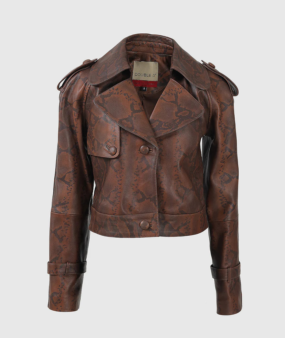 The Audax jacket is an oversized cropped leather jacket made from embossed croc leather with shoulder pads for an extra bold and cool look. Featuring front fastening with matching covered buttons.
