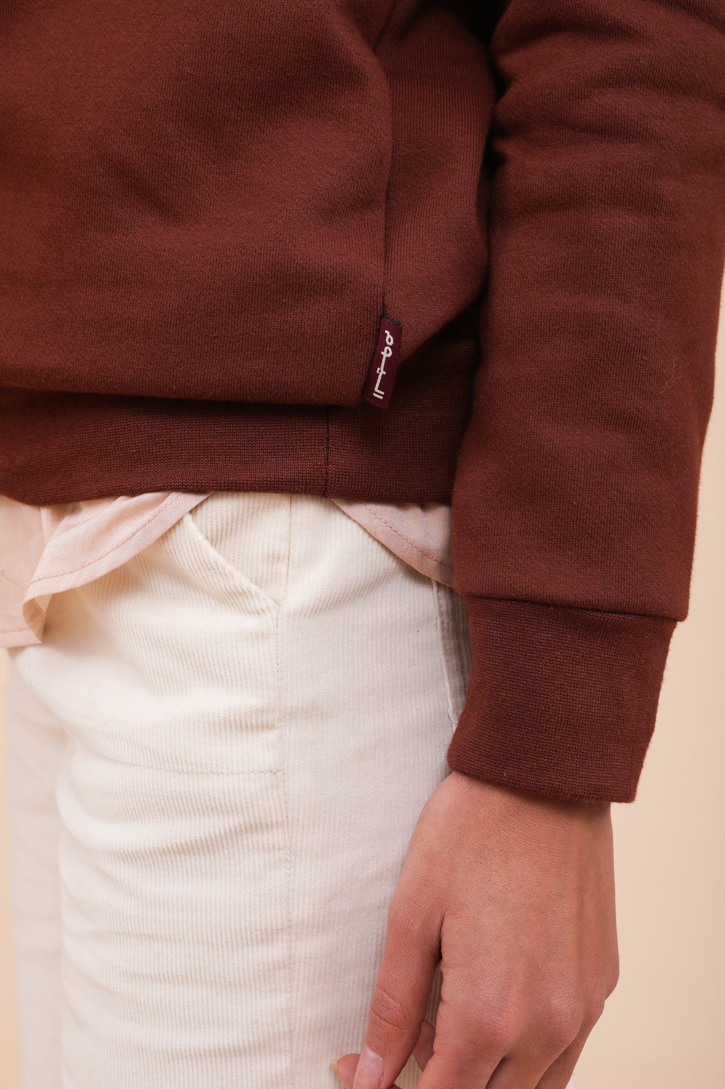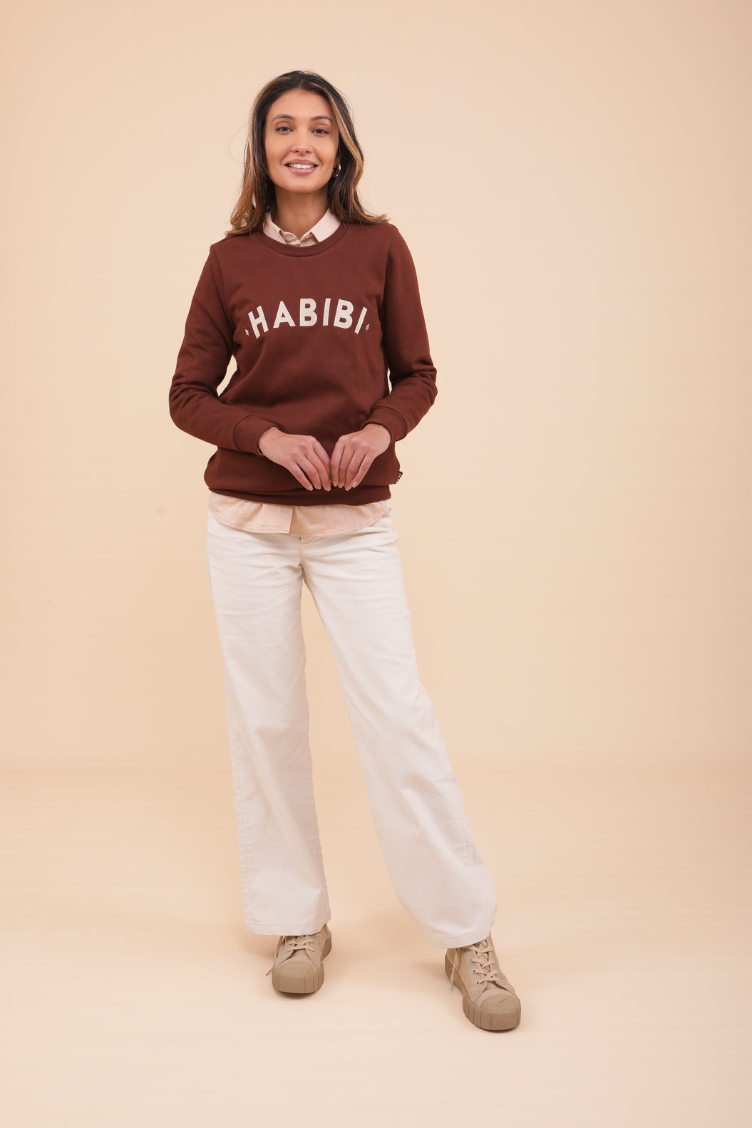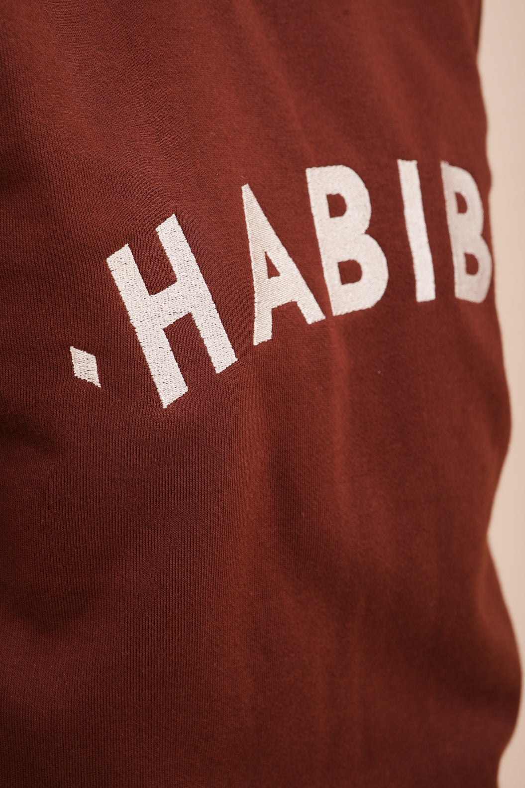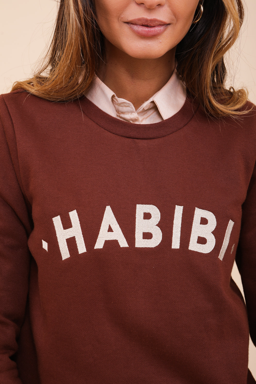 Brushed, thick fleece for ultimate softness. This crew-neck sweatshirt in a rich burgundy features long sleeves and an iconic Habibi (My Love in Arabic) embroidered message on the front for a heartfelt touch.