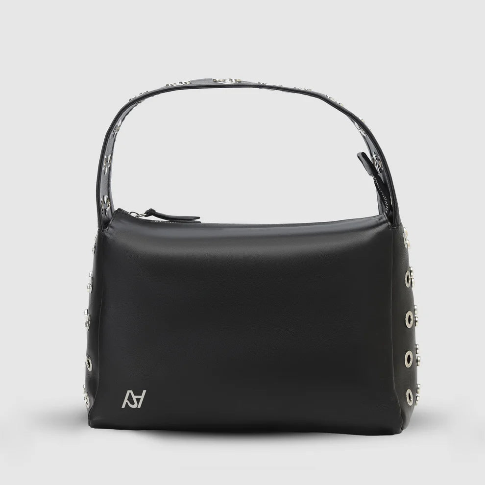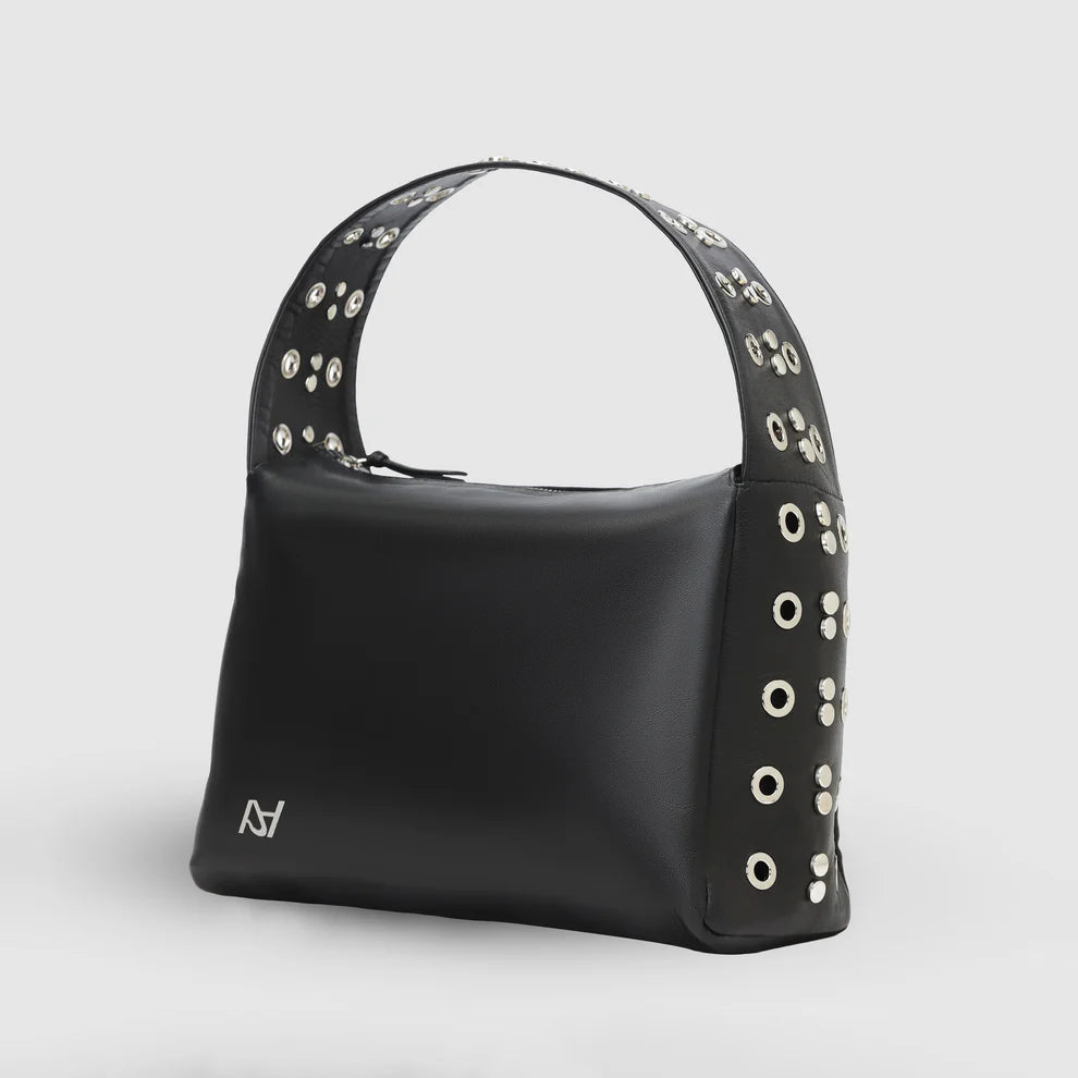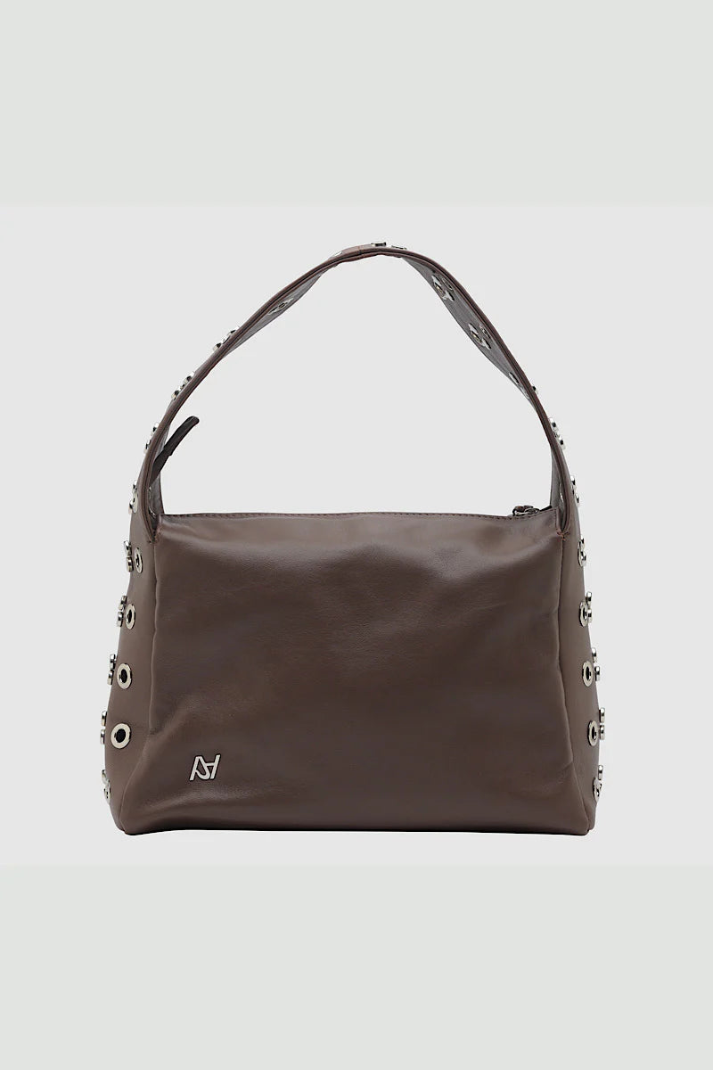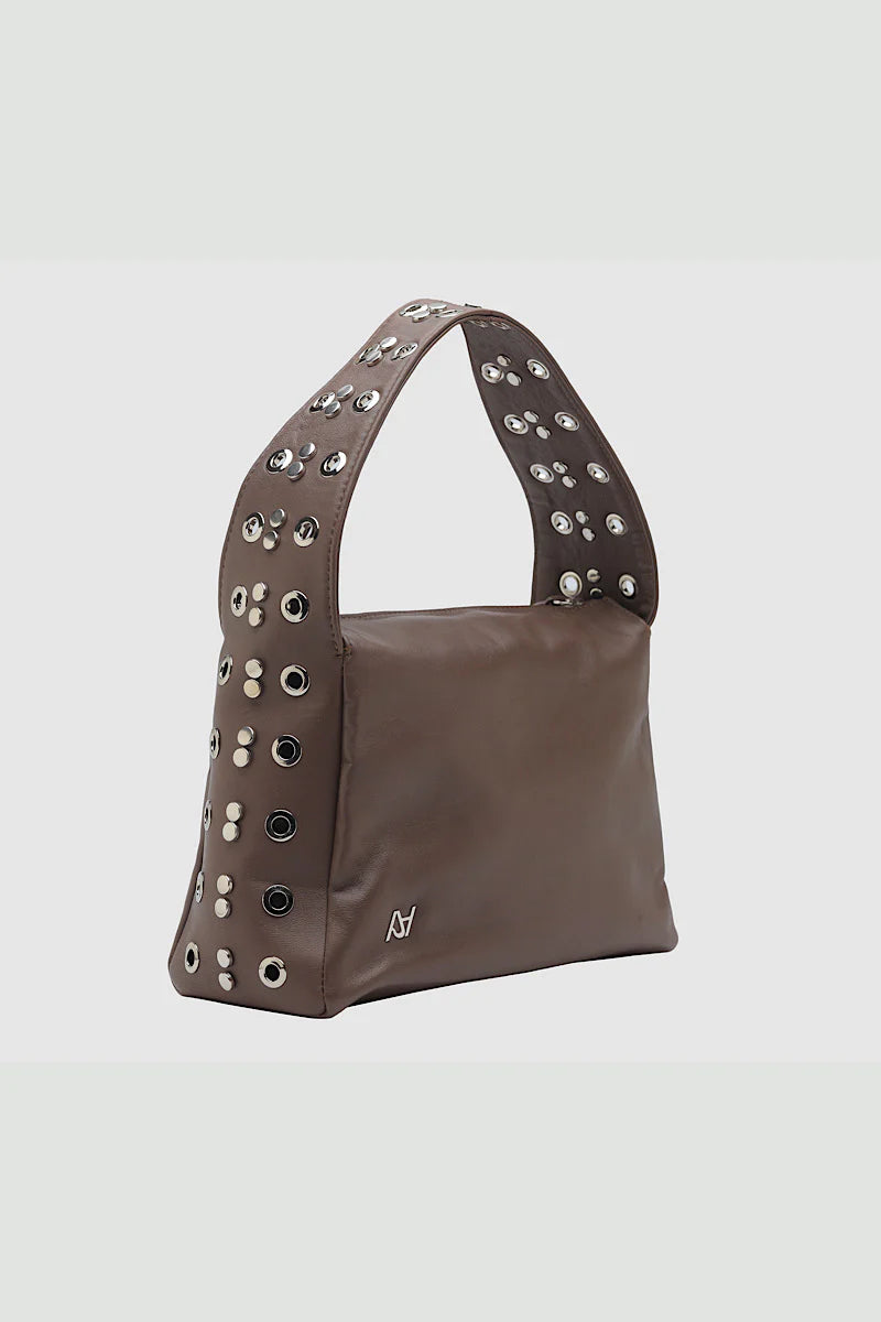 Leather shoulder bag featuring studs and eyelets on the handle. Available in red, brown and black.