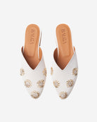 Crafted with the finest clear beige satin, these shoes are adorned with delicate yet intricate embroidery. The embroidery takes on the form of petite suns, hand–stitched with shimmering gold and silver beads that gleam like celestial orbs. With each step you take in “Soleil,” you’ll be dancing through a sunlit dreamscape, leaving a trail of glistening stardust in your wake. These shoes are more than footwear; they are a radiant statement of elegance and style, perfect for those who desire to shine like the sun itself.