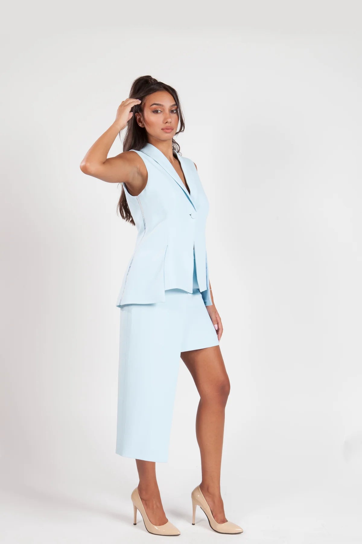 Redefine classic tailoring with our light blue asymmetric skirt, designed to make a subtle yet striking statement. The sleek mini silhouette is contrasted with a dramatic draped panel that adds movement and edge to your look.