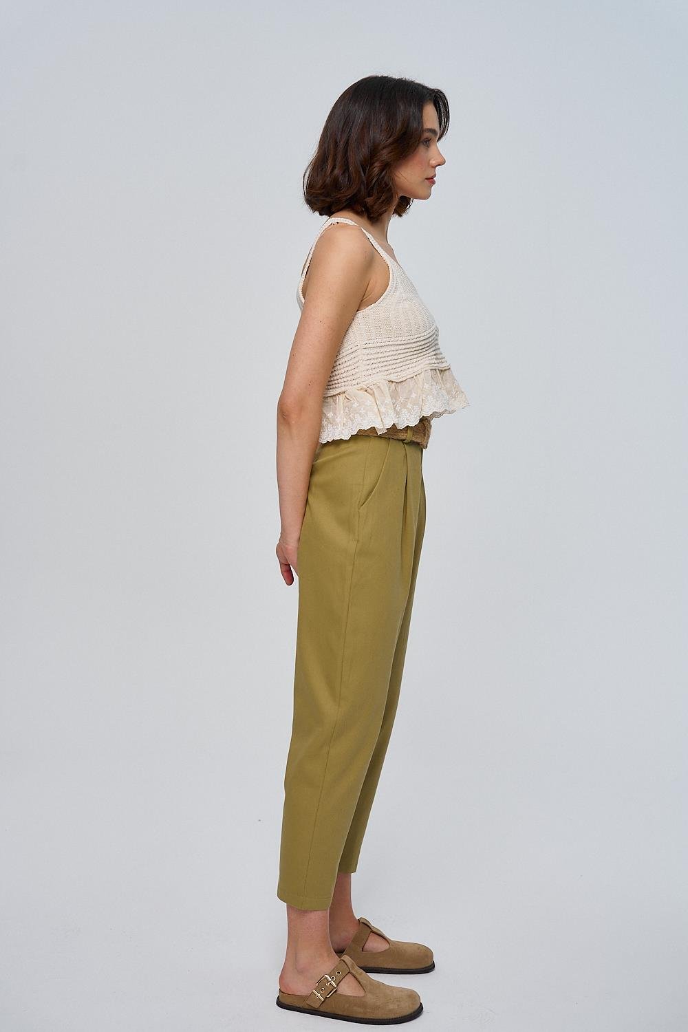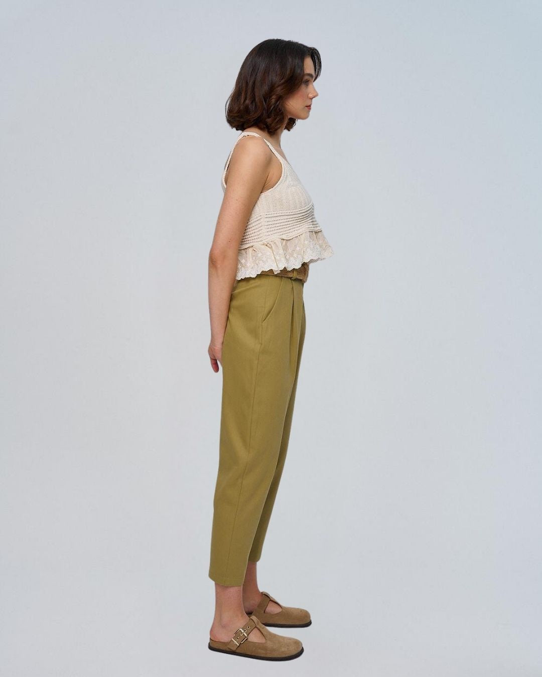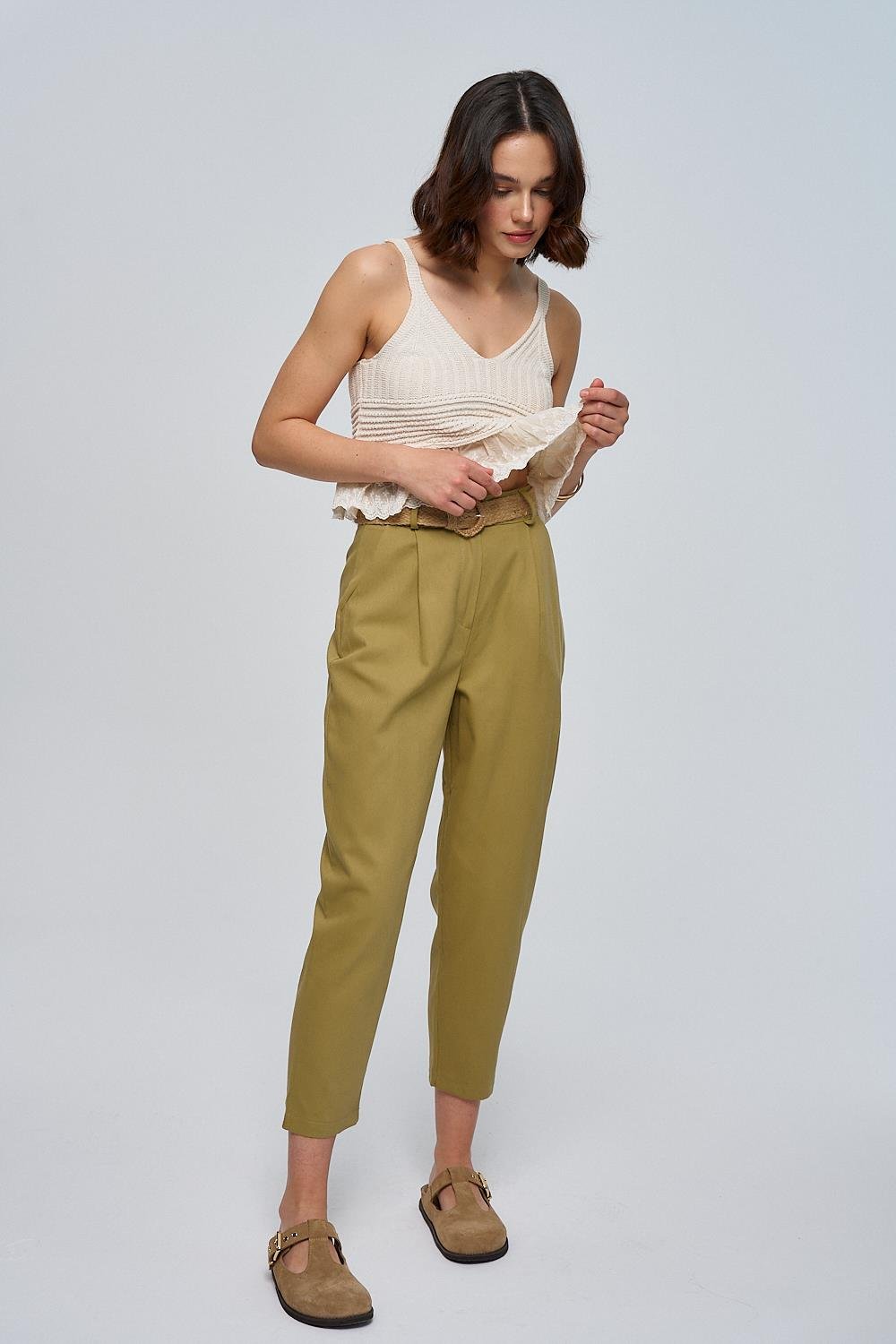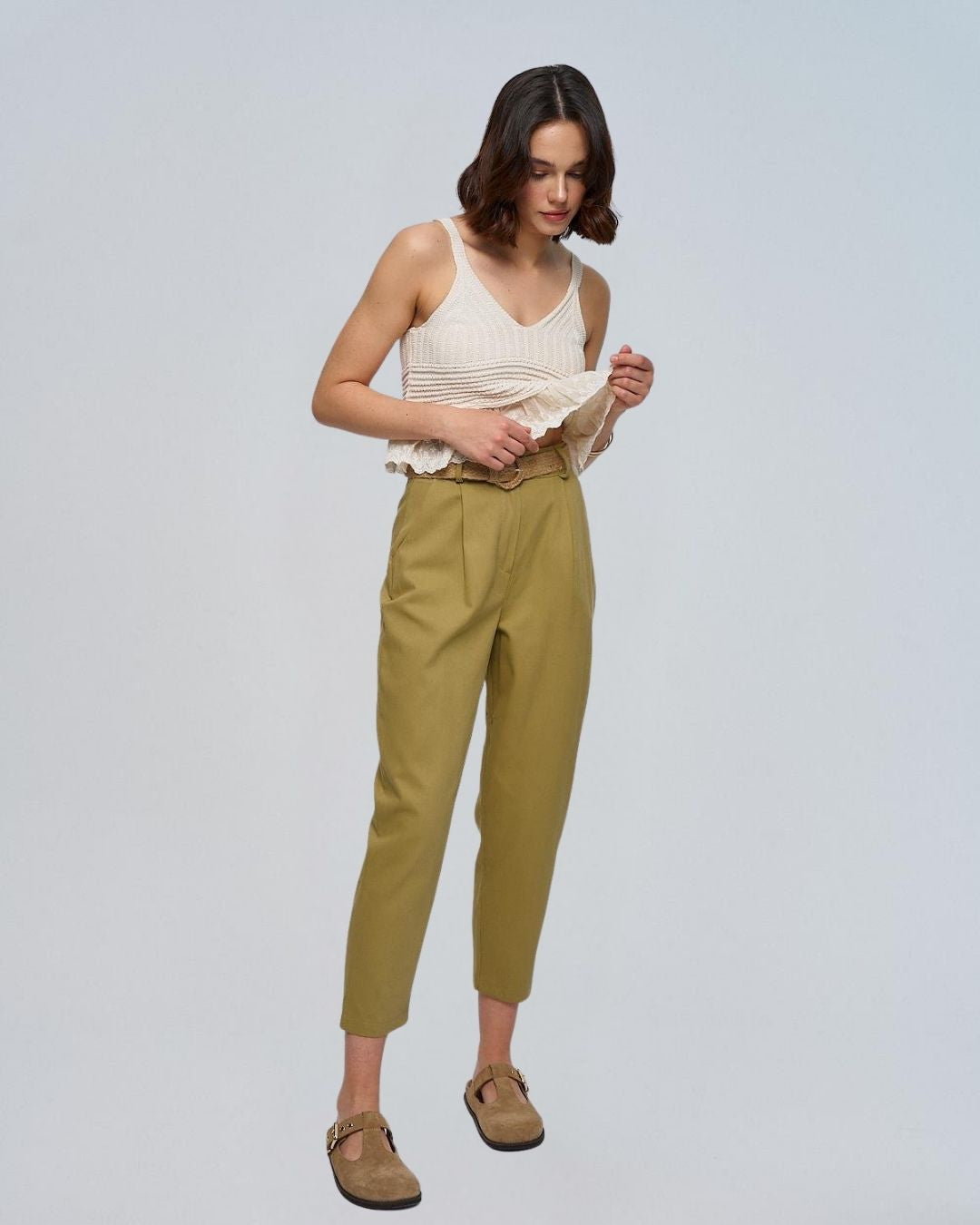 Product Information: High waist, zipper closure, belt, pockets, pleated, cotton, carrot model, full fit, straight cut.