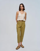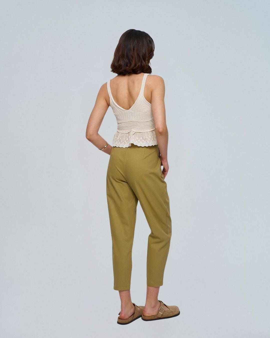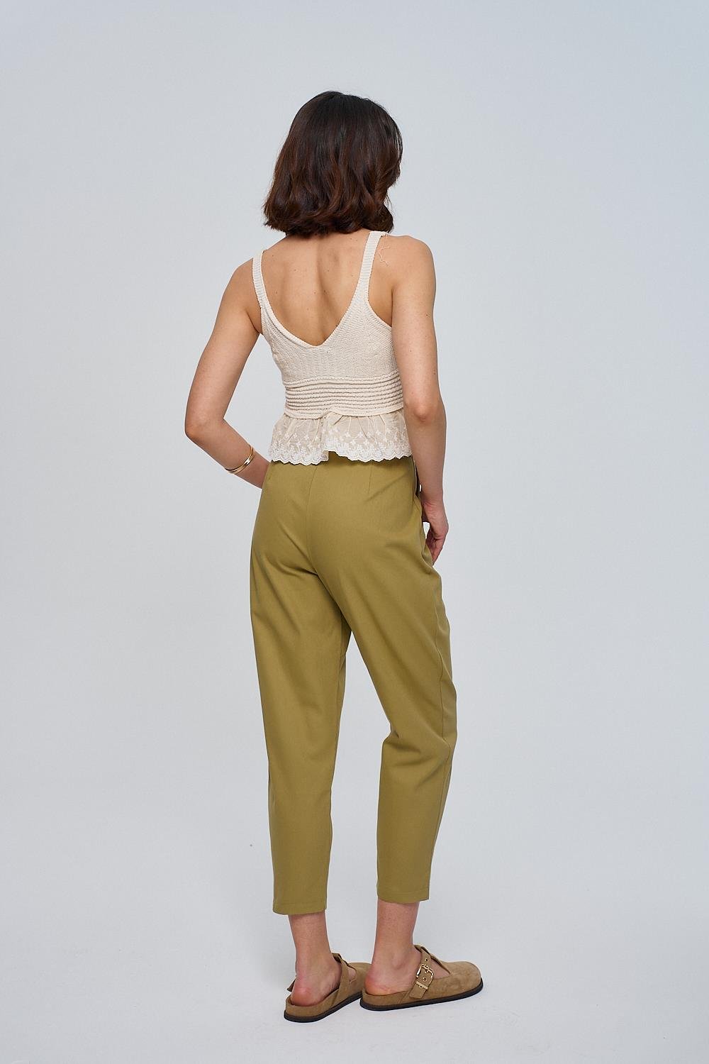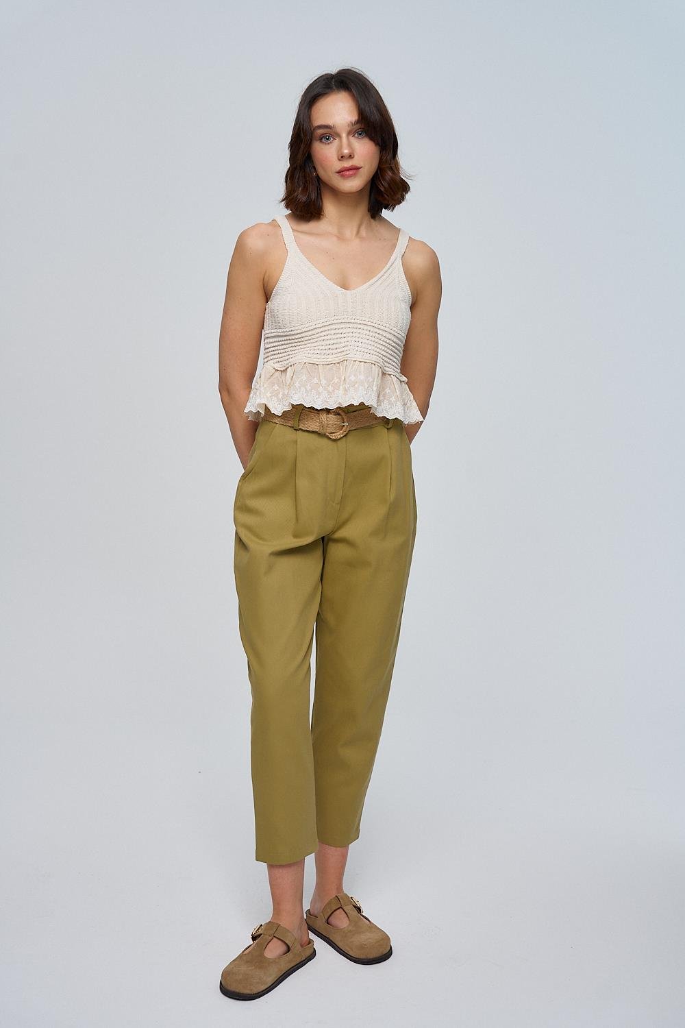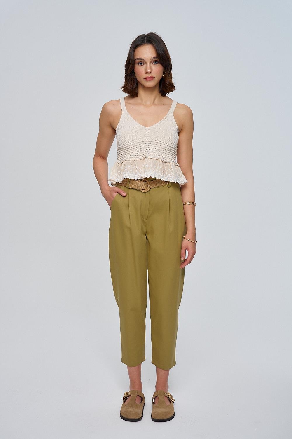 Product Information: High waist, zipper closure, belt, pockets, pleated, cotton, carrot model, full fit, straight cut.