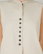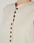 A sleeveless vest with a relaxed tailored fit and gentle drape. Detailed with a curved hem, brown buttons, and fine vertical pinstripes. Perfect for hot days in the city.