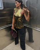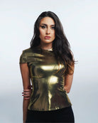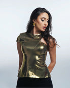 Shine brighter than ever with this exquisite gold metallic top, designed for those who love to stand out. Crafted from shimmering lurex fabric, this top catches the light from every angle, giving you a radiant, show–stopping look. Its luxurious texture hugs your silhouette with a perfect balance of elegance and boldness.