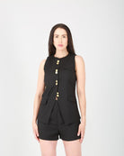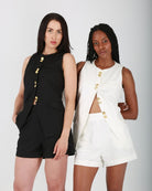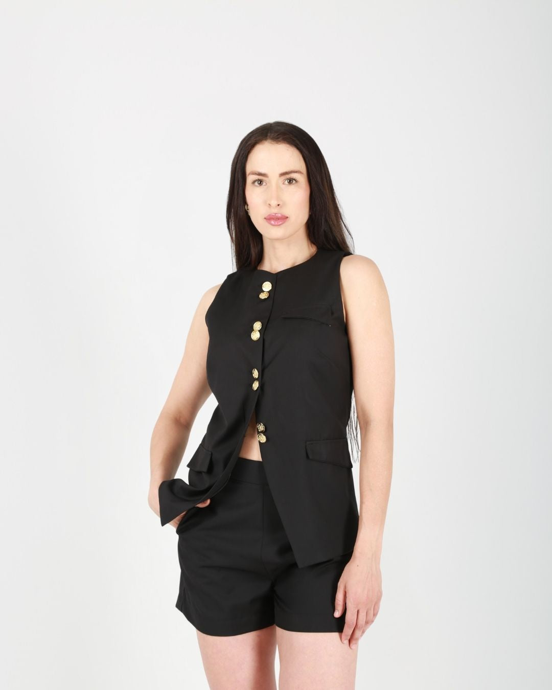 The perfect slim fit jacket, front with three illusion pockets, and 8 gold buttons. Matched with a mini short, lightweight fabric, concealed side seam–zip closure.