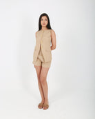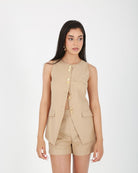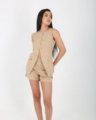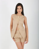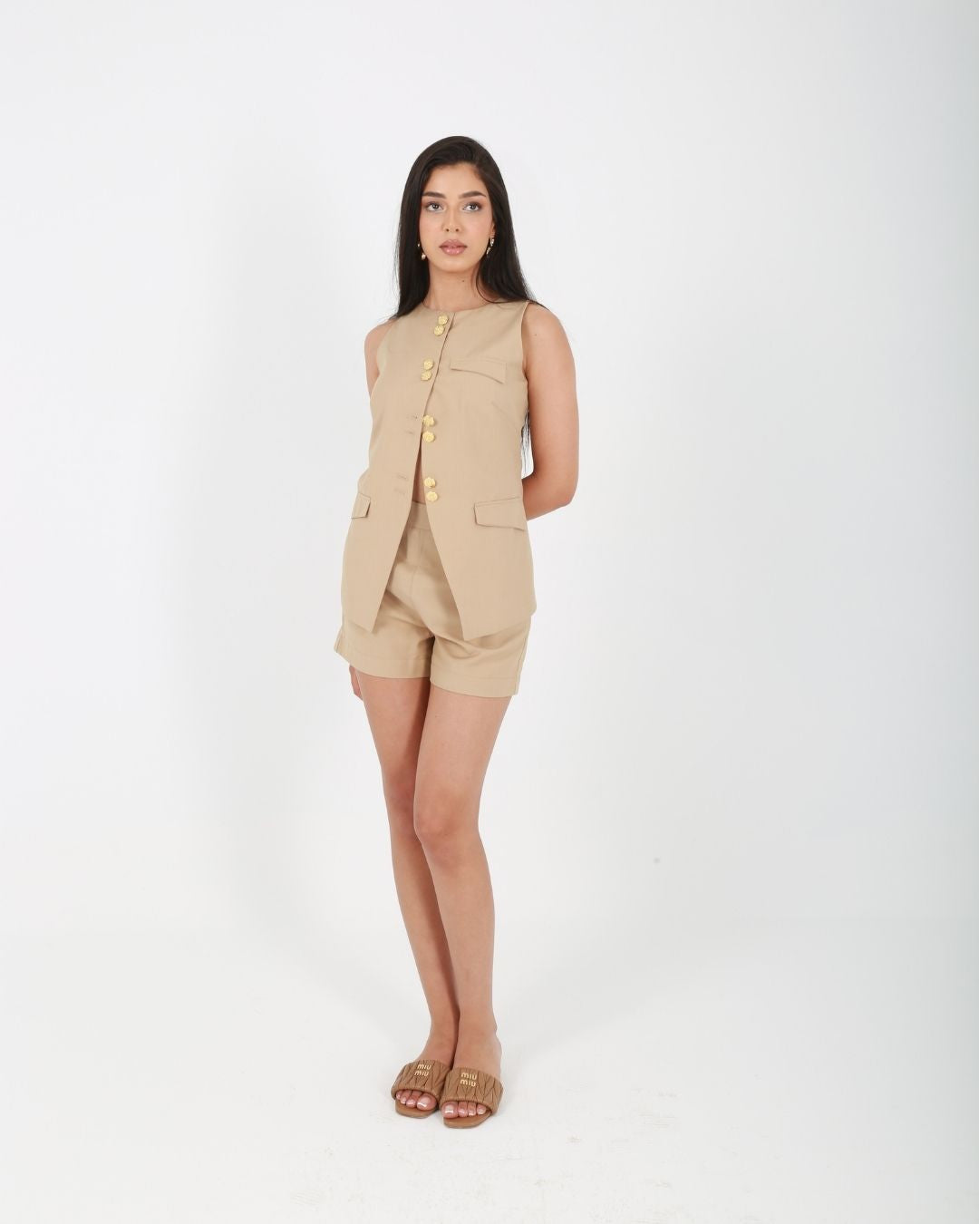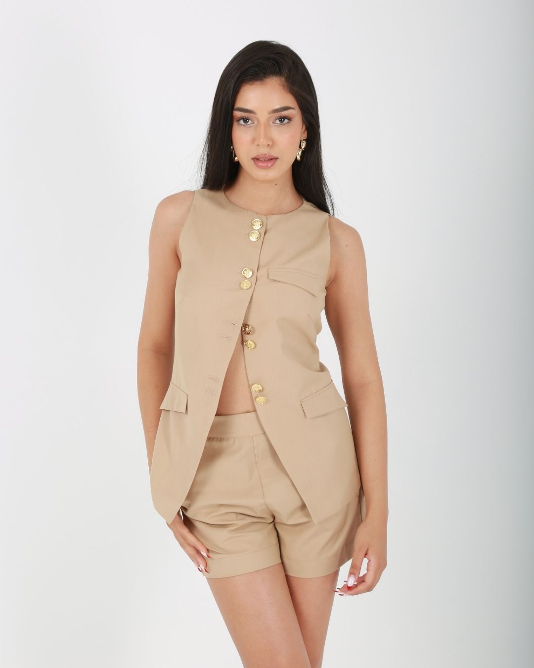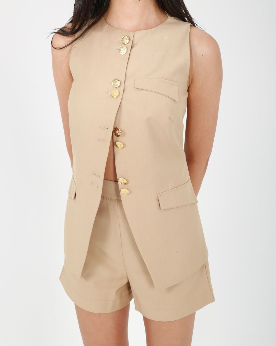 The perfect slim fit jacket, front with three illusion pockets, and 8 gold buttons. Matched with a mini short, lightweight fabric, concealed side seam–zip closure.