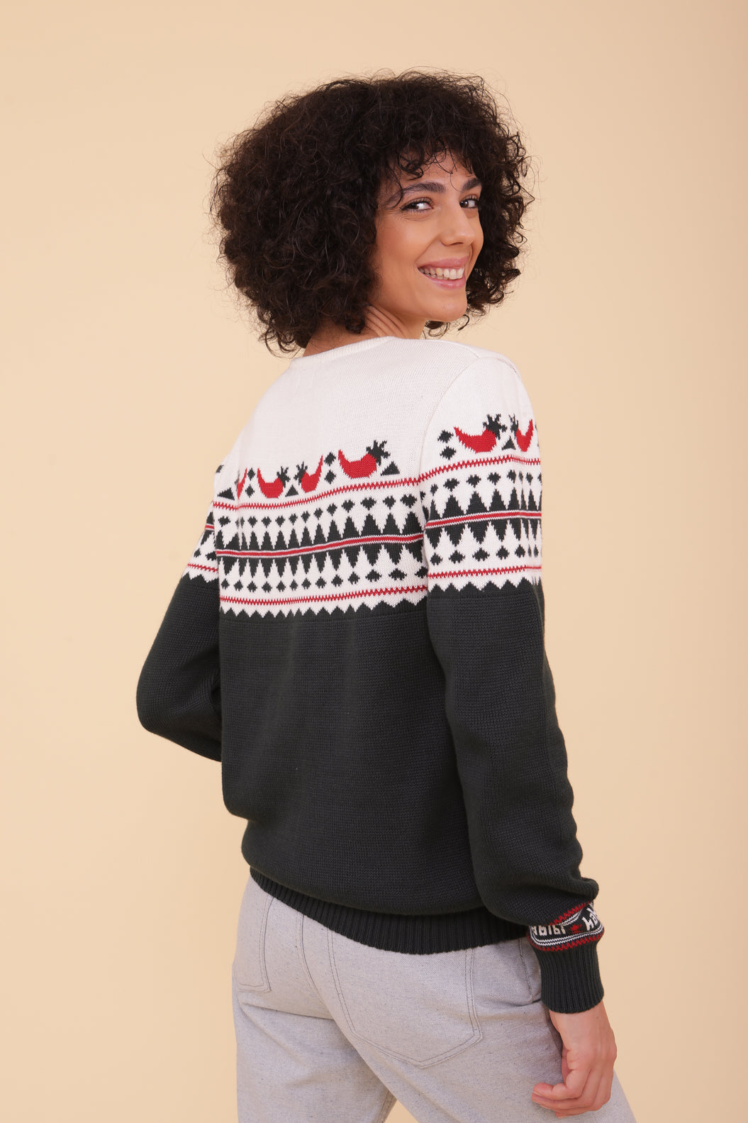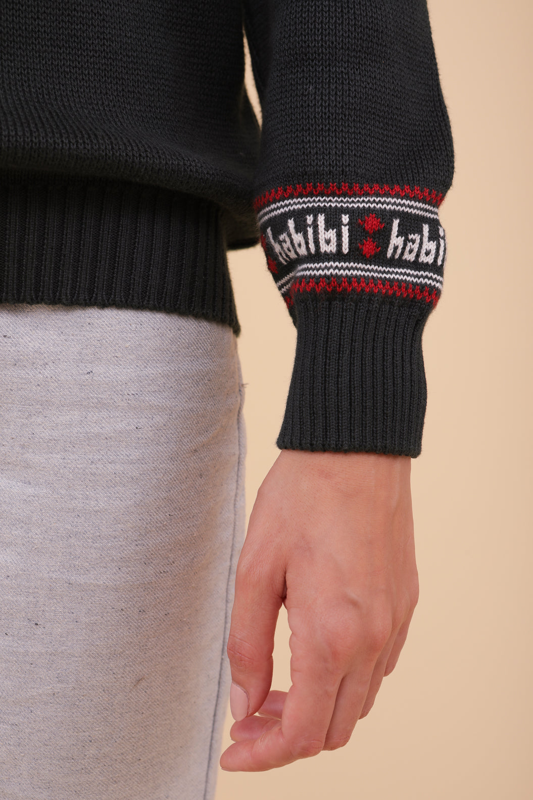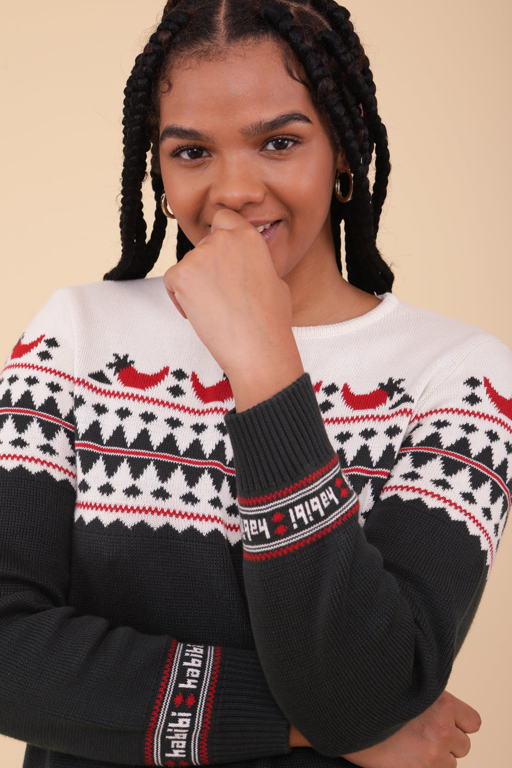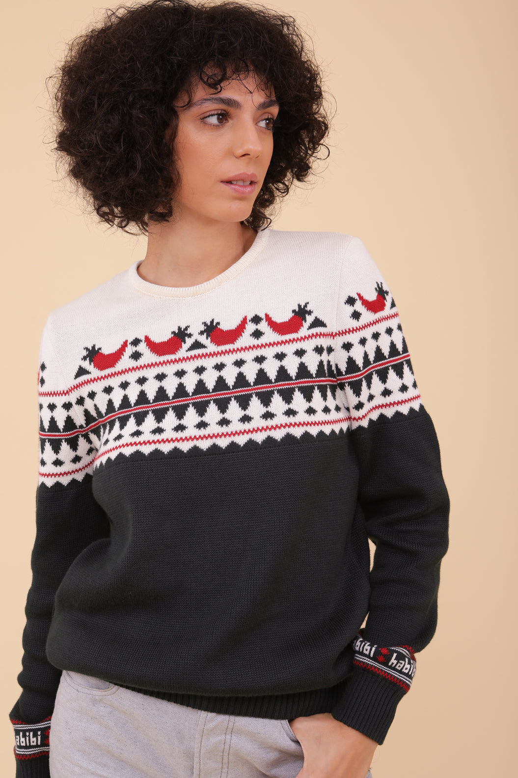With LYOUM, winter is spicier than ever! This new jacquard sweater blends the classic English X'mas Jumper with South Mediterranean vibes. Featuring a bold chili pepper pattern design, it has a cozy crew neck and a pine green base accented with off-white and red patterns for a festive, spicy touch.