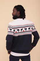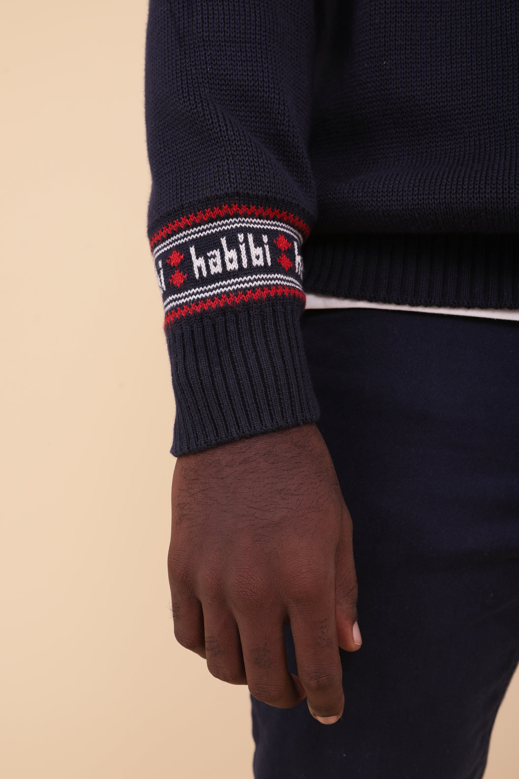 A warm and soft jacquard sweater in the classic English "Xmas jumper" style, infused with LYOUM's Mediterranean vibes. Featuring exclusive new camel patterns, this navy base sweater is adorned with off-white and red designs, finished with a cozy crew neck for the perfect festive look.