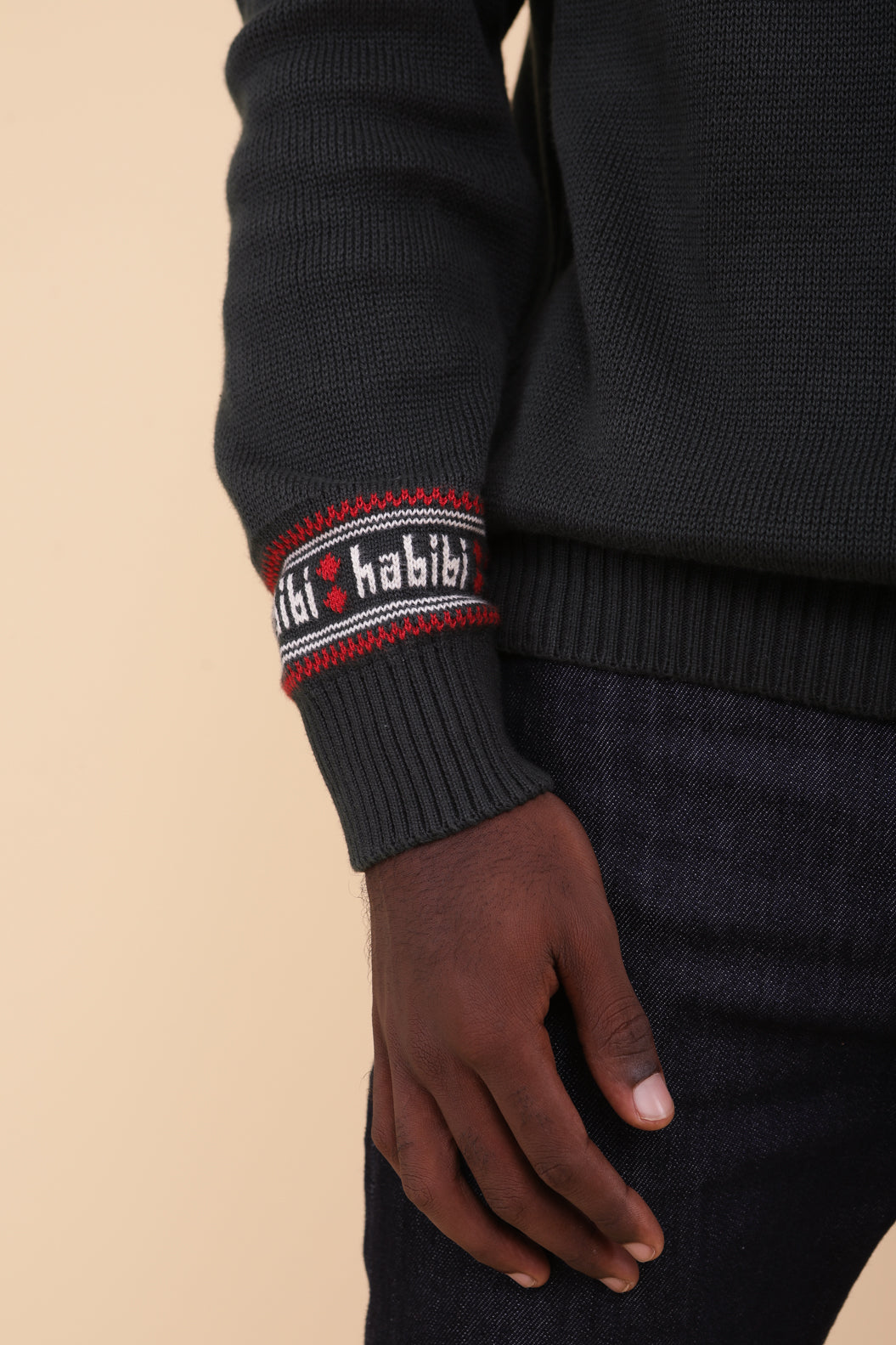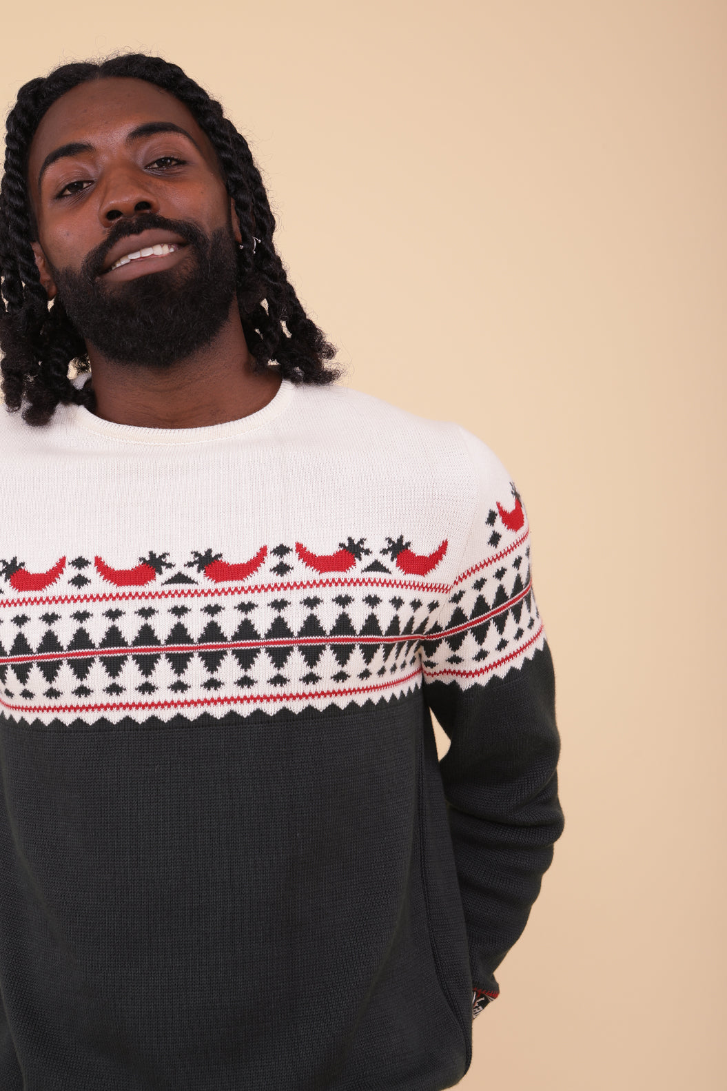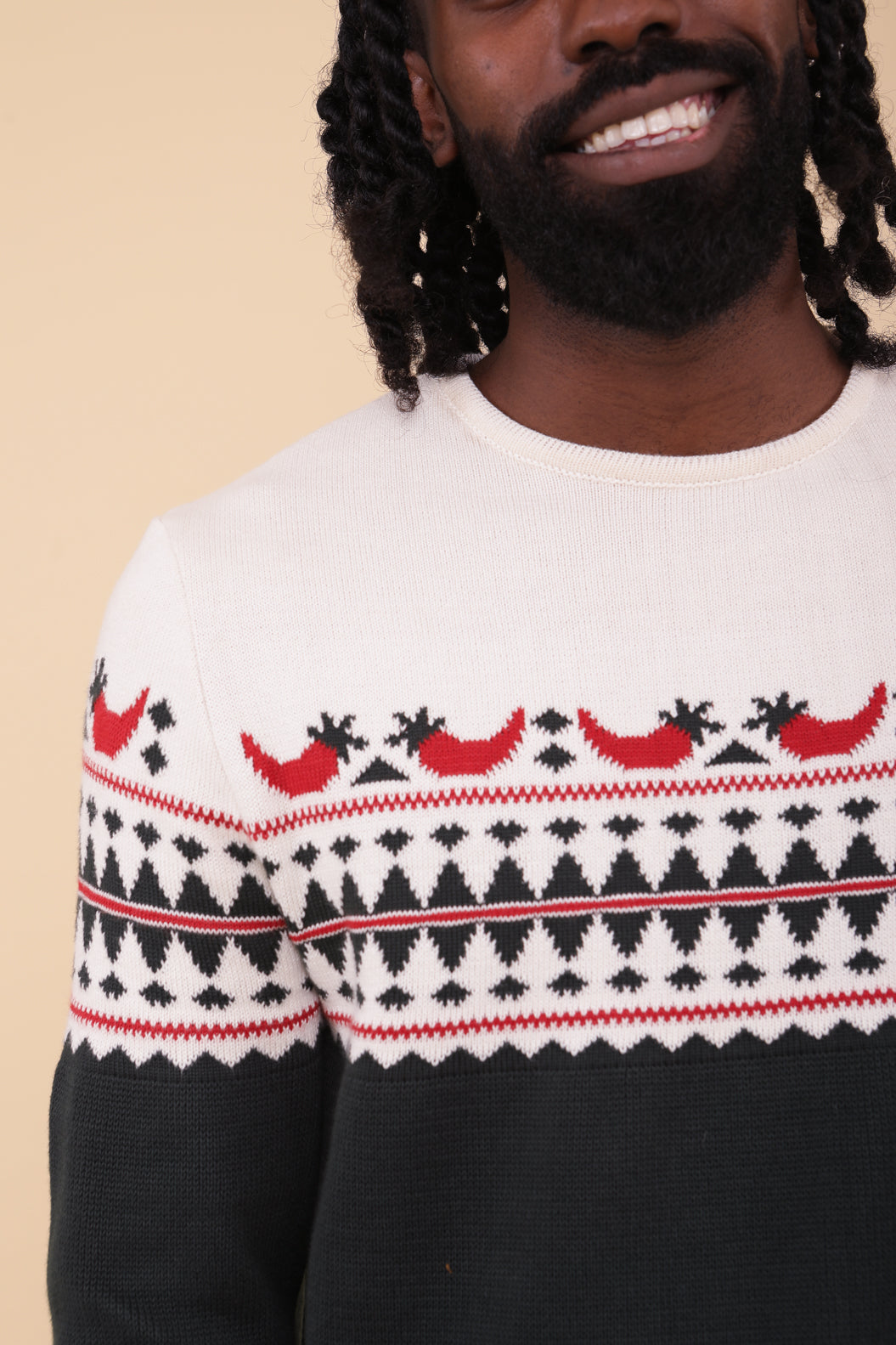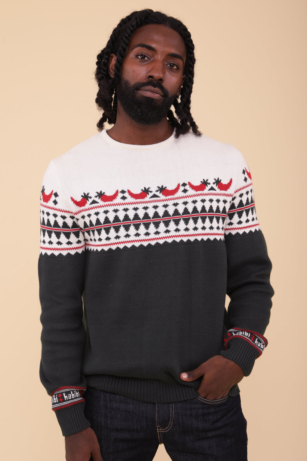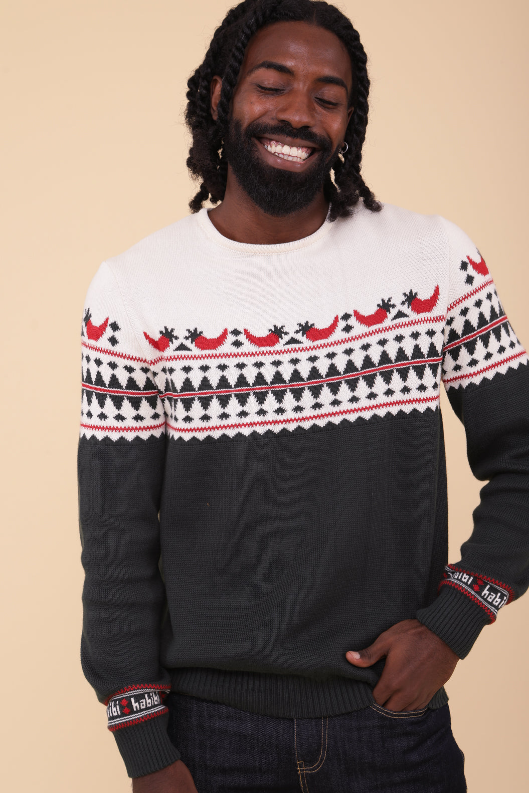 This new jacquard sweater blends the classic English "Xmas jumper" with South Mediterranean vibes. Featuring a bold chili pepper pattern design, it has a cozy crew neck and a pine green base accented with off-white and red patterns for a festive, spicy touch.