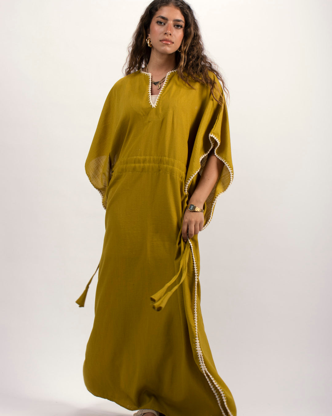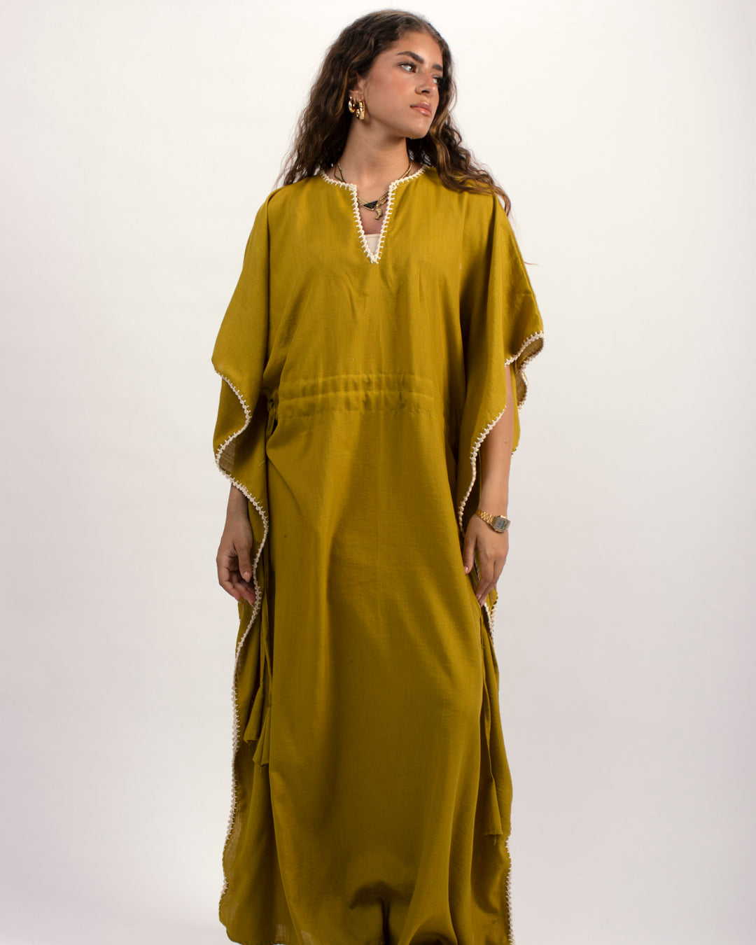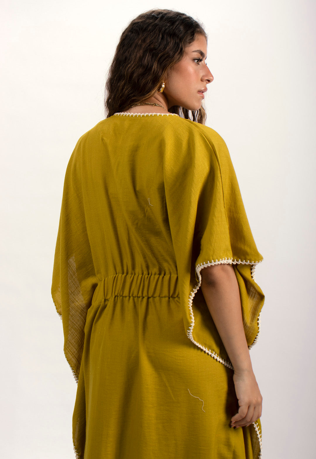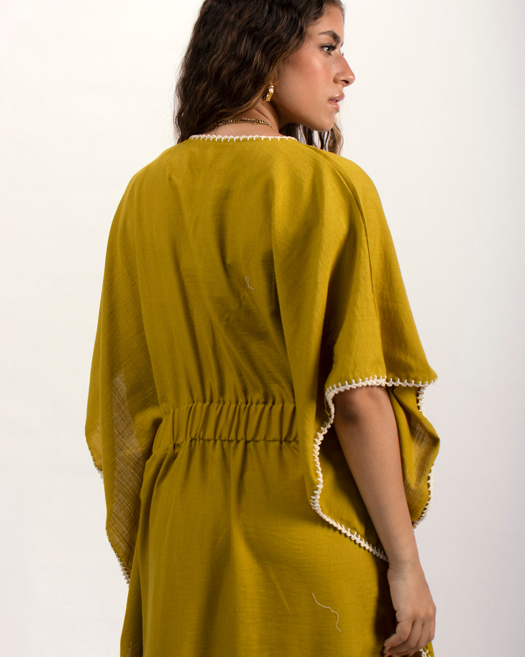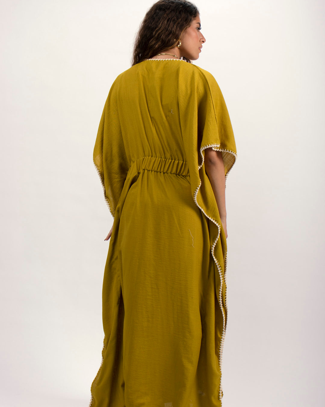 Linen kaftan detailed with handmade trims. Comes with a drawstring by the waist to adjust the tightness. Available in white, black and kiwi.