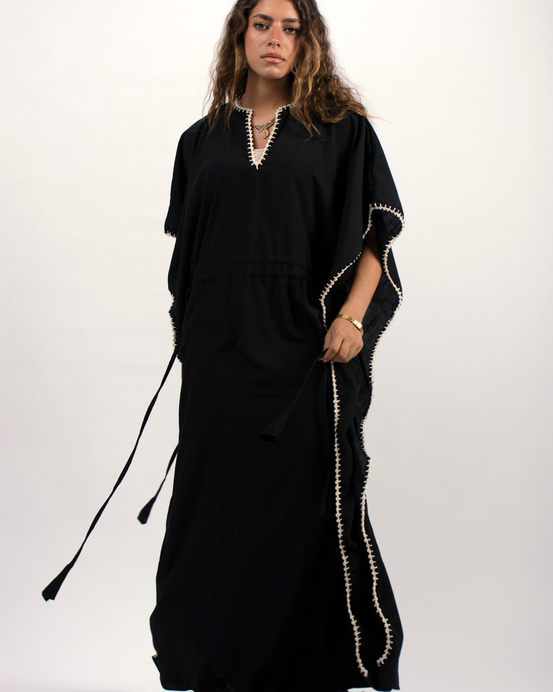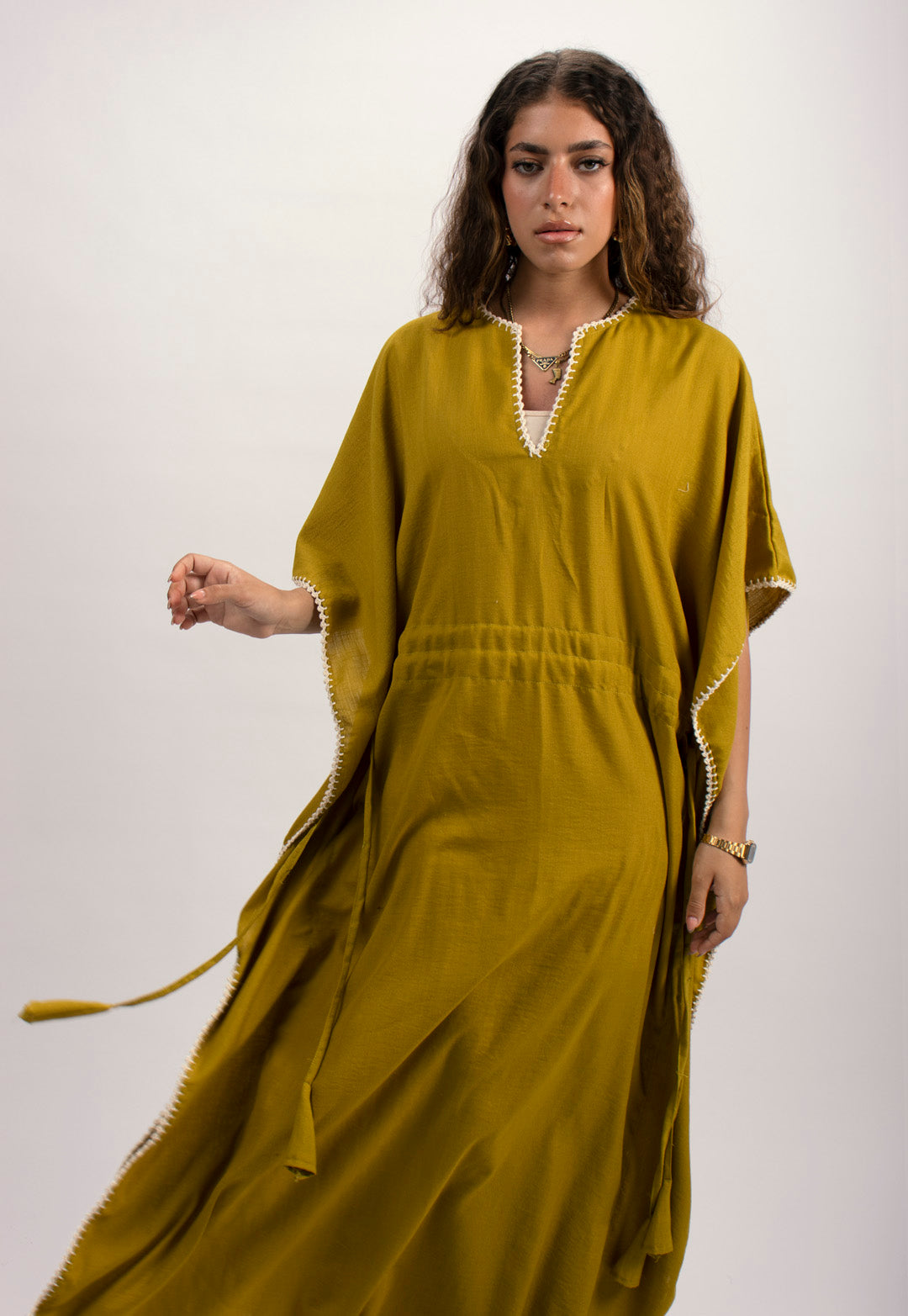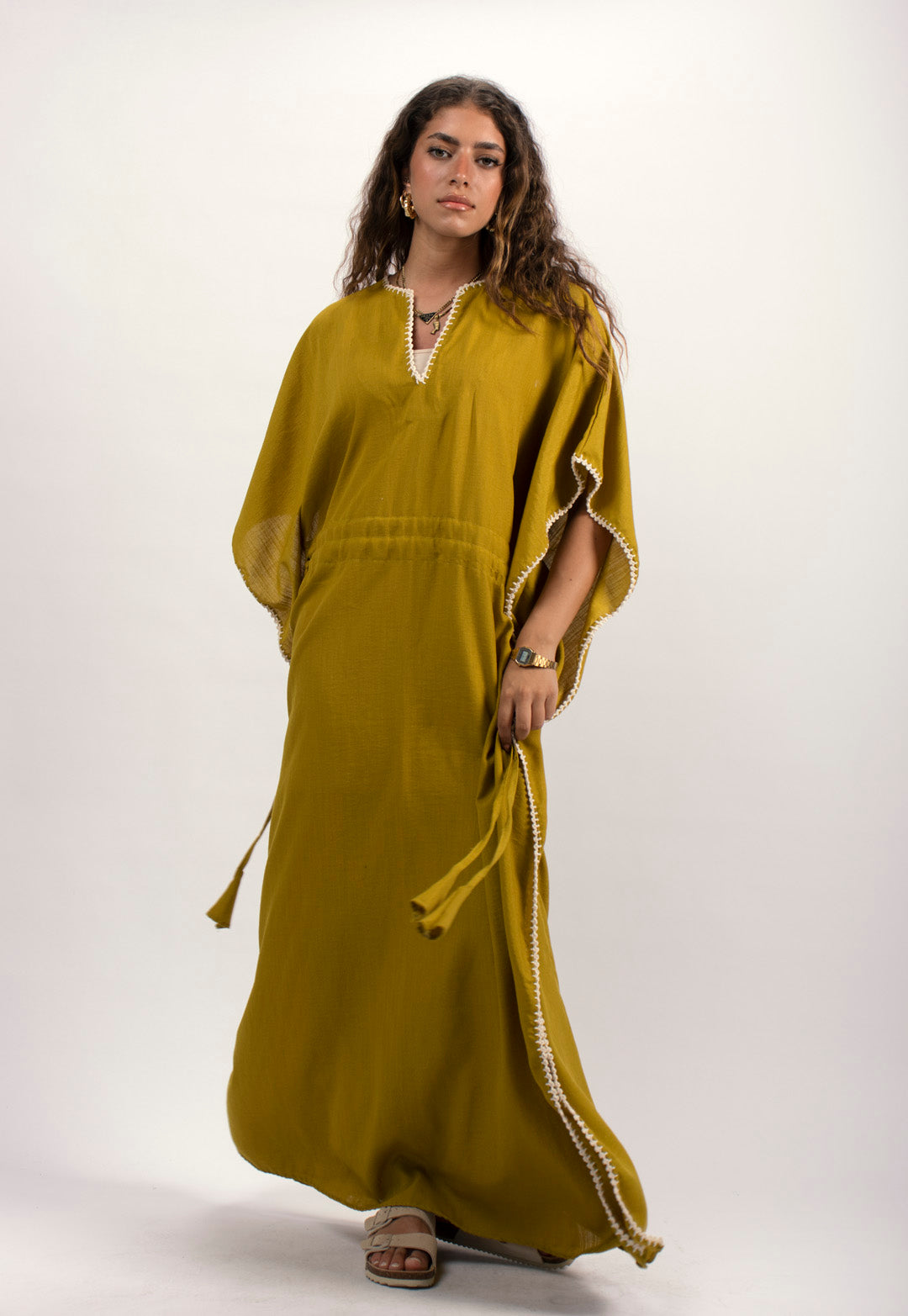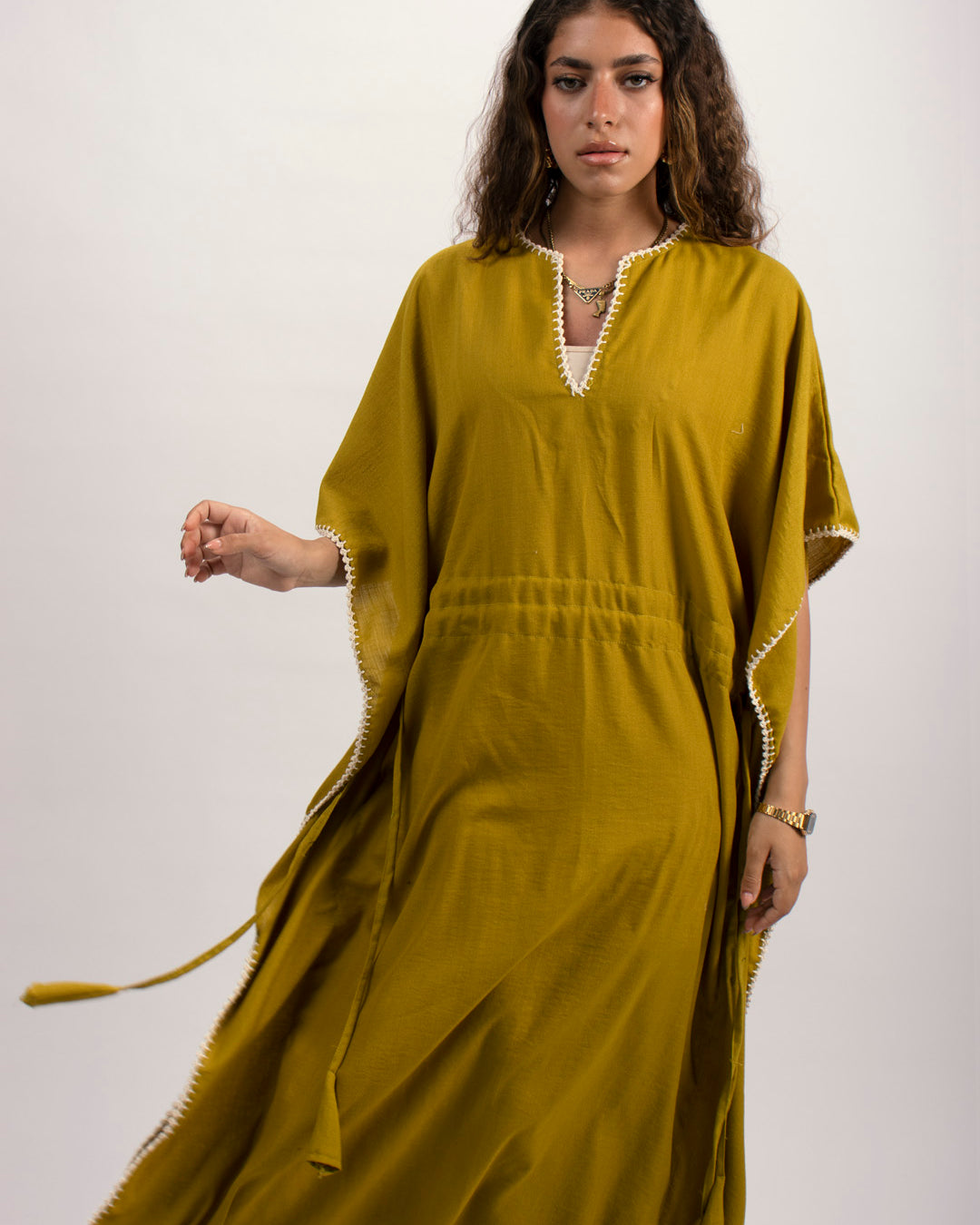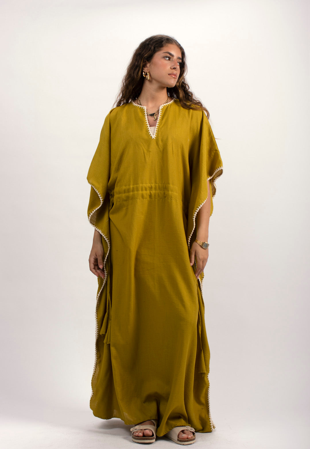 Linen kaftan detailed with handmade trims. Comes with a drawstring by the waist to adjust the tightness. Available in white, black and kiwi.