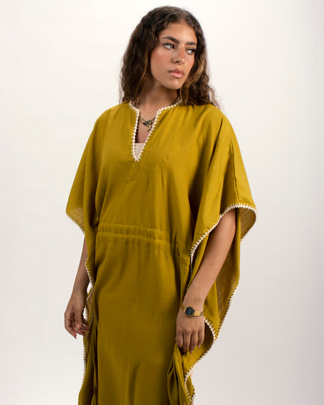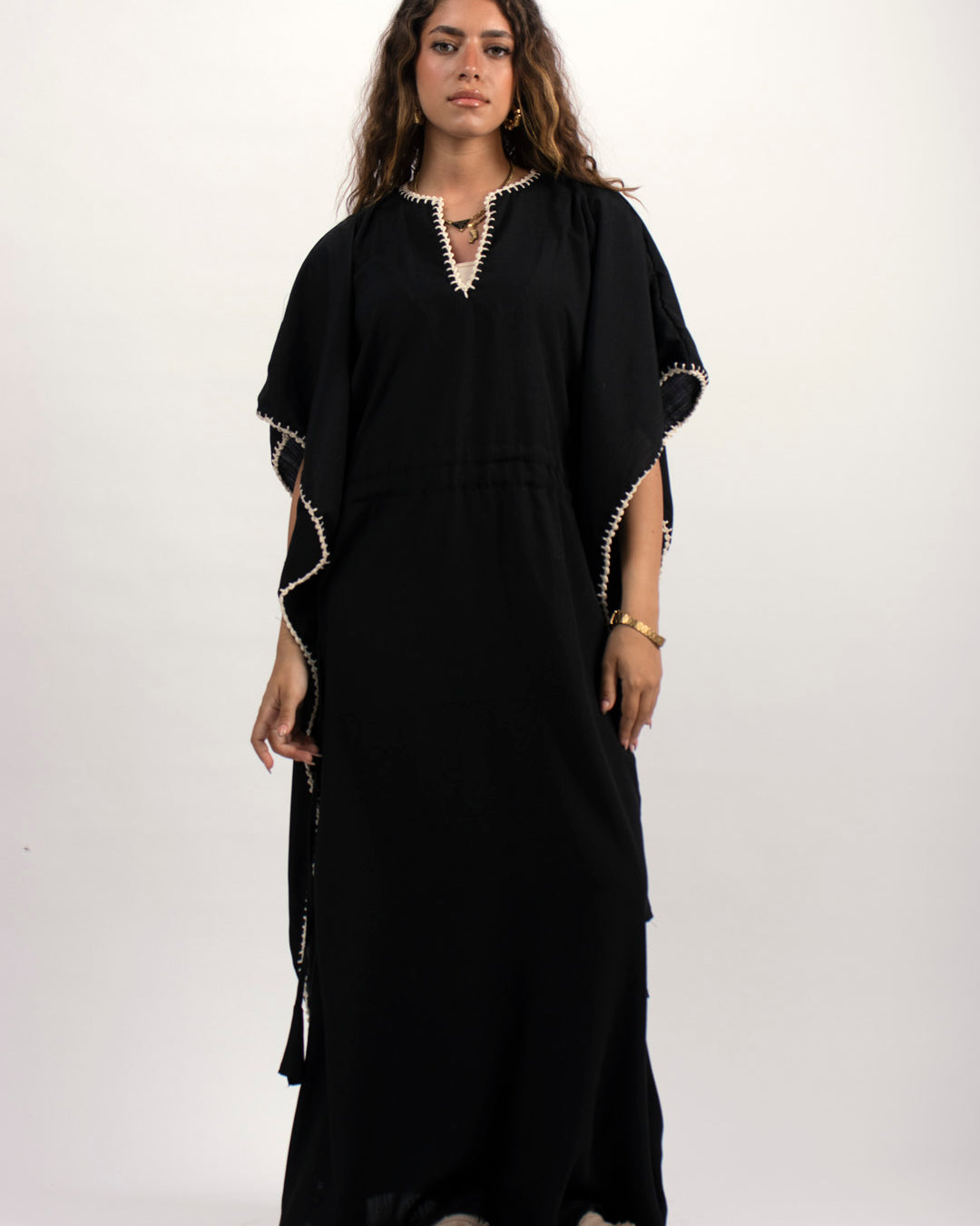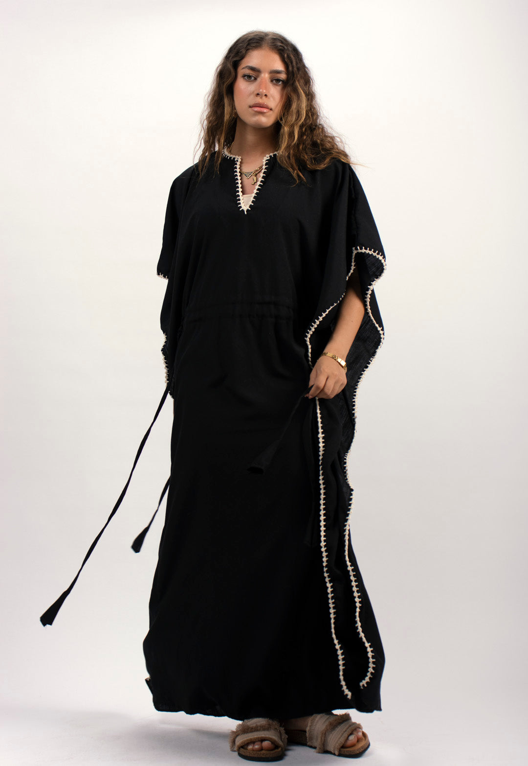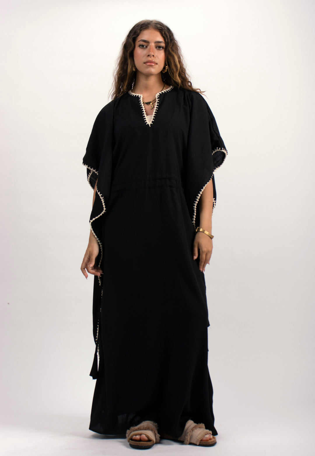Linen kaftan detailed with handmade trims. Comes with a drawstring by the waist to adjust the tightness. Available in white, black and kiwi.