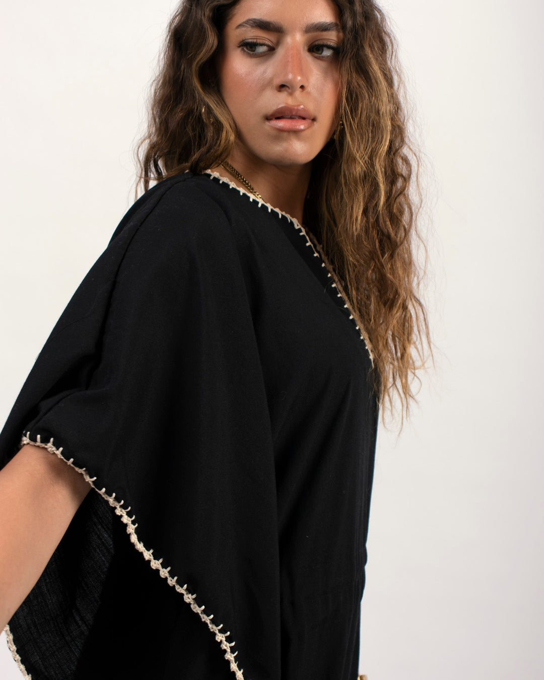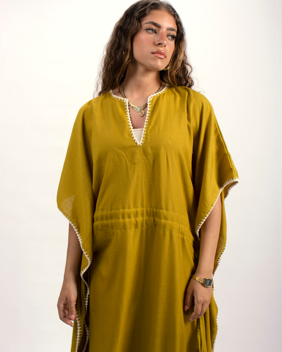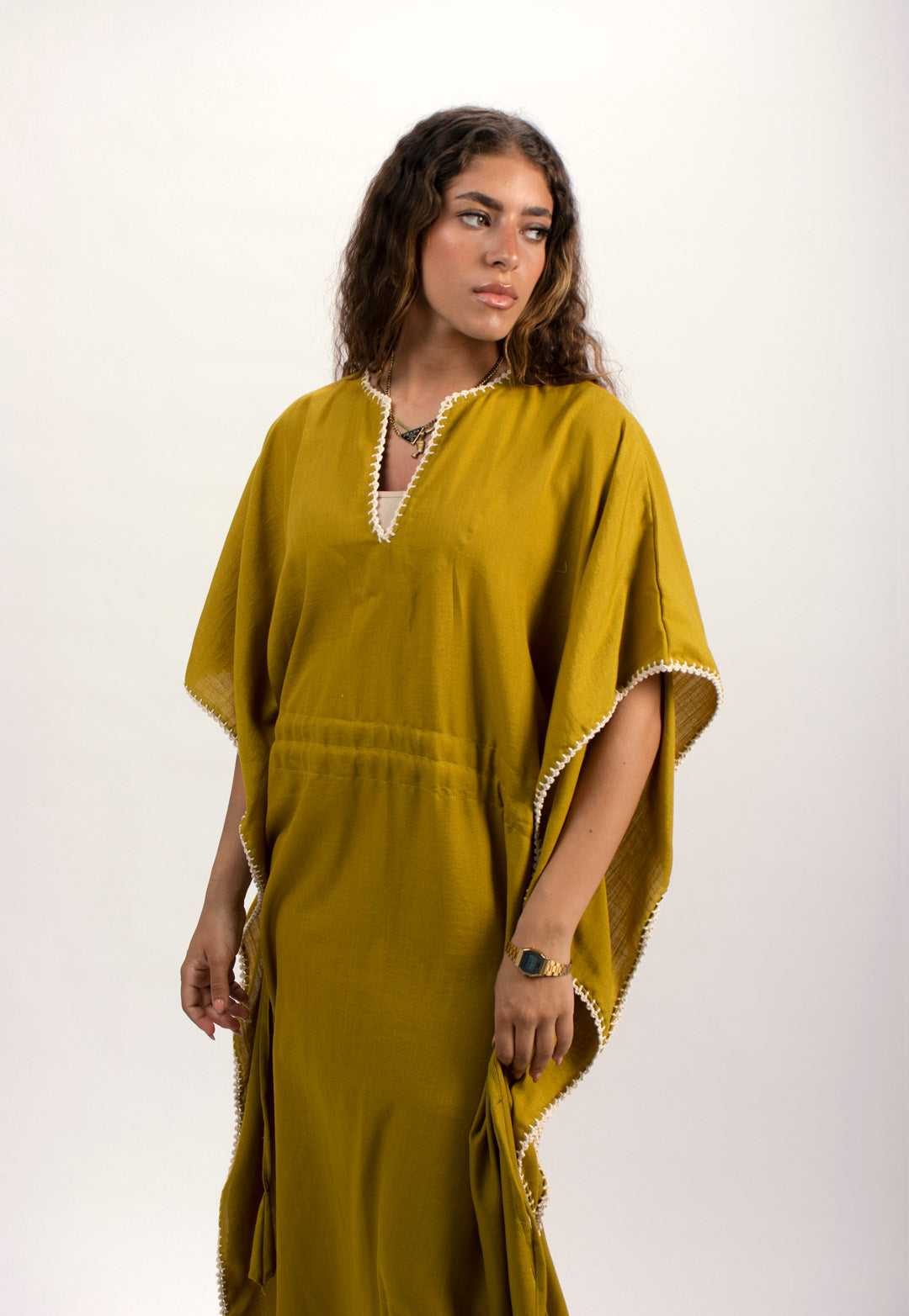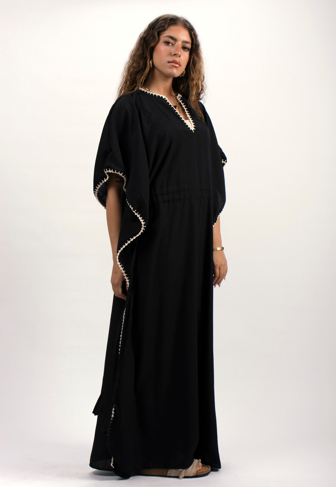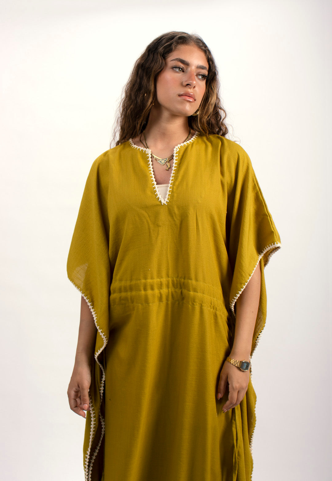 Linen kaftan detailed with handmade trims. Comes with a drawstring by the waist to adjust the tightness. Available in white, black and kiwi.