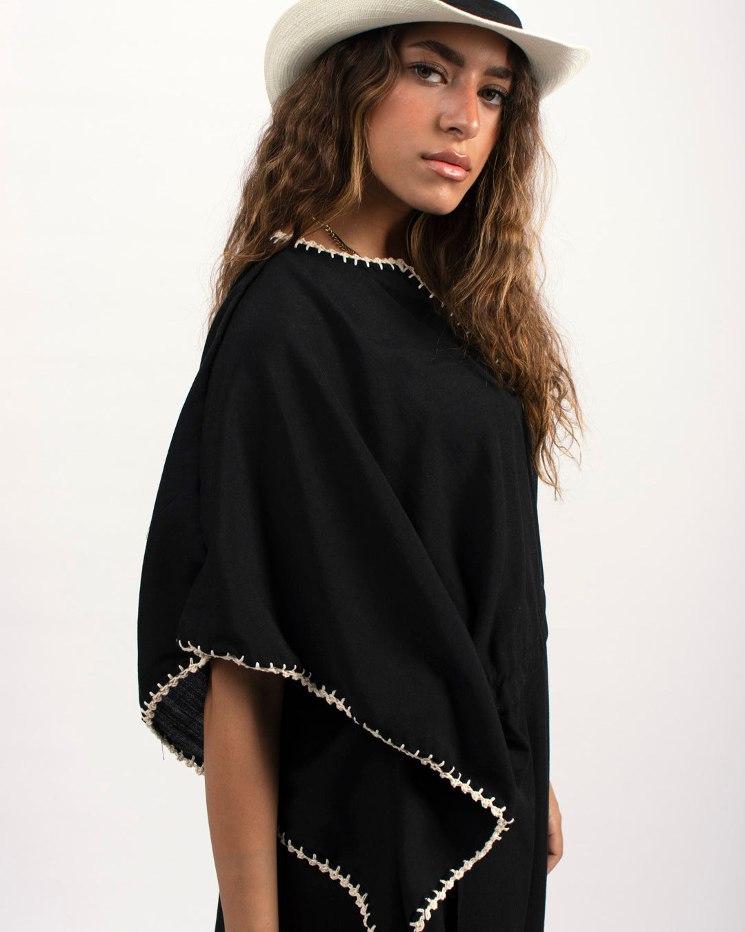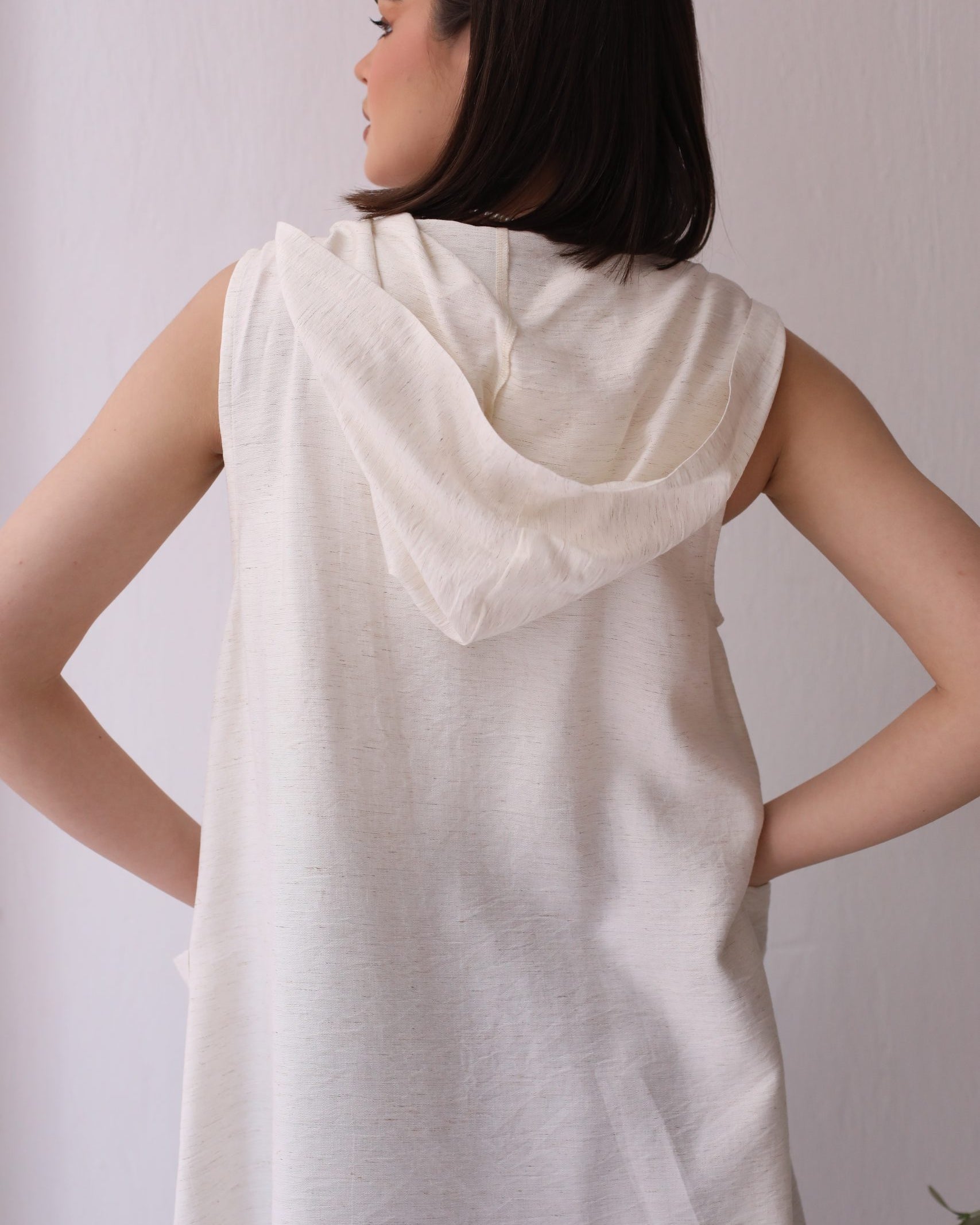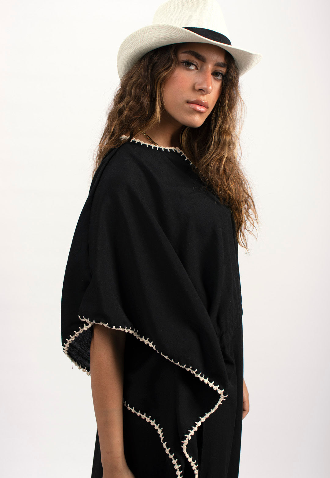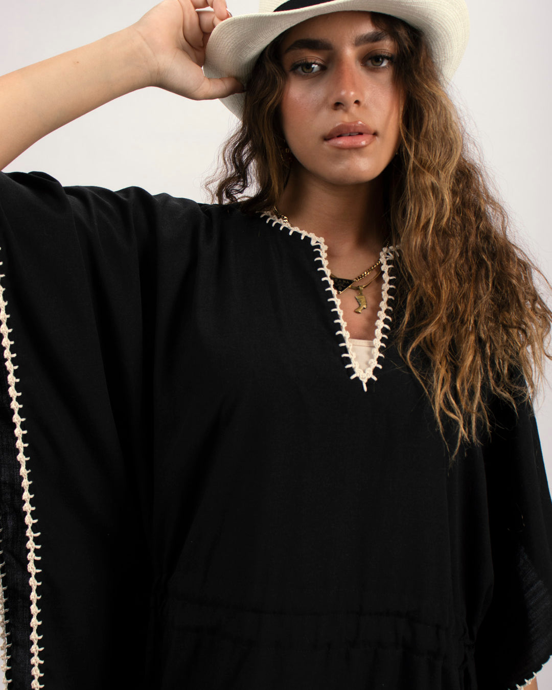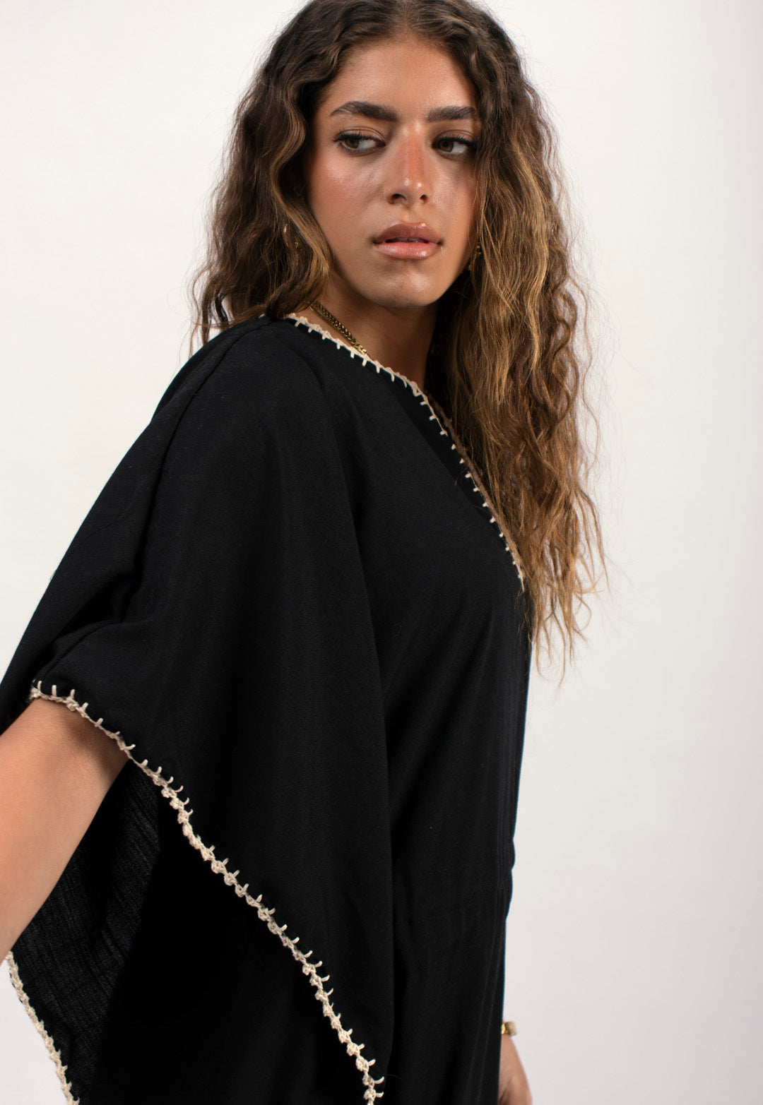 Linen kaftan detailed with handmade trims. Comes with a drawstring by the waist to adjust the tightness. Available in white, black and kiwi.
