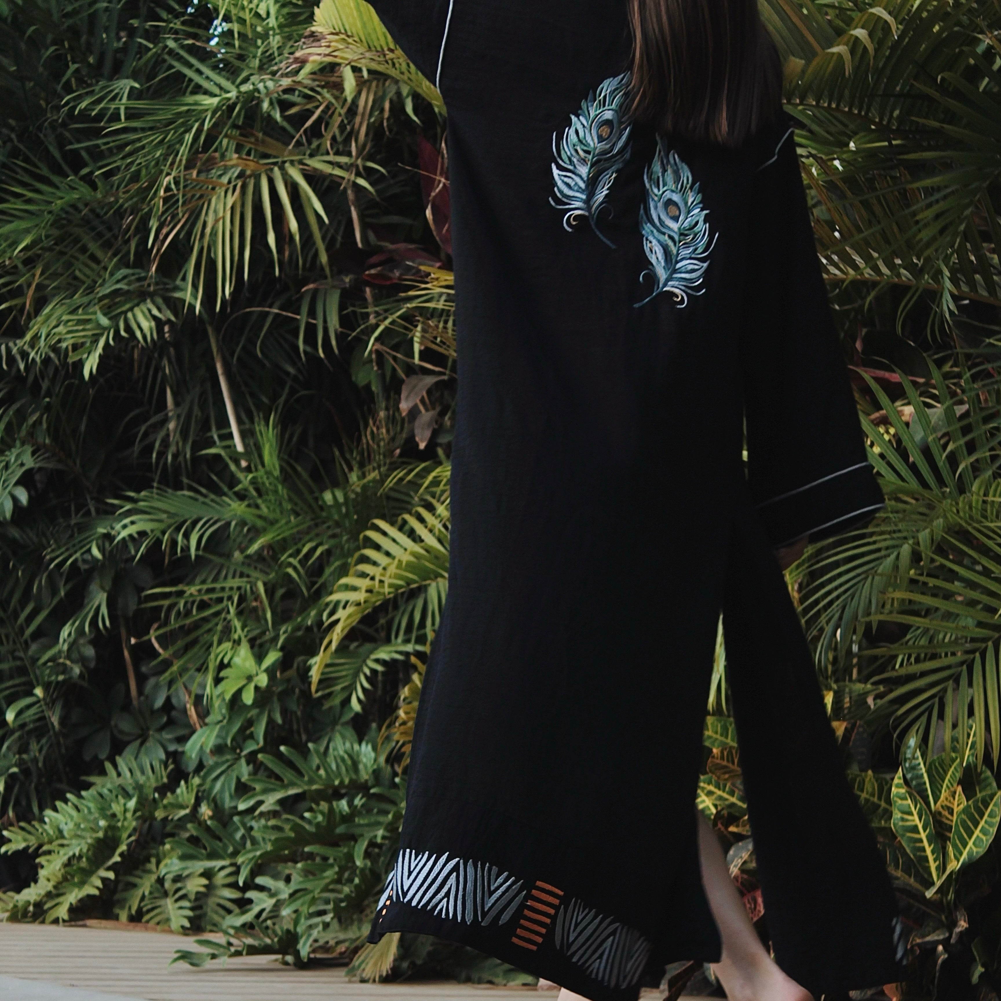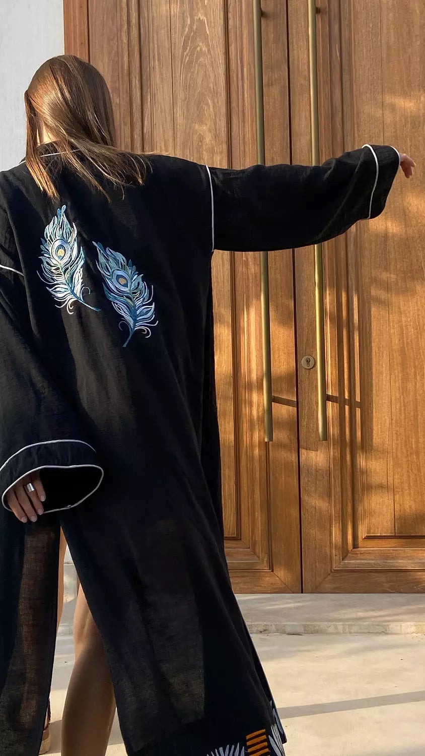 Effortlessly relaxed, this linen-blend kimono features side slits, wide sleeves, and a standout embroidered back detail. Its loose fit and breathable fabric make it the perfect layering piece for laid-back sophistication.