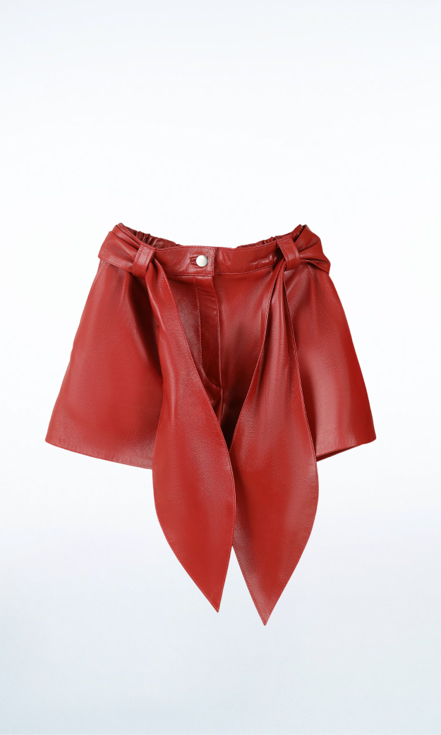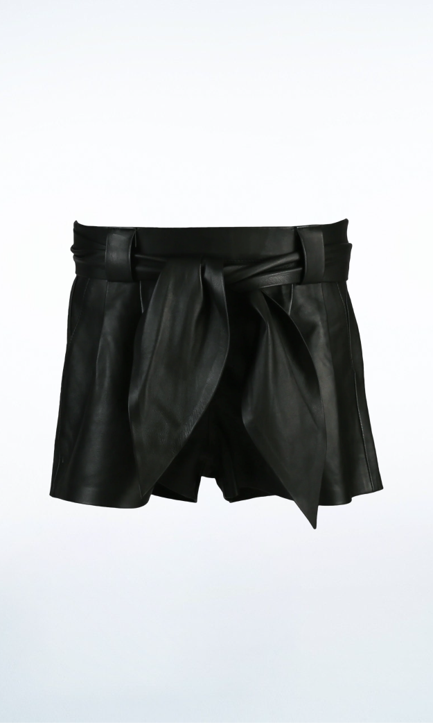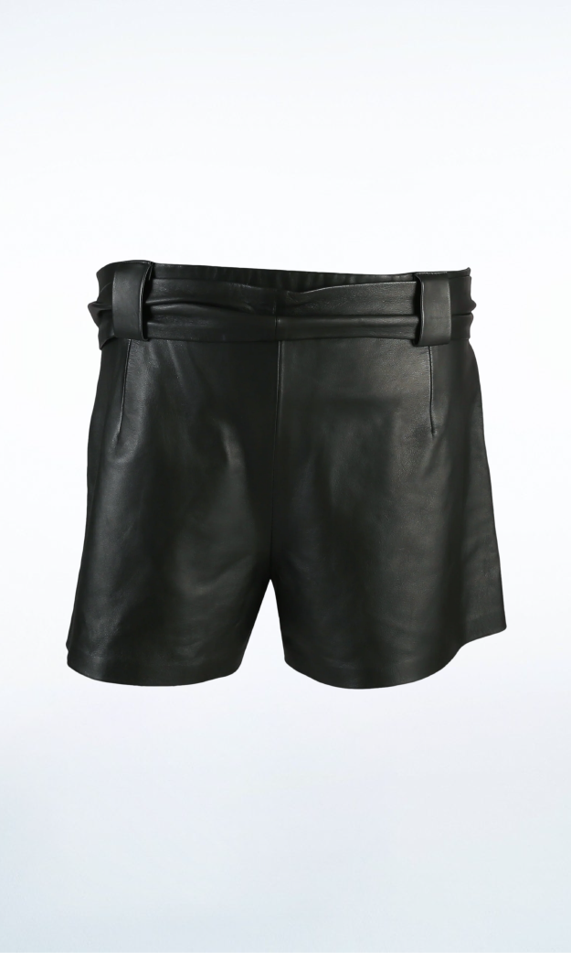 Leather shorts with elastic waistband, removable belt, and side pockets