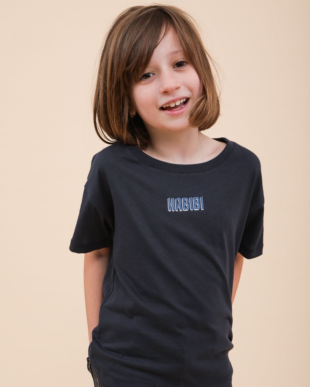 This tee features Habibi (My Love in Arabic) embroidered in medium blue and red for your little one to wear proudly.