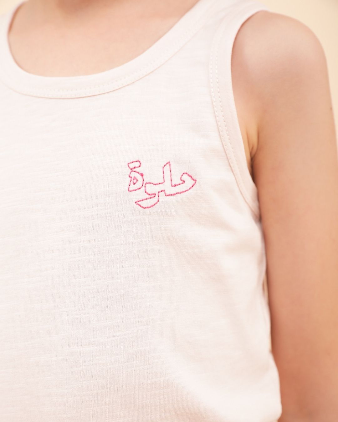 Featuring a small Hlowa (Sweet in Arabic) embroidery in fuchsia pink thread at the heart, it’s the perfect blend of comfort and style.
