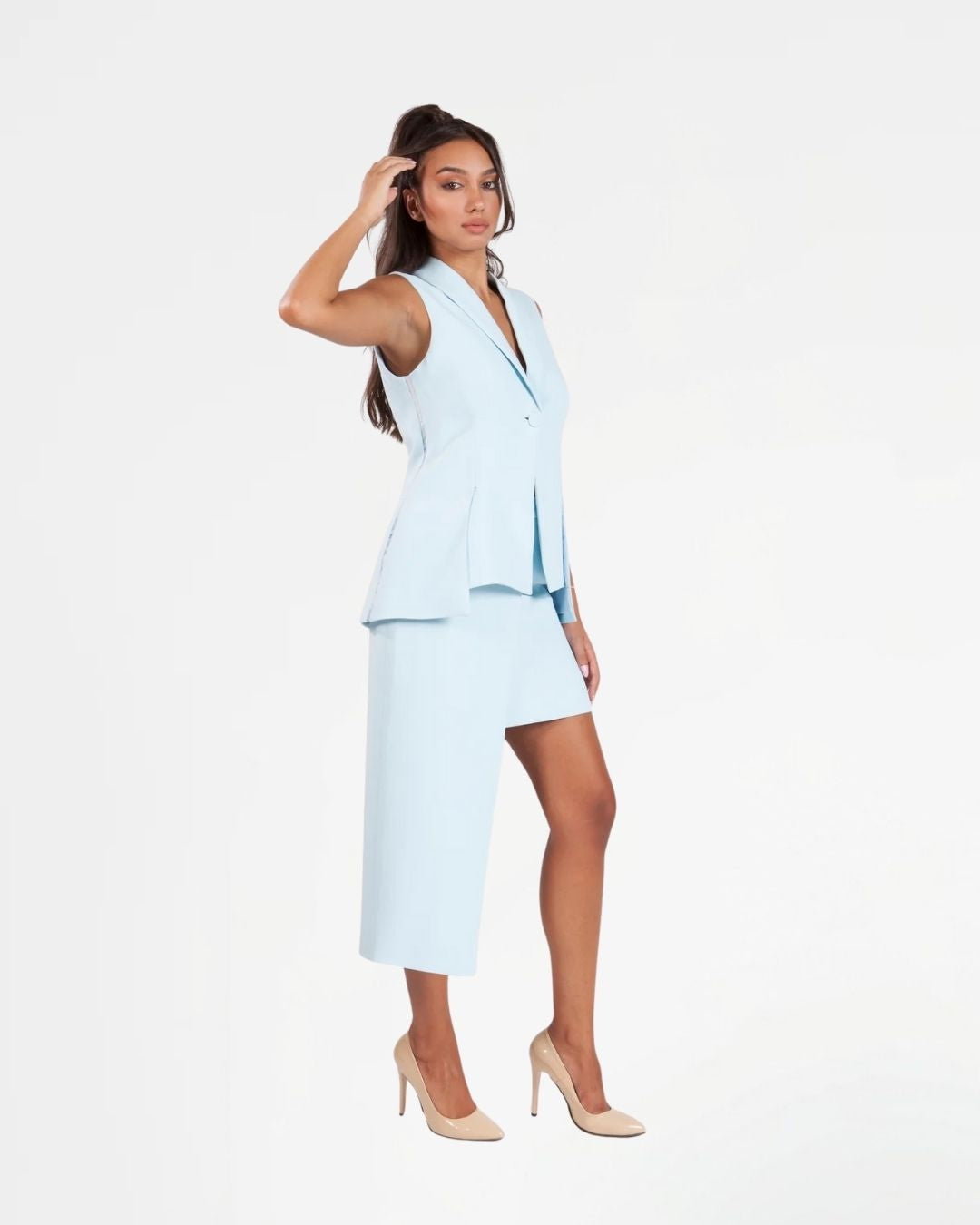 Redefine classic tailoring with our light blue asymmetric skirt, designed to make a subtle yet striking statement. The sleek mini silhouette is contrasted with a dramatic draped panel that adds movement and edge to your look.