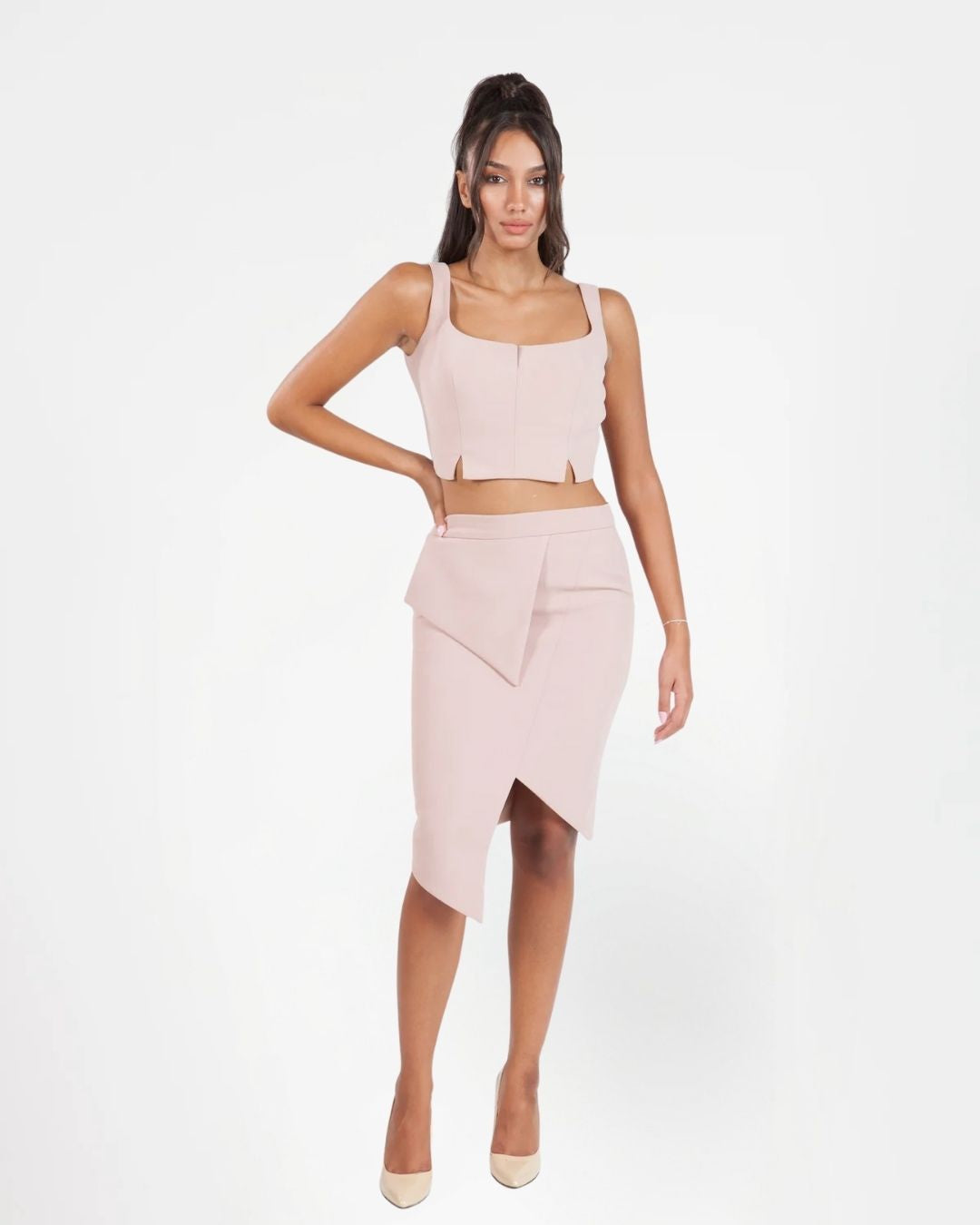Redefine classic tailoring with our nude asymmetric skirt, designed to make a subtle yet striking statement. The sleek mini silhouette is contrasted with a dramatic draped panel that adds movement and edge to your look.