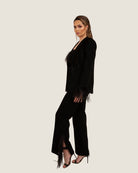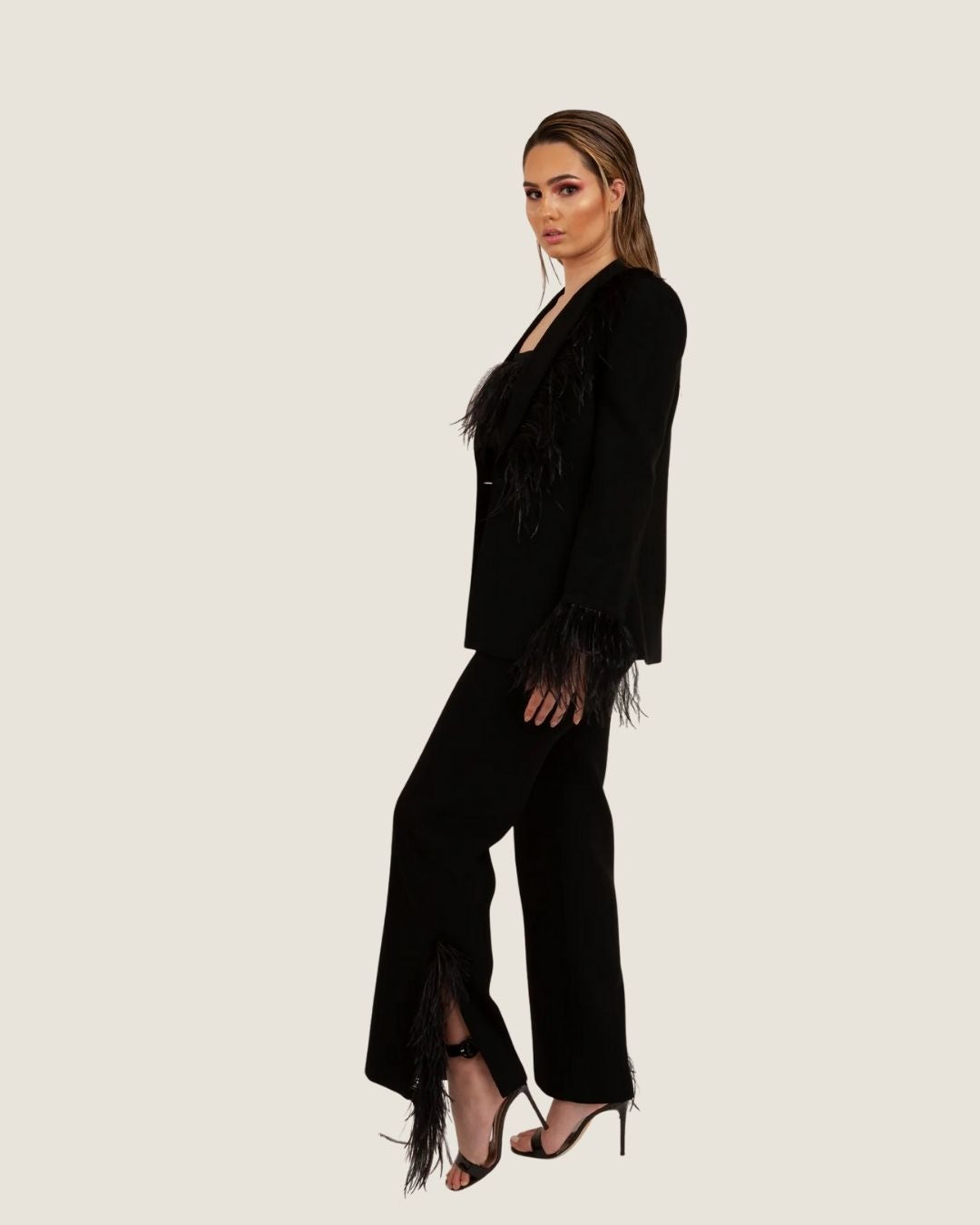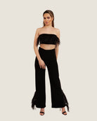 Complete the look with our matching tailored jacket and feathered crop top for a stunning outfit that exudes confidence and elegance. Available in white and black.