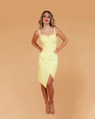 Bring sunshine to your wardrobe with our Pastel Yellow Dress—a bold yet feminine piece that’s all about confident elegance. Featuring a structured bodice with a sweetheart neckline and delicate straps, this dress sculpts the figure beautifully. The asymmetrical hem and tailored overlay add a modern twist to the classic silhouette.
