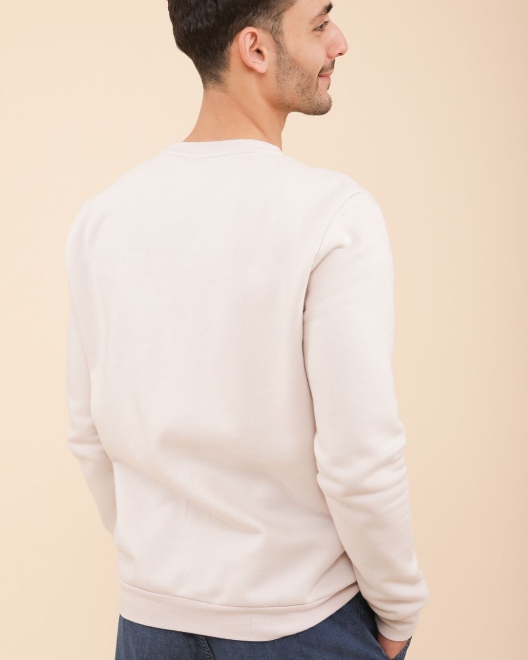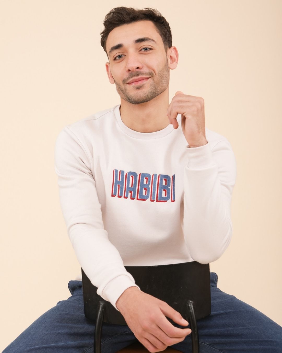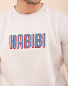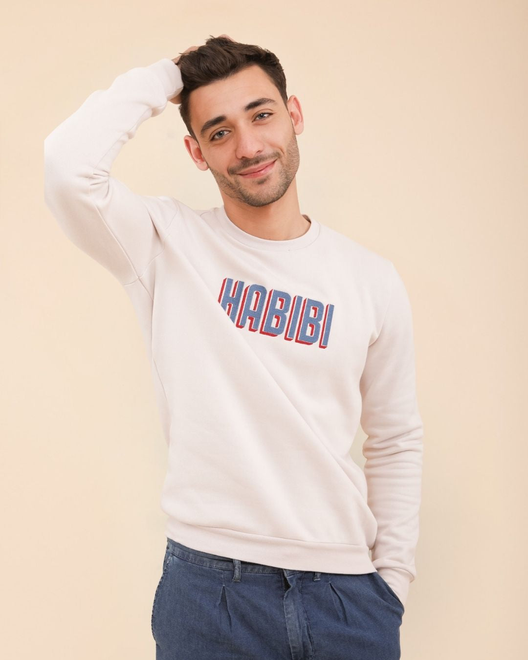 A classic, reimagined with two-tone embroidery. Crafted from thick, ultra-soft brushed fleece in a timeless grey ecru shade, this straight-cut essential features Habibi (My Love in Arabic) embroidered in medium blue and red for a bold touch.
