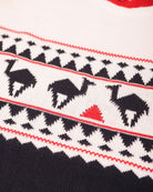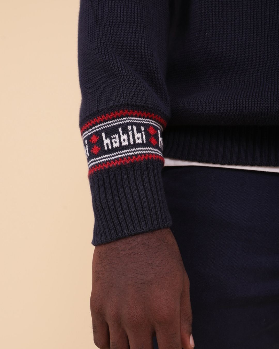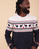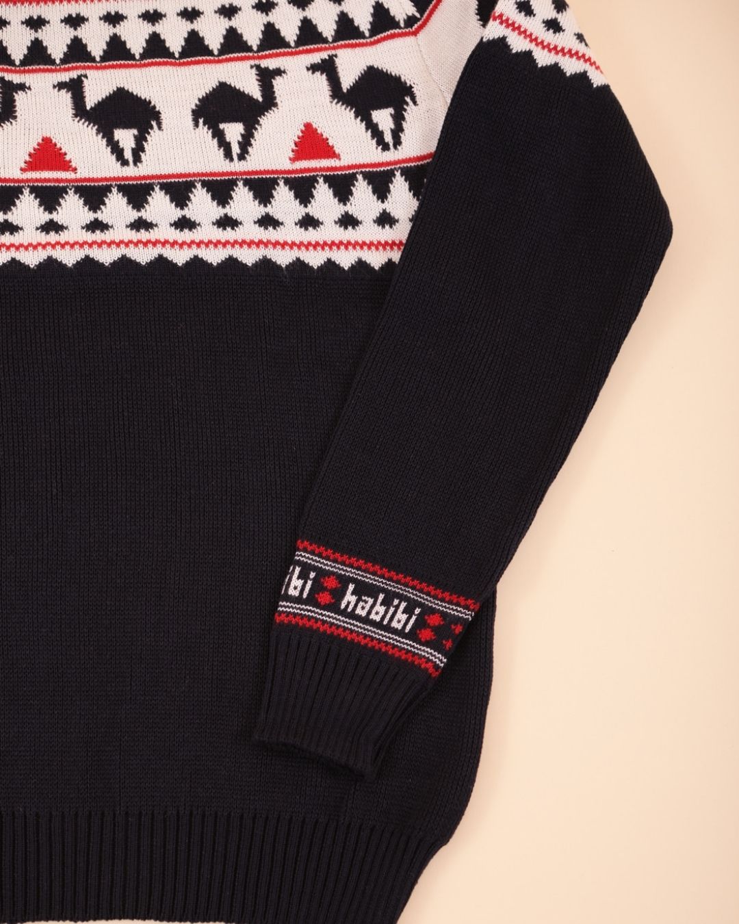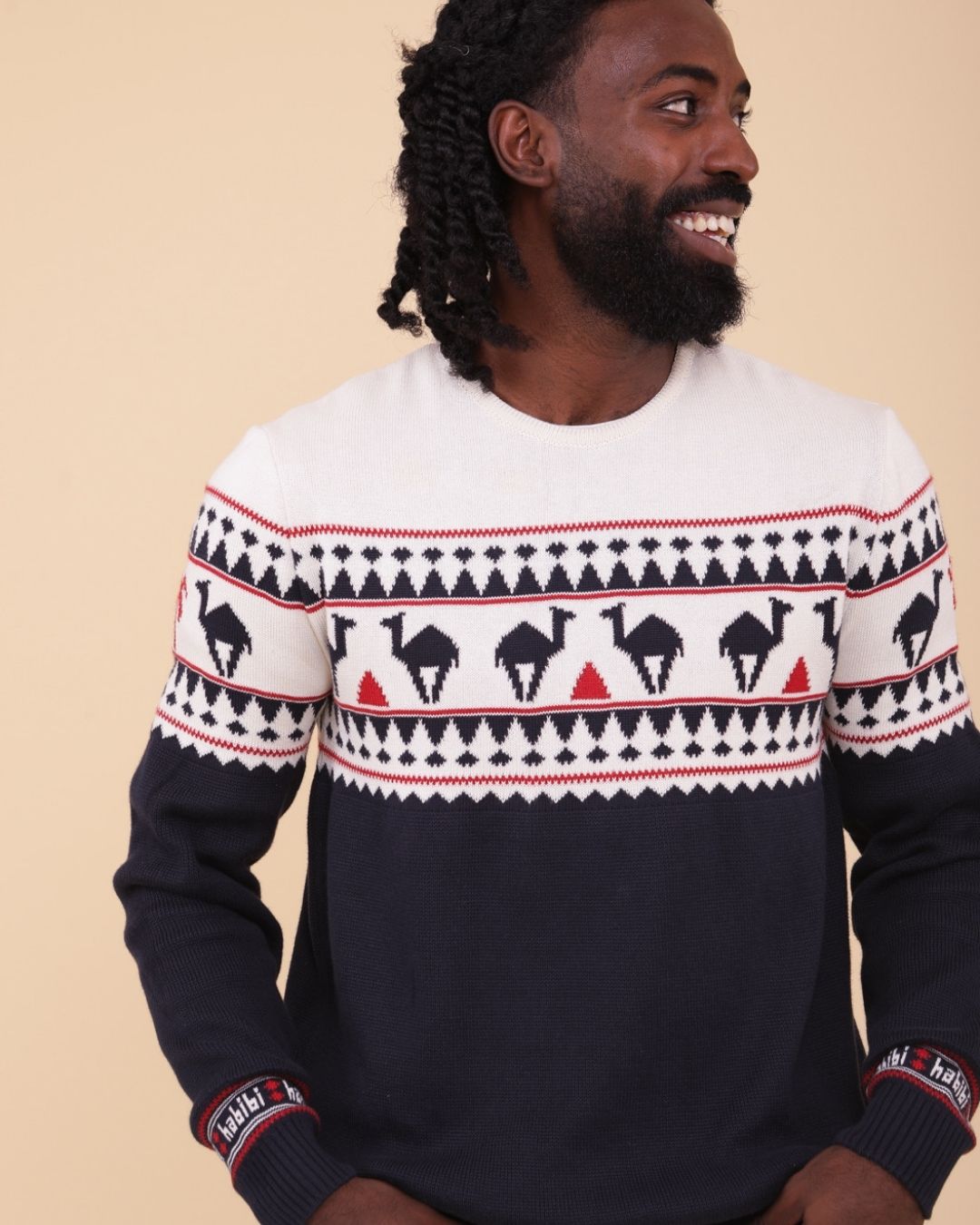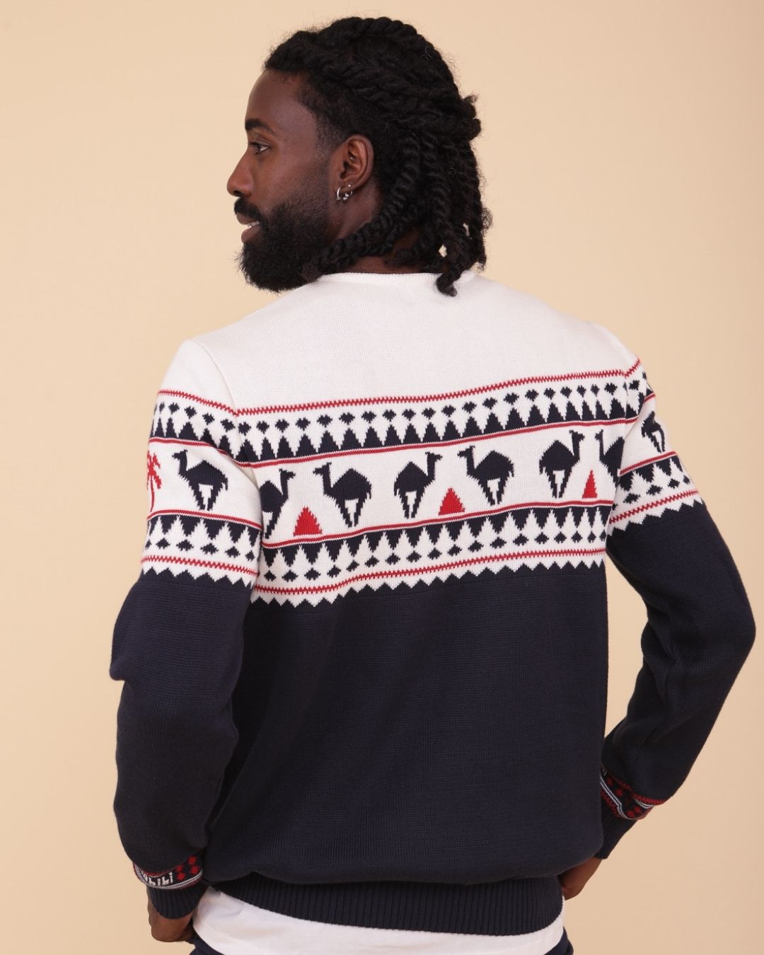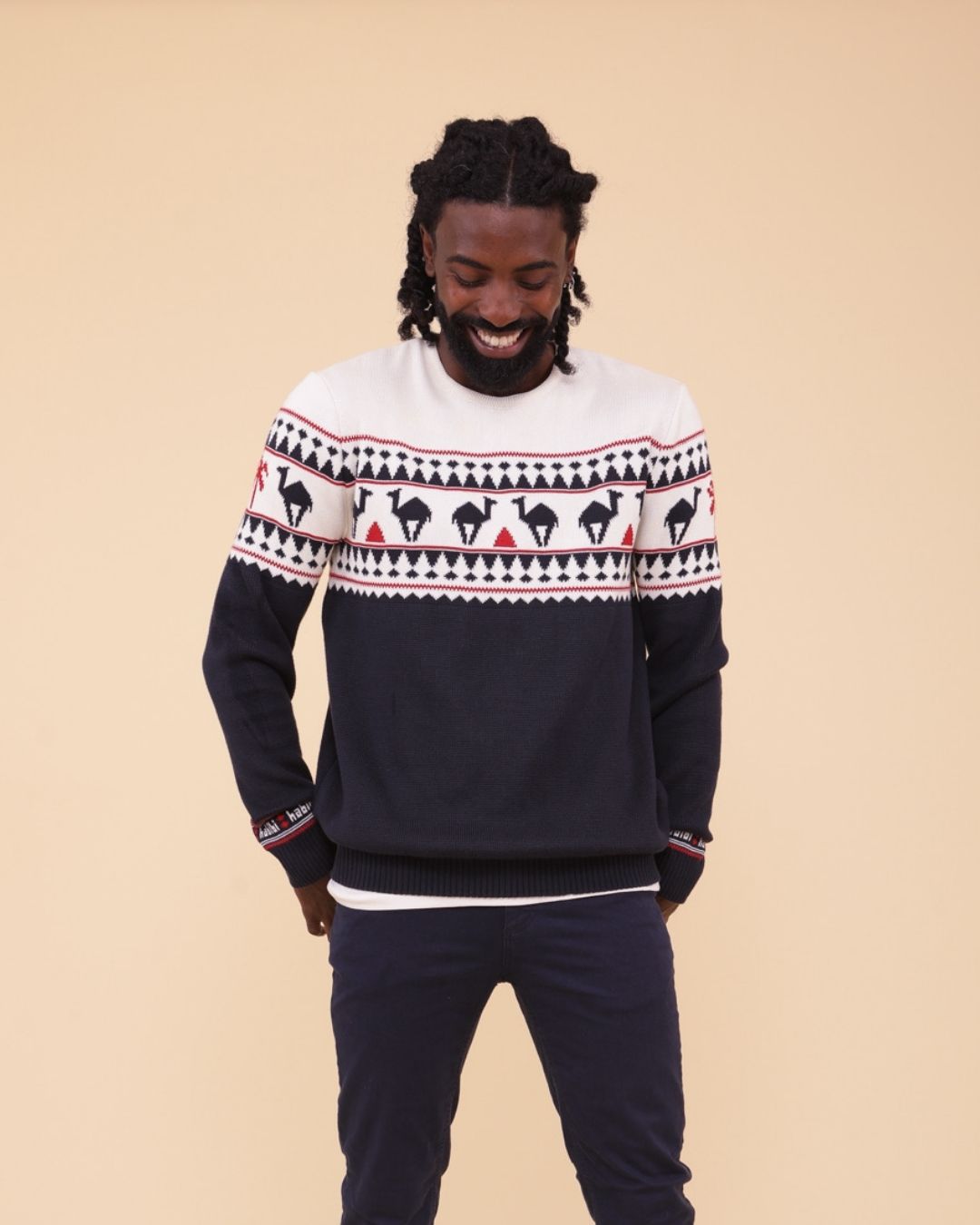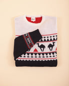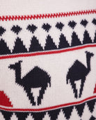 A warm and soft jacquard sweater in the classic English X'mas Jumper style, infused with LYOUM's Mediterranean vibes. Featuring exclusive new camel patterns, this navy base sweater is adorned with off-white and red designs, finished with a cozy crew neck for the perfect festive look.