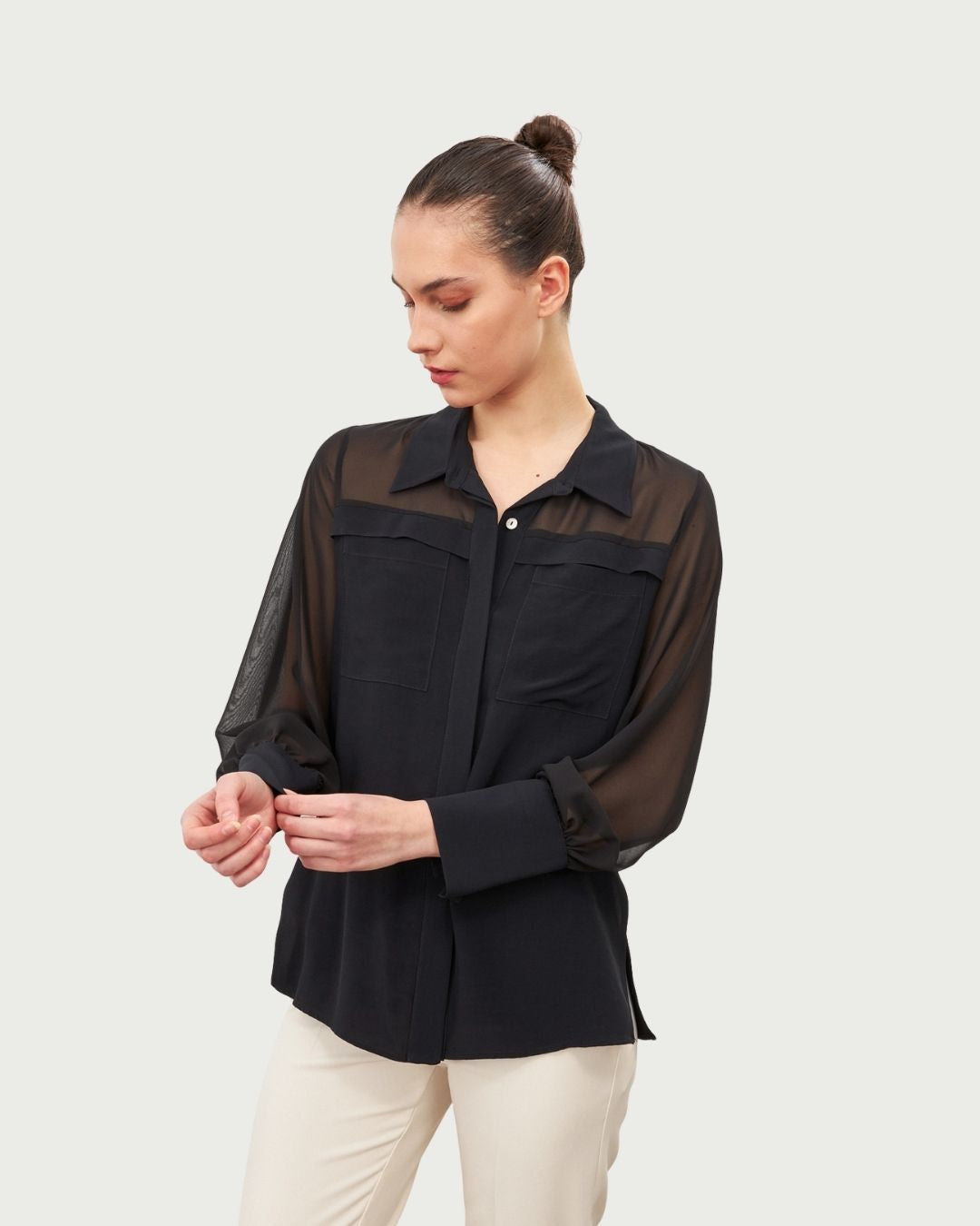 The Sheer Pocket Detail Long Sleeve Shirt blends modern elegance with everyday functionality. Crafted from airy sheer fabric, it offers a subtly alluring look, while the pocket details add both style and practicality.