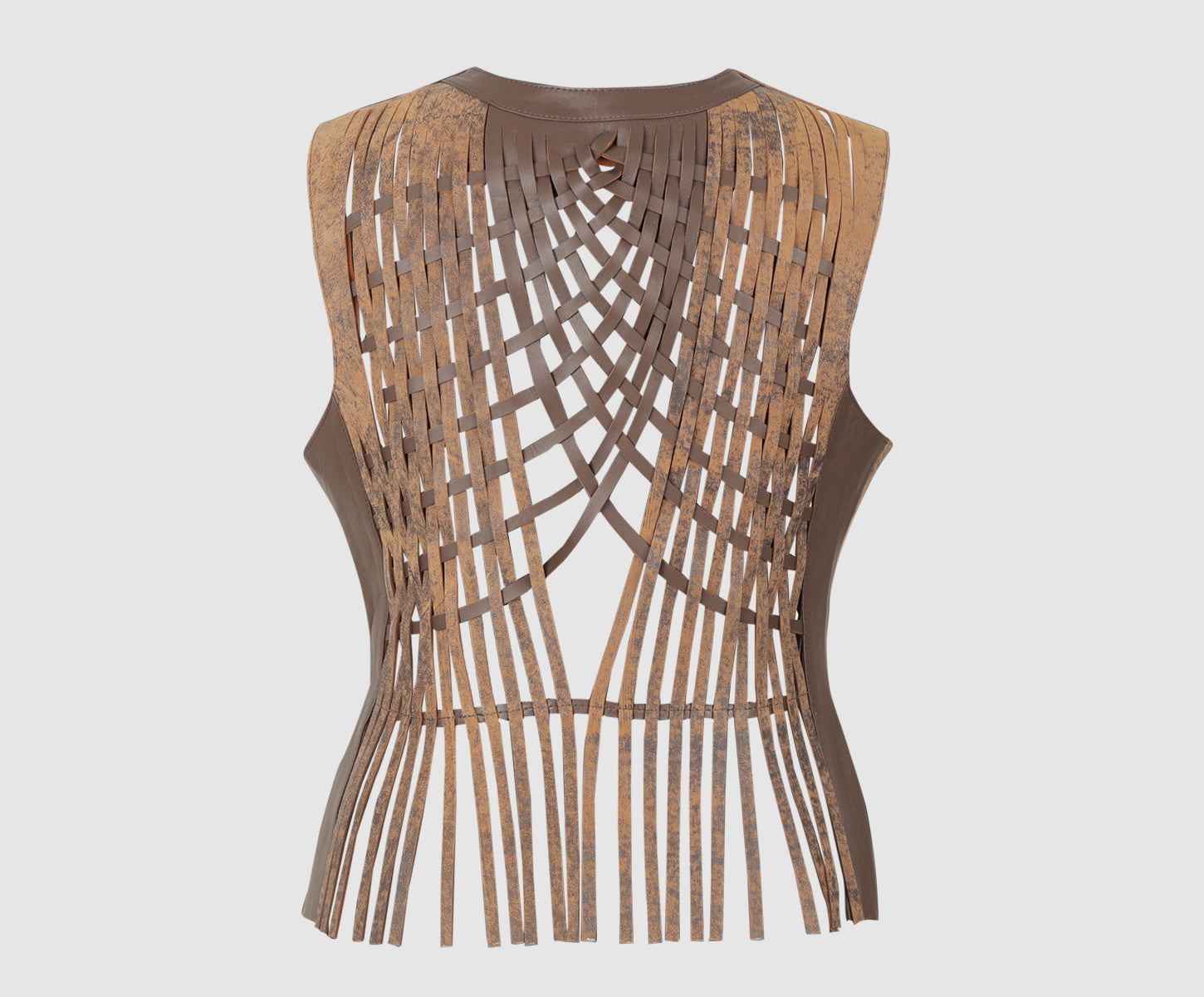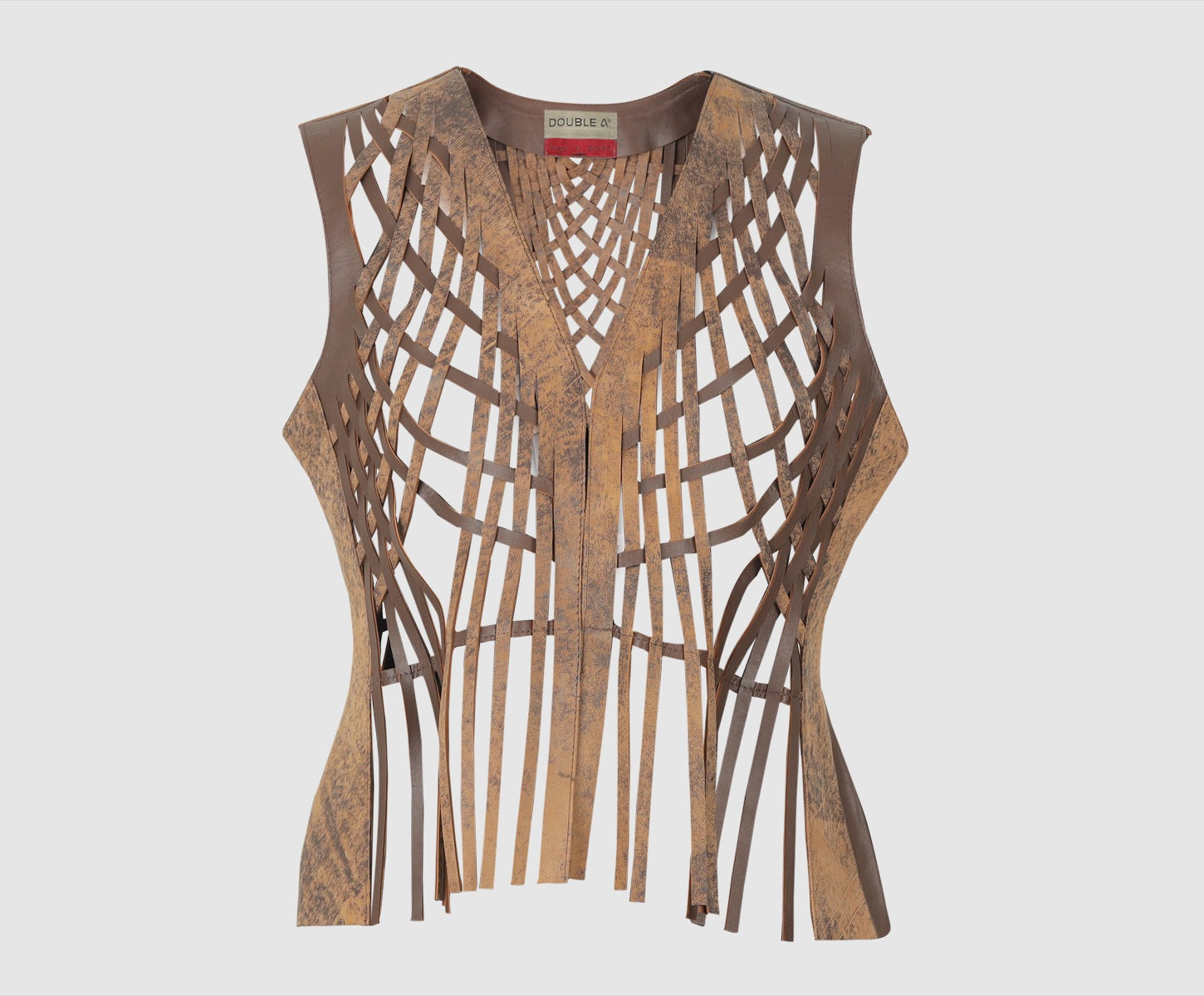 The Attalea leather vest II is one of Double A’s signature designs, it is a straight fit woven fringed vest with a v–neckline and a double metal hook fastening at the front. Featuring a brilliant color combo. It can be dressed up or down, casually or formally, in winter or summer. It is truly the piece that you will rely on to popup your outfit.