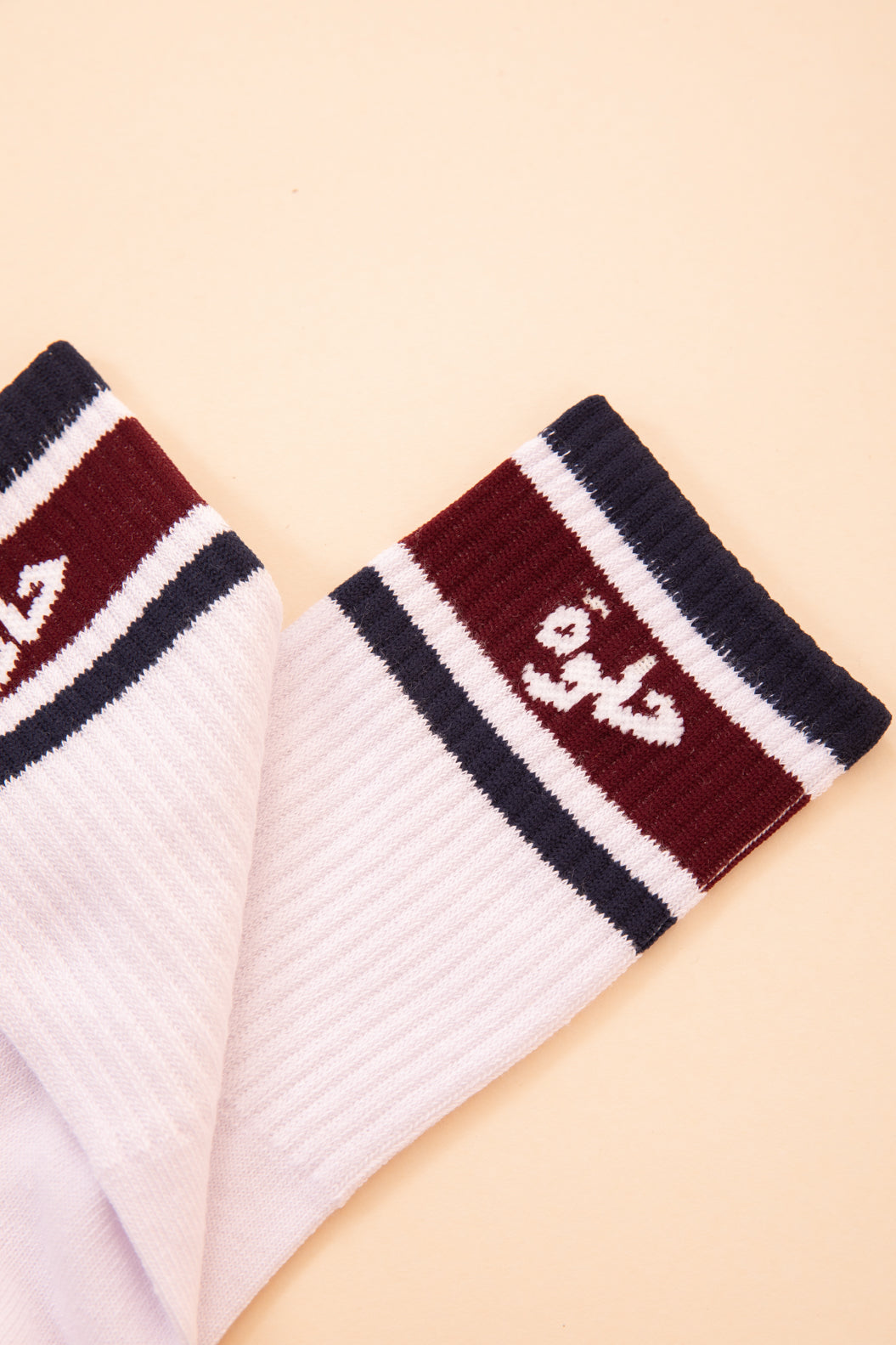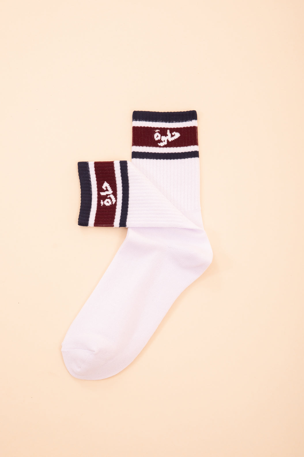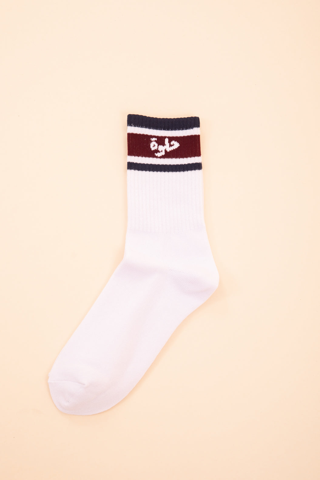 Make a statement with these specialty socks! These mid-high socks come in one size, featuring burgundy and black stripes with Helwa knitted on one side and Harra on the other. The wide, comfortable ribbed edges provide support without applying pressure on the leg.