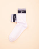 Make a statement with these specialty socks! These mid-high socks come in one size, featuring light blue and navy blue stripes with Helw knitted on one side and Har on the other. The wide, comfortable ribbed edges provide support without applying pressure on the leg.