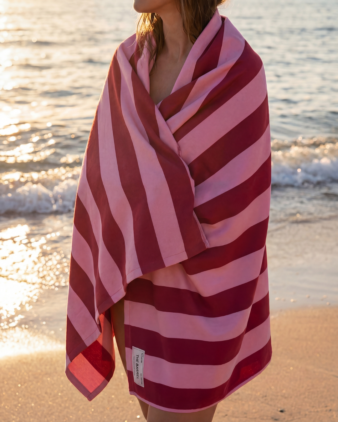 With its sleek finish and vibrant colorways, The Barrel Towel folds effortlessly into your bag and unfolds into a statement piece on the sand. Inspired by retro summer energy and modern lifestyle aesthetics, it’s made for bold days, relaxed moments, and effortless style.
