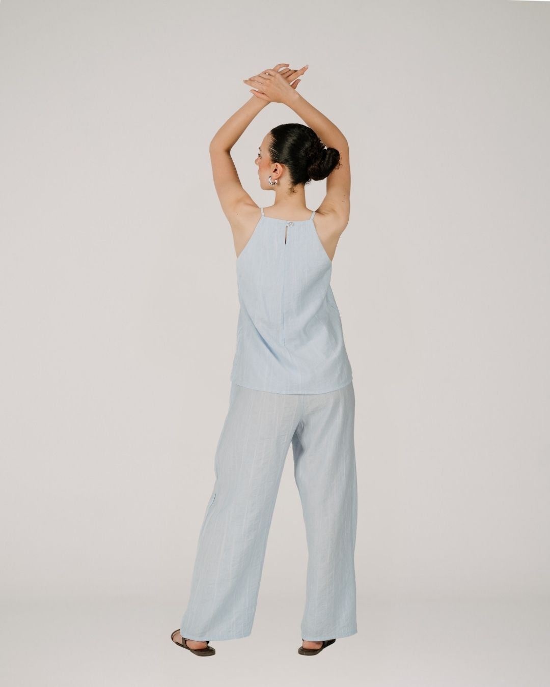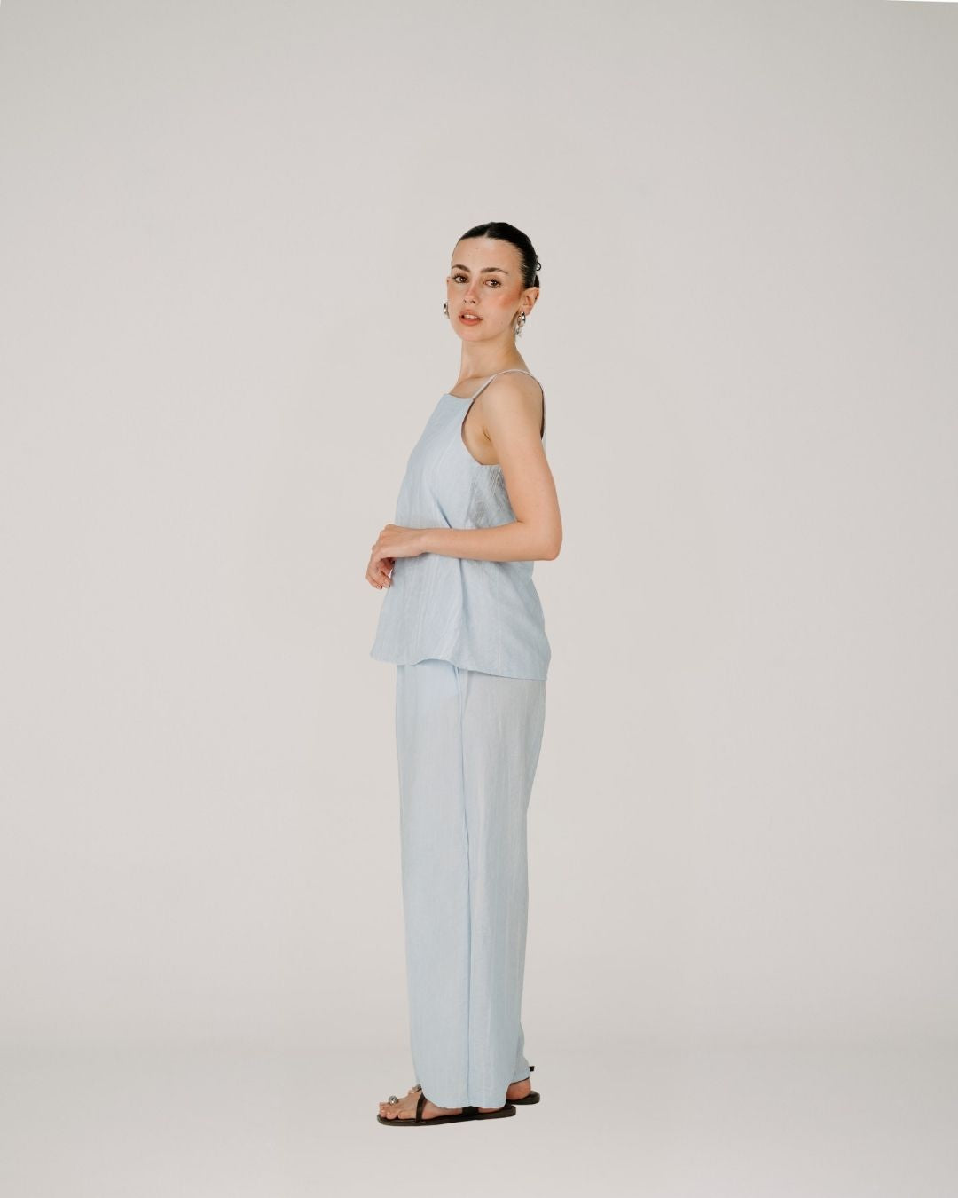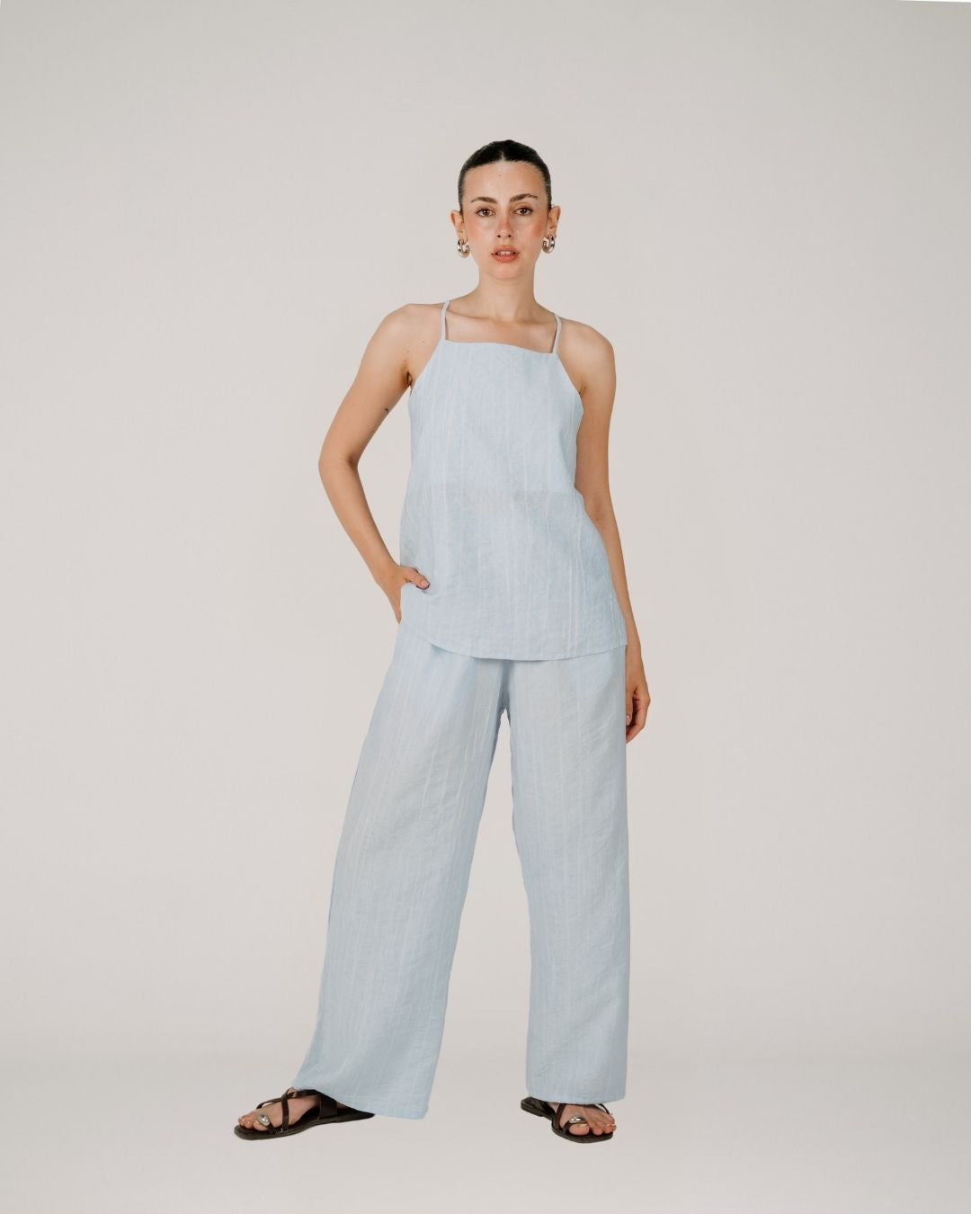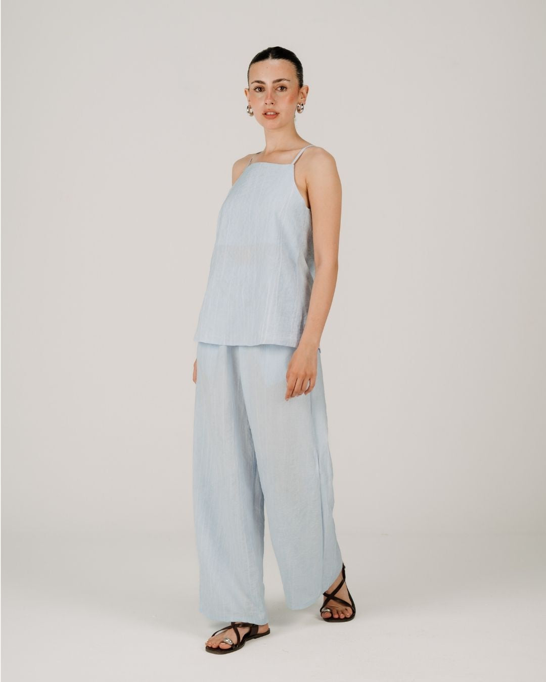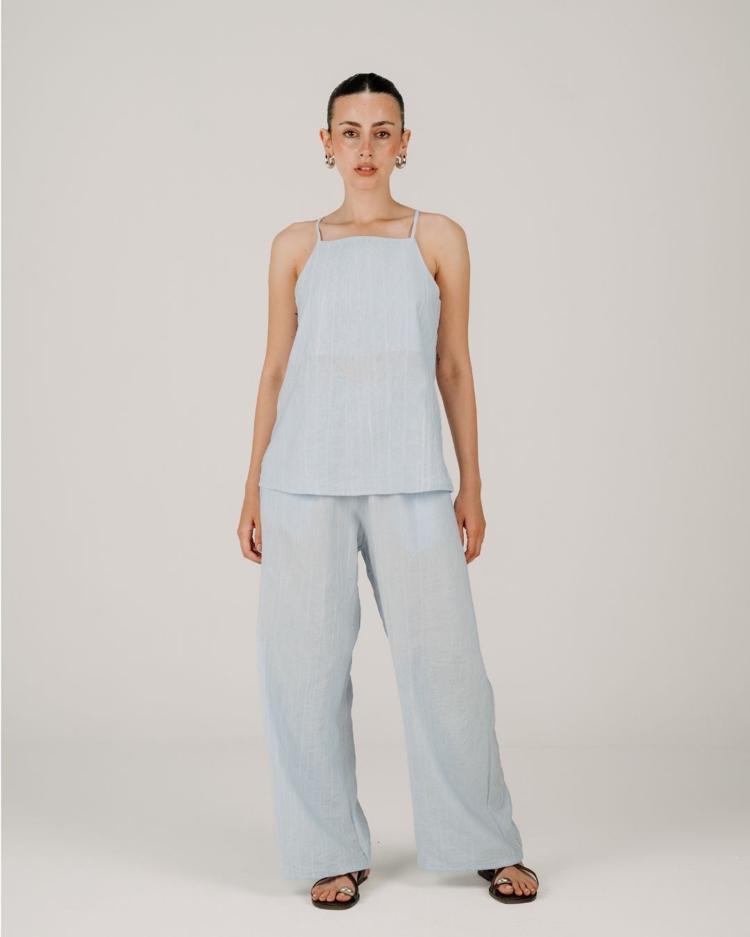 Relaxed-fit pants in sky blue. Made from soft textured cotton. Designed with an elastic waistband and side pockets for everyday comfort and flow. Light and breathable — created for hot summer days.