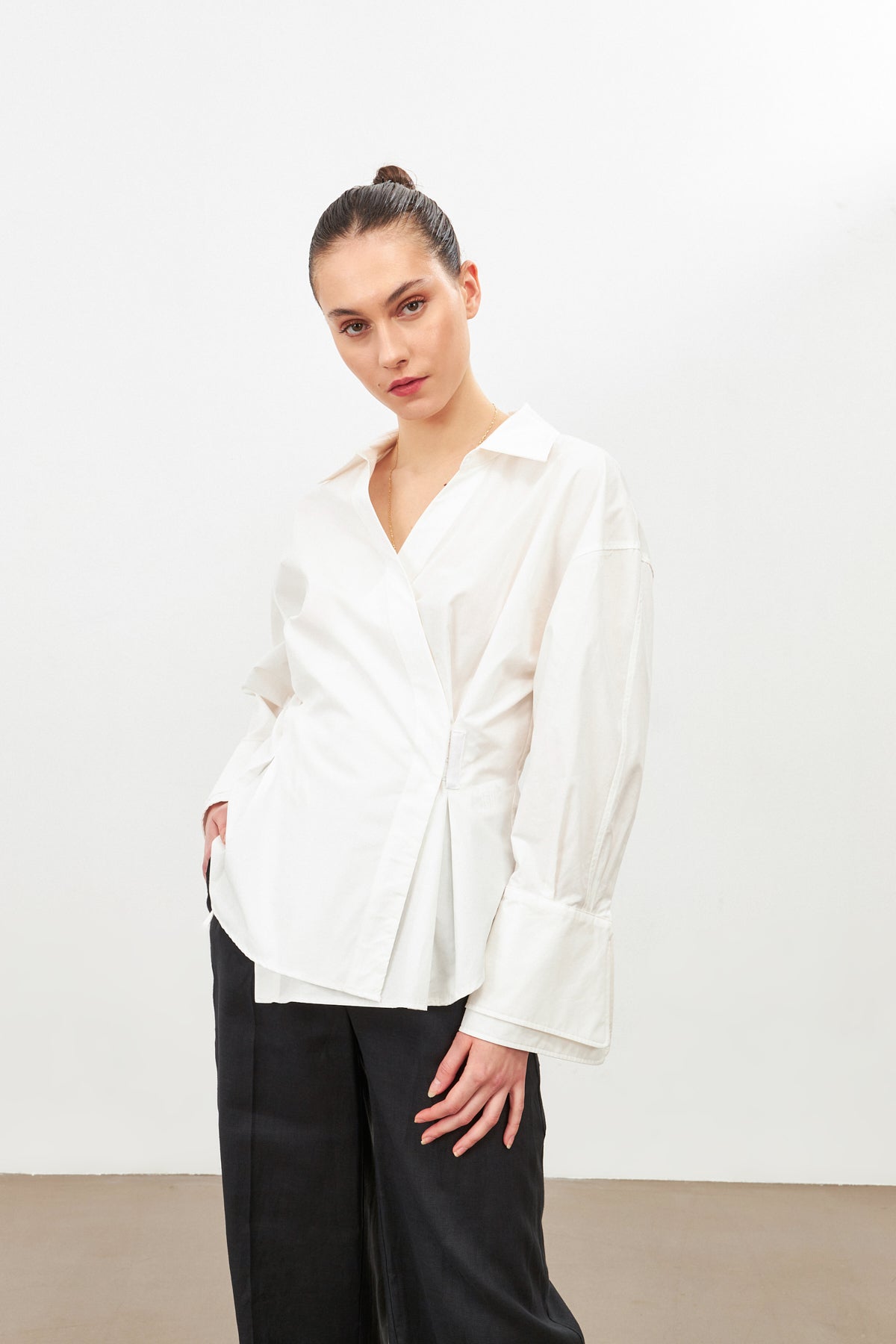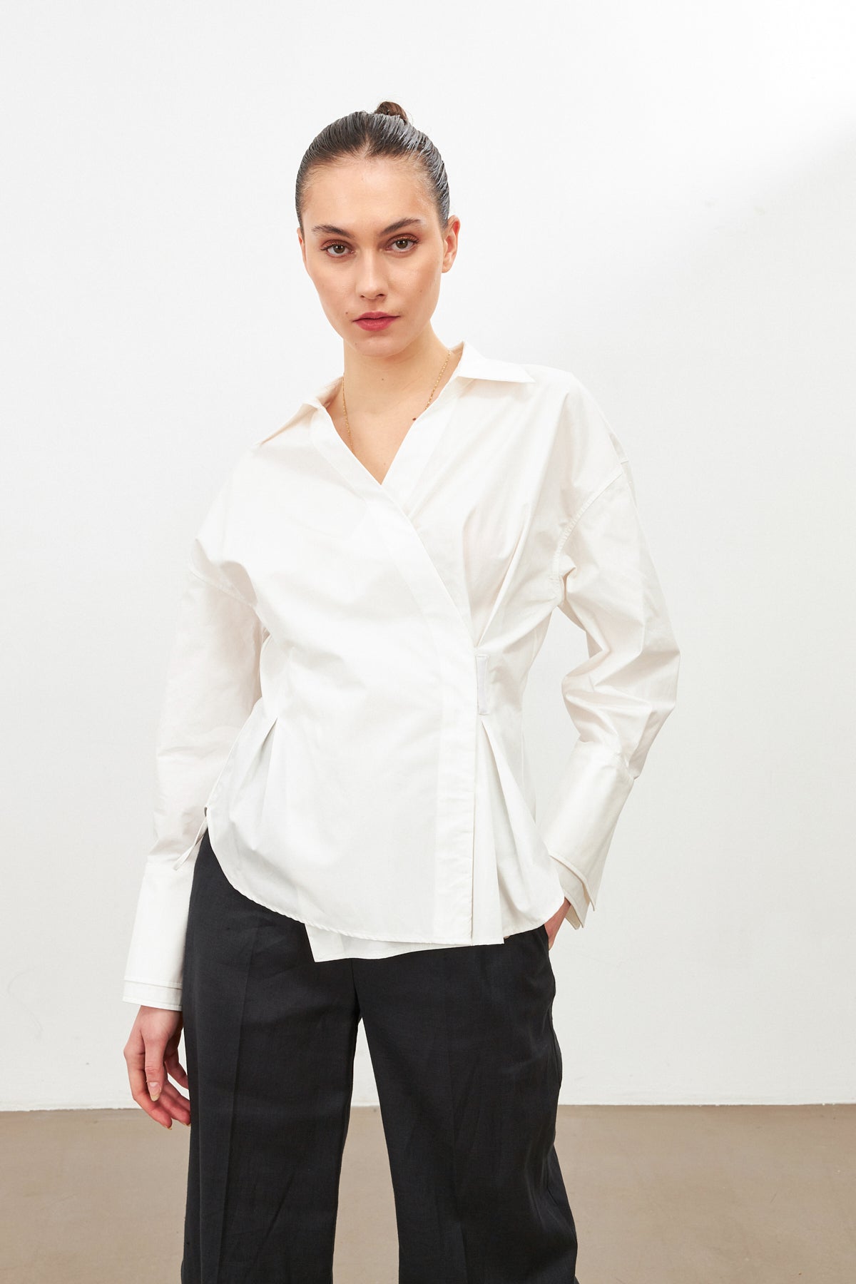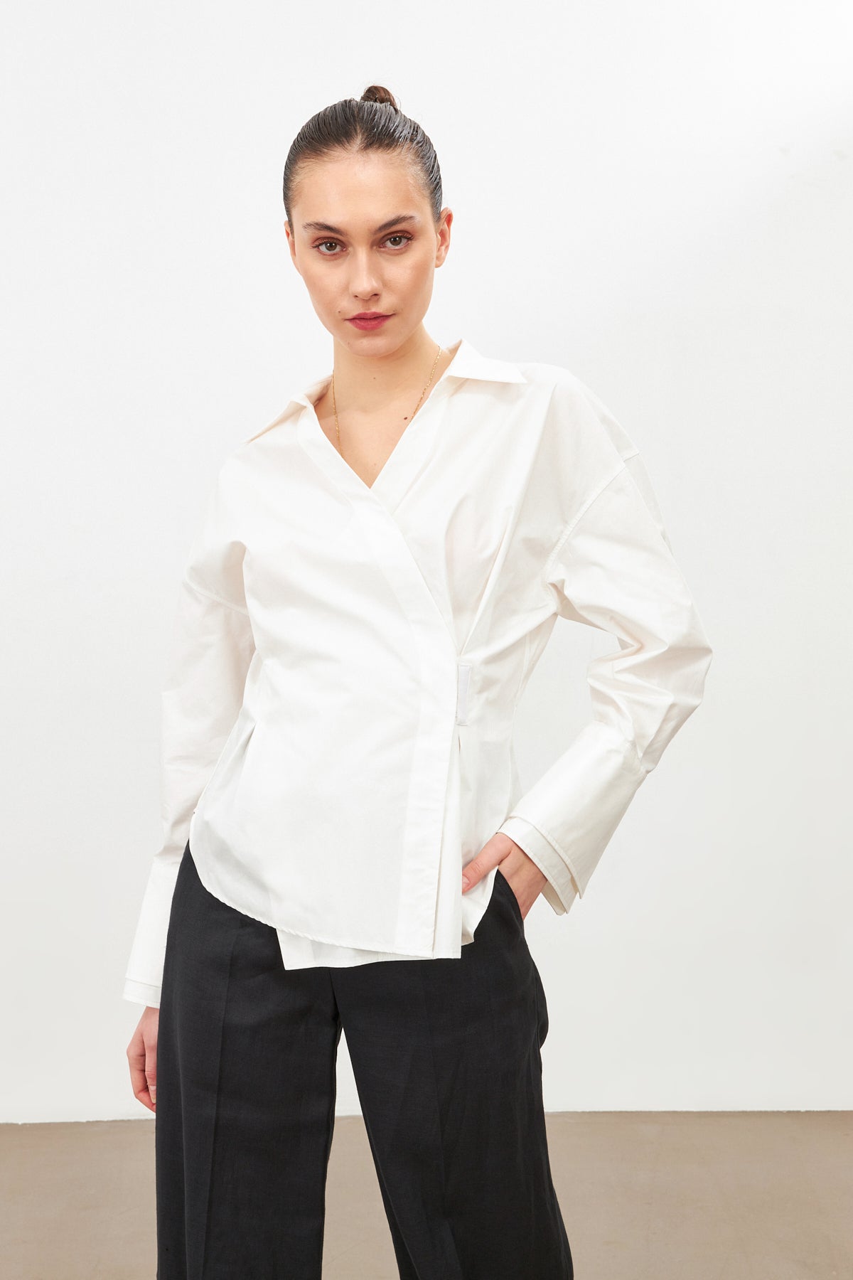 Elevate your wardrobe with the Asymmetric Closure Long Sleeve Shirt—crafted for the modern woman who embraces both elegance and edge.
