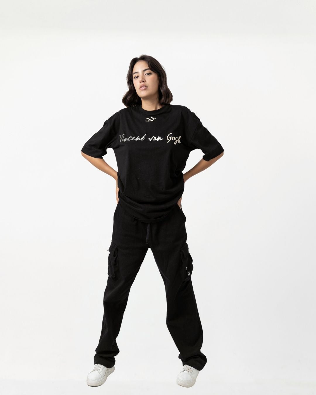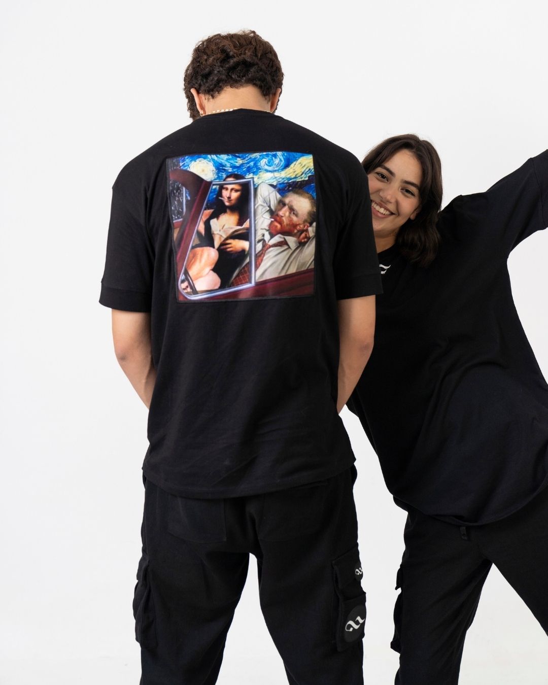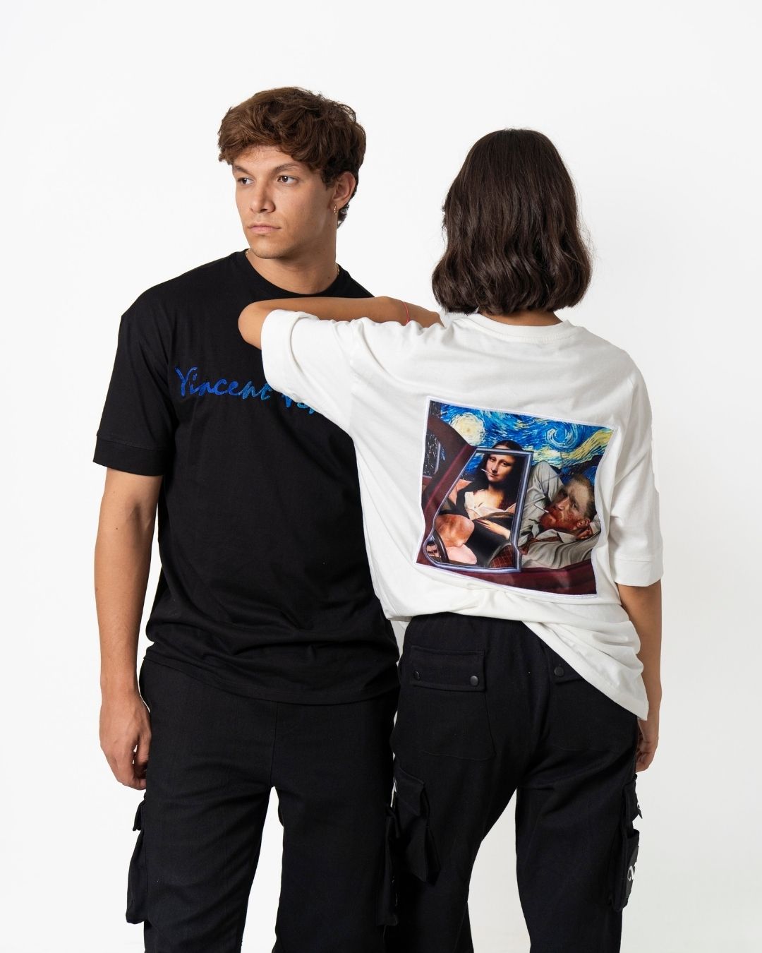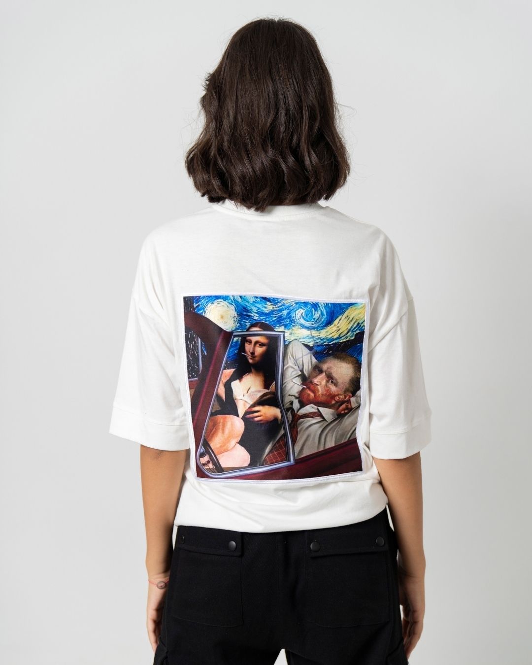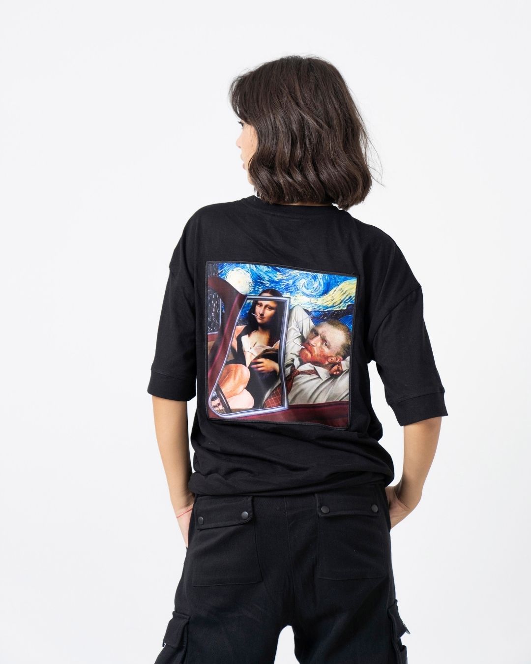 Merge two iconic masterpieces with the Van Gogh X Mona Lisa Oversized T-Shirt, blending timeless art with modern street style.