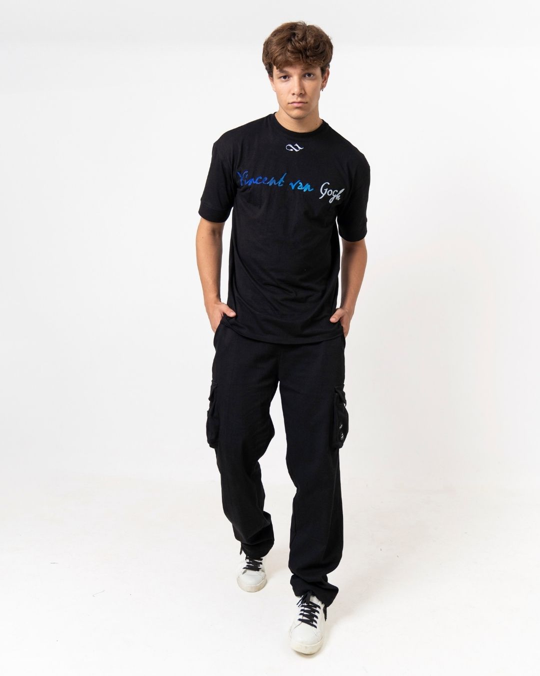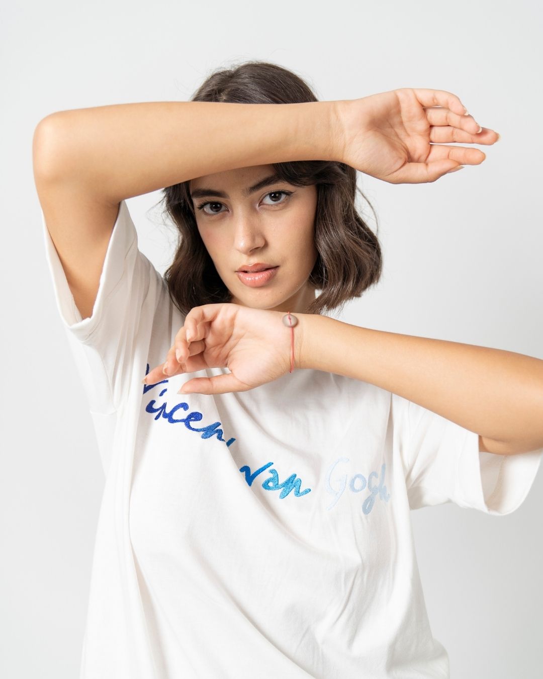 Features a bold, eye-catching print combining Van Gogh's vibrant style with the classic Mona Lisa, creating a unique artistic fusion. The back is enhanced with an embroidered detail for an added touch of creativity.