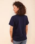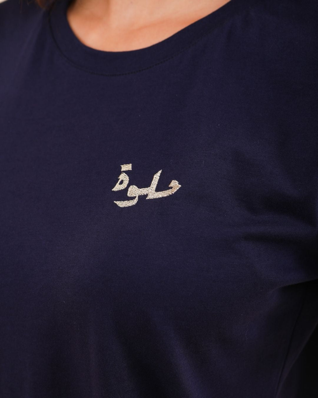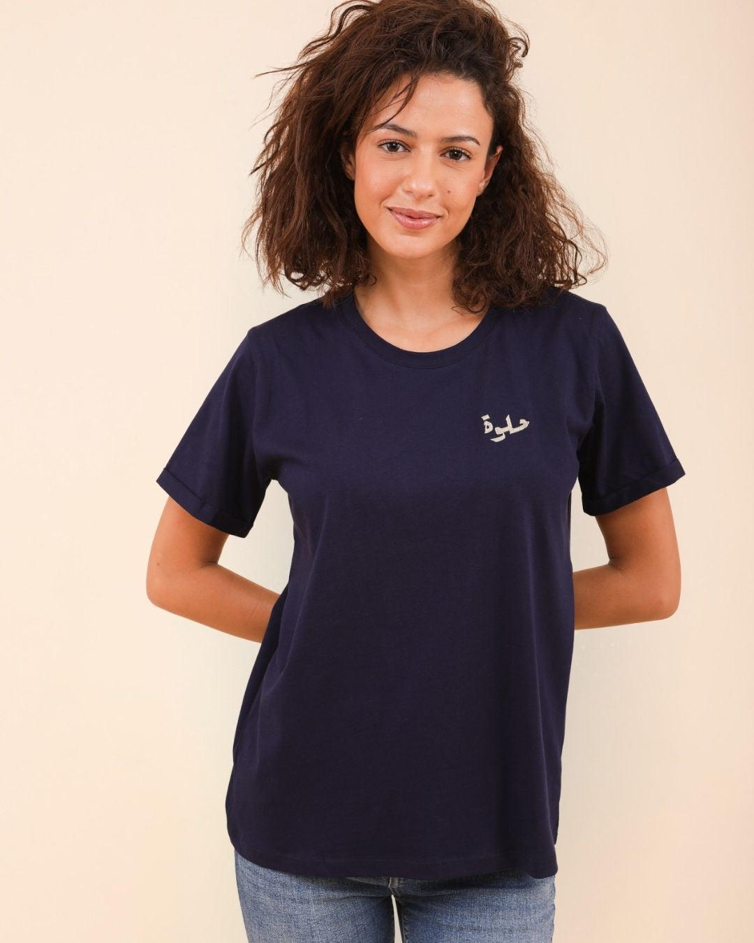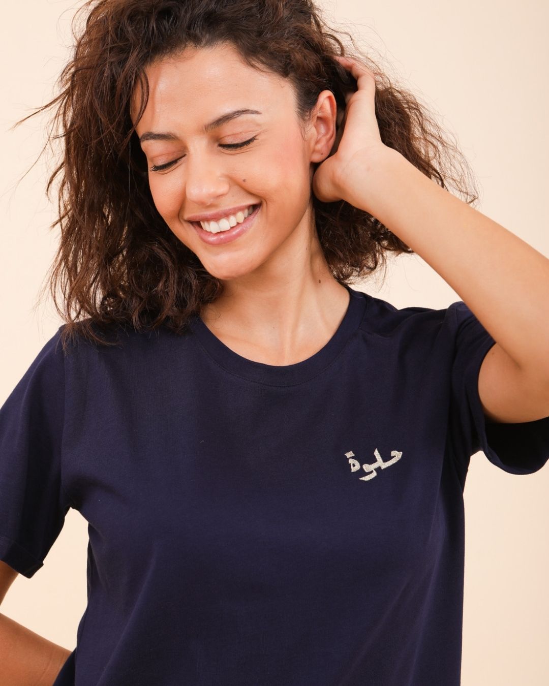 A perfect straight-cut tee in navy, featuring a small calligraphy embroidery on the heart: Hlowa (Sweet in Arabic). Simple, stylish, and effortlessly chic.