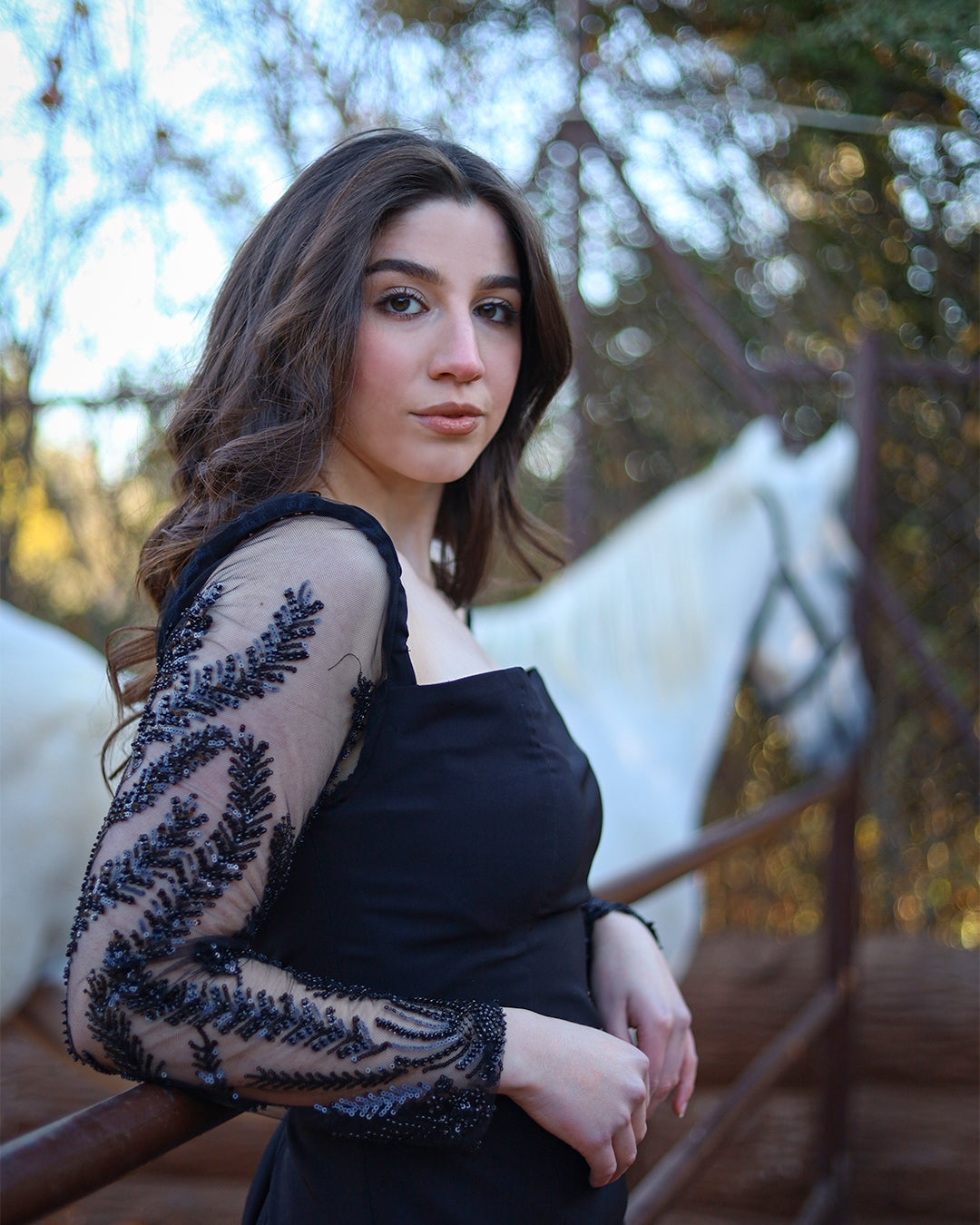 Fitted Crepe Dress with Beaded Tulle Sleeves