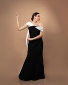 A bold yet timeless evening piece, this black dress is elevated with a dramatic white off-shoulder cape detail. The flowing contrast fabric drapes elegantly over one shoulder, creating a striking silhouette that blends modern sophistication with classic monochrome style. Perfect for formal occasions, galas, or statement evenings out.