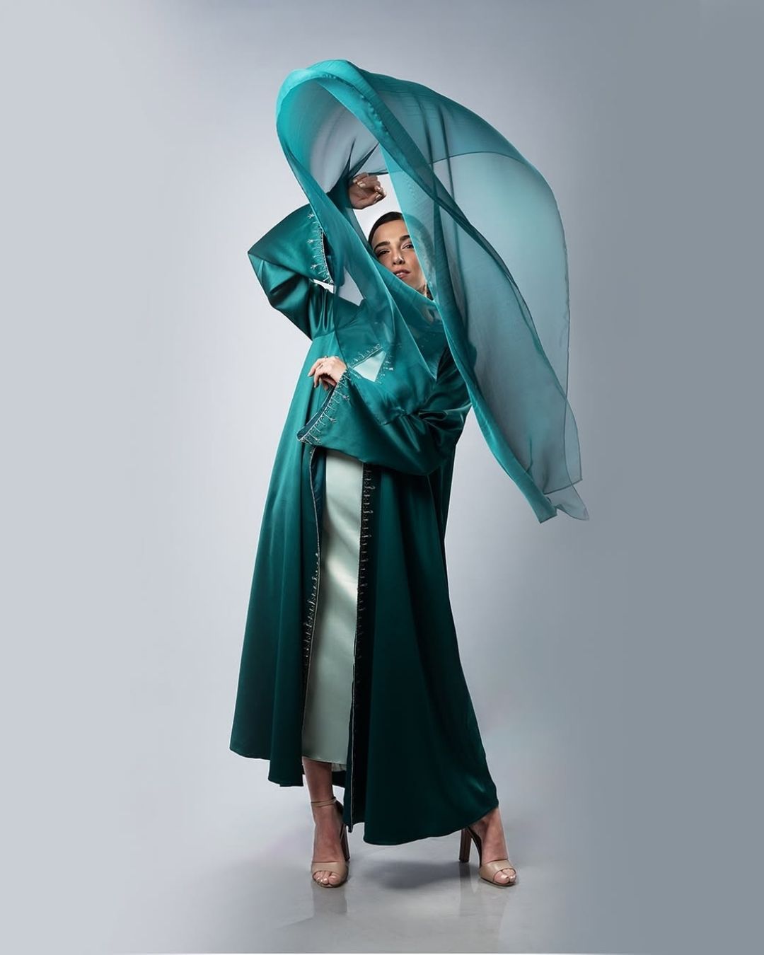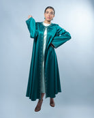 Elevate your look with this exquisite emerald green abaya, crafted from luxurious satin for a fluid, elegant drape. The design features intricate beadwork along the front opening and wide sleeves, adding a touch of refined sparkle to its timeless silhouette. Lightweight yet statement-making, this abaya offers effortless sophistication, perfect for both formal occasions and elevated everyday wear.