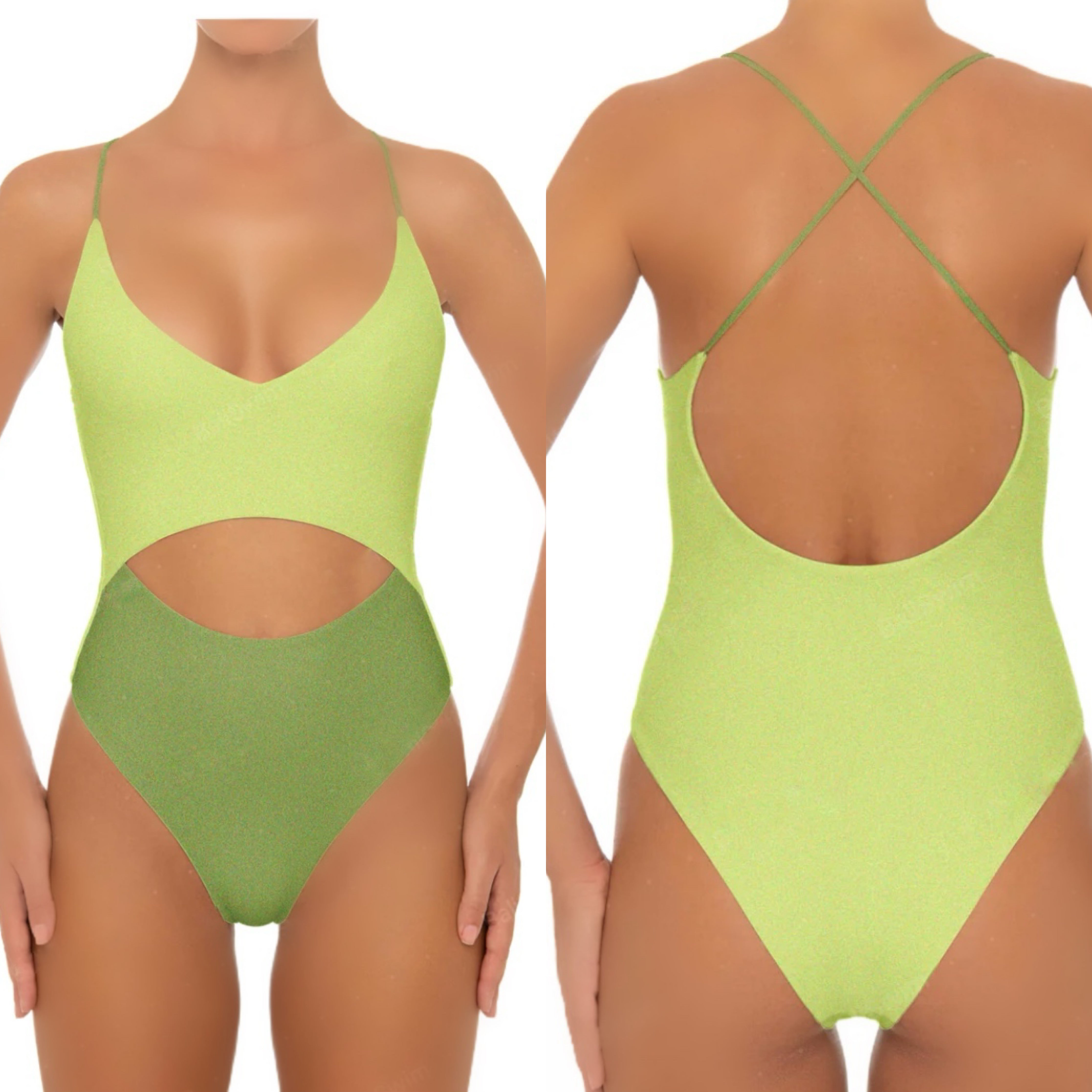 Azure Is a vibrant and modern one-piece swimsuit featuring a bold color-block design in neon yellow and green. The swimsuit showcases a flattering V-neckline and thin adjustable straps for a sleek and supportive fit. The standout feature is the cut-out detail at the waist, which adds a touch of elegance and creates an illusion of a two-piece silhouette. The high-waisted bottom provides full coverage while elongating the legs, making it perfect for a stylish and confident beach or poolside look.