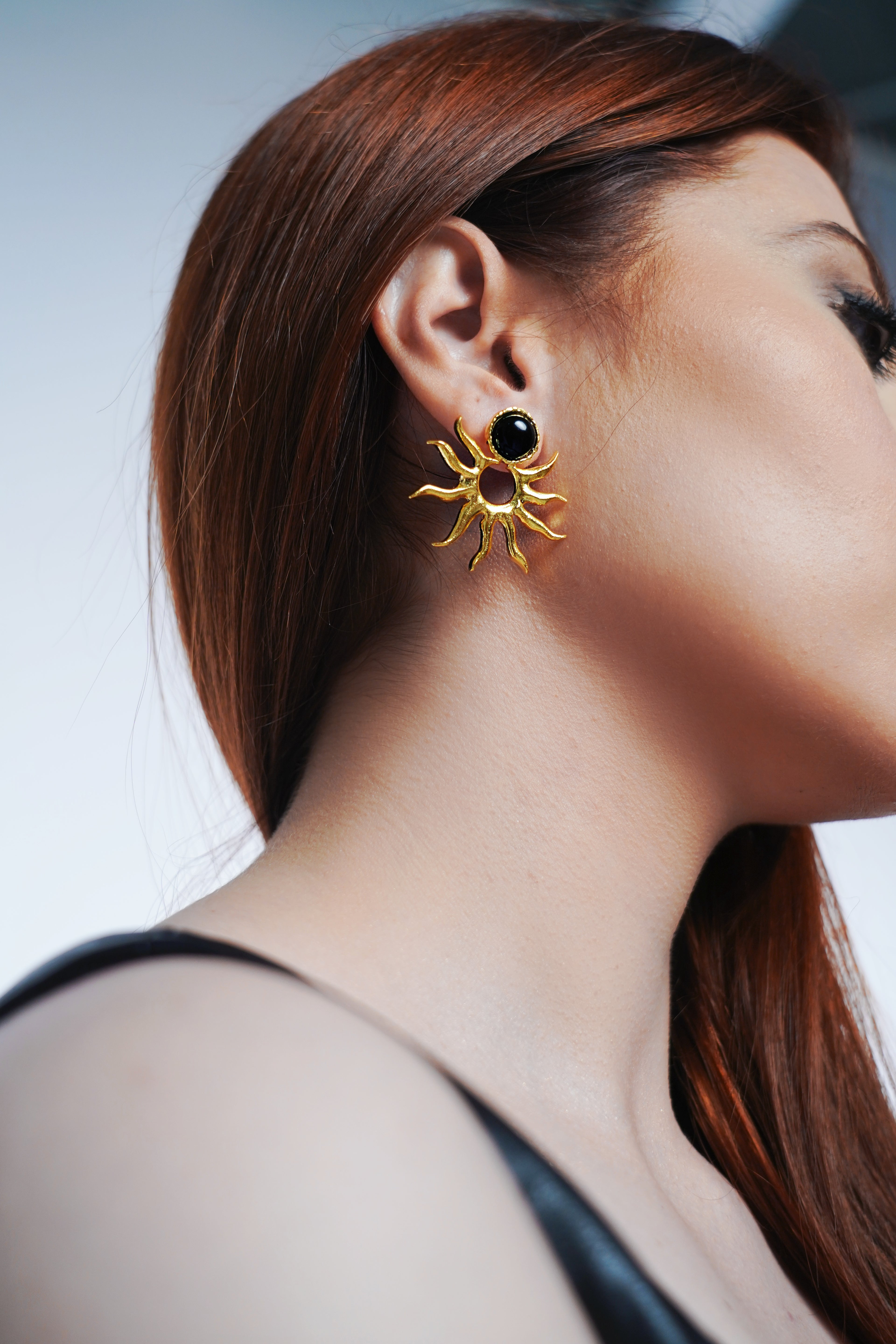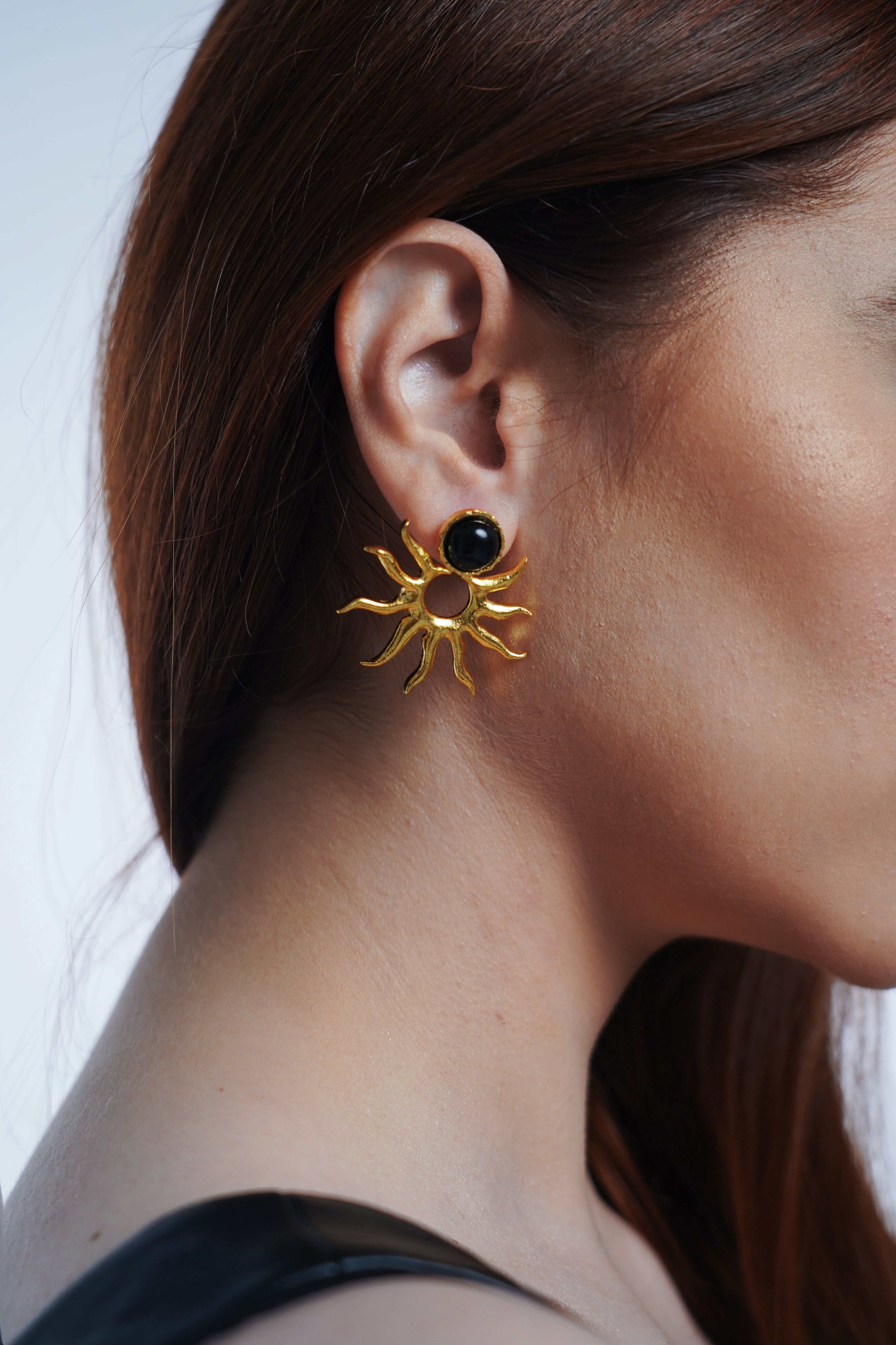 Elevate your style with our Sunburst Statement Earrings, a bold fusion of elegance and artistry. Featuring a radiant gold sun design with intricate, sculpted rays, these earrings are centered with a striking black gemstone, creating a stunning contrast.