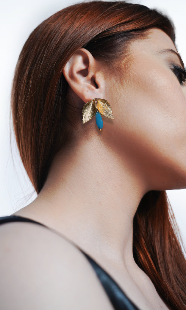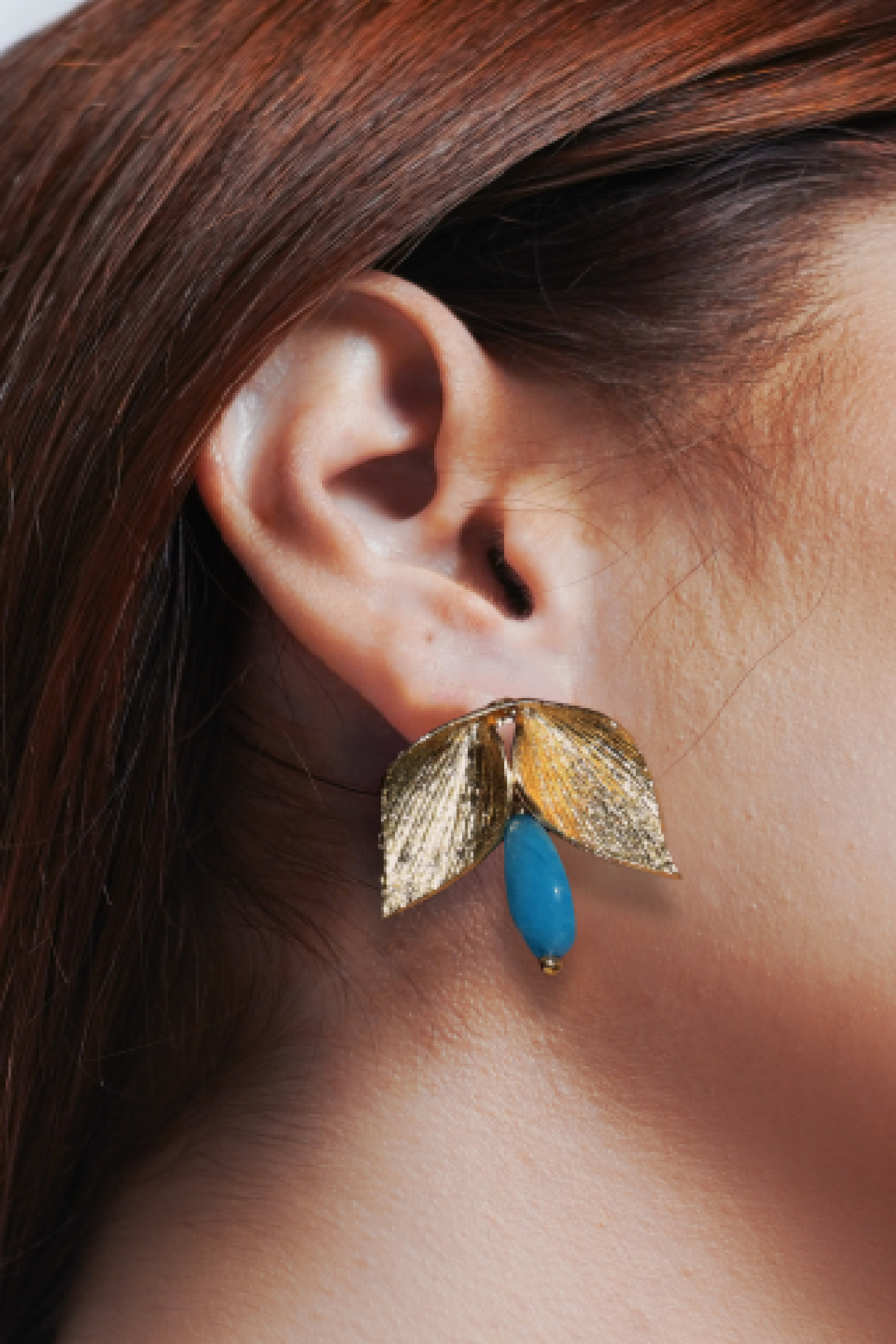 These nature–inspired earrings showcase an elegant fusion of texture and color. Featuring delicately crafted gold–toned leaves with a subtle, textured finish, each earring is accented with a vibrant blue (Fairuz) bead that adds a pop of color and a playful contrast.