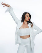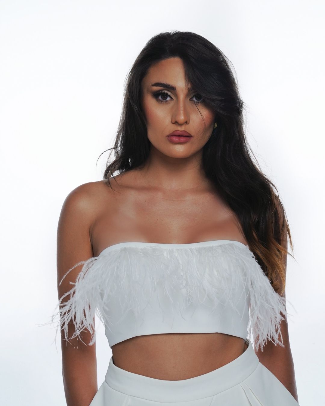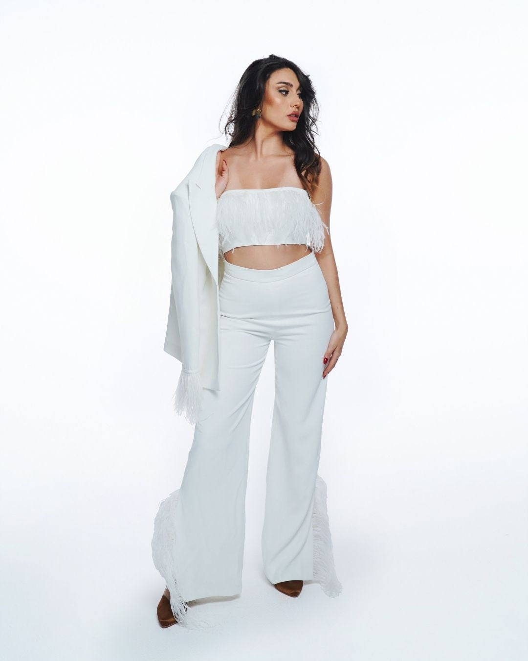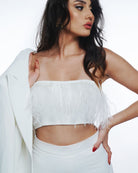 Step into elegance with our feathered white crop top, designed to add a playful touch to your ensemble. The delicate feather details create a whimsical flair, while the cropped silhouette flatters your waistline. Perfect for pairing with high–waisted pants or skirts, this top is an essential addition to your fashion–forward collection.