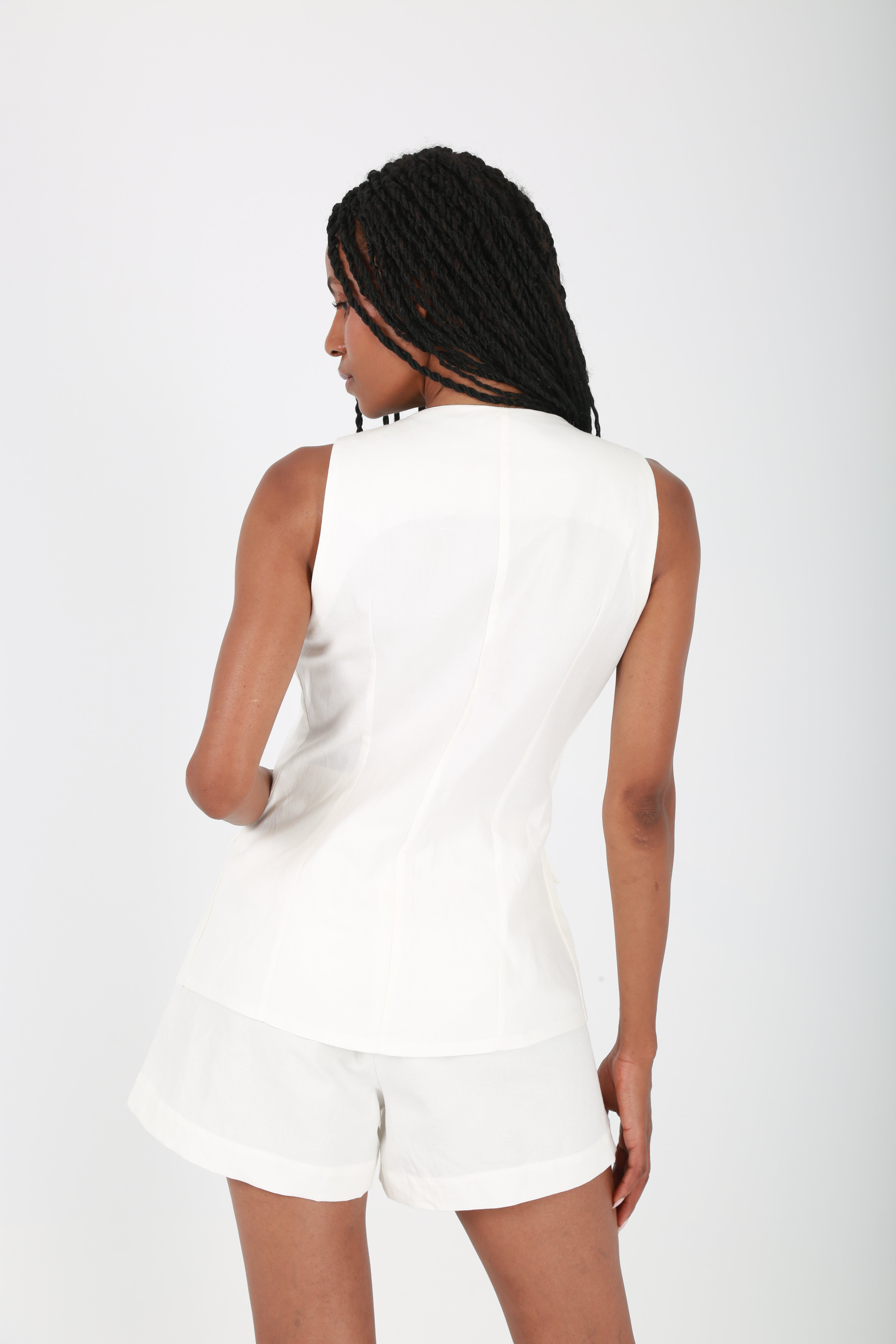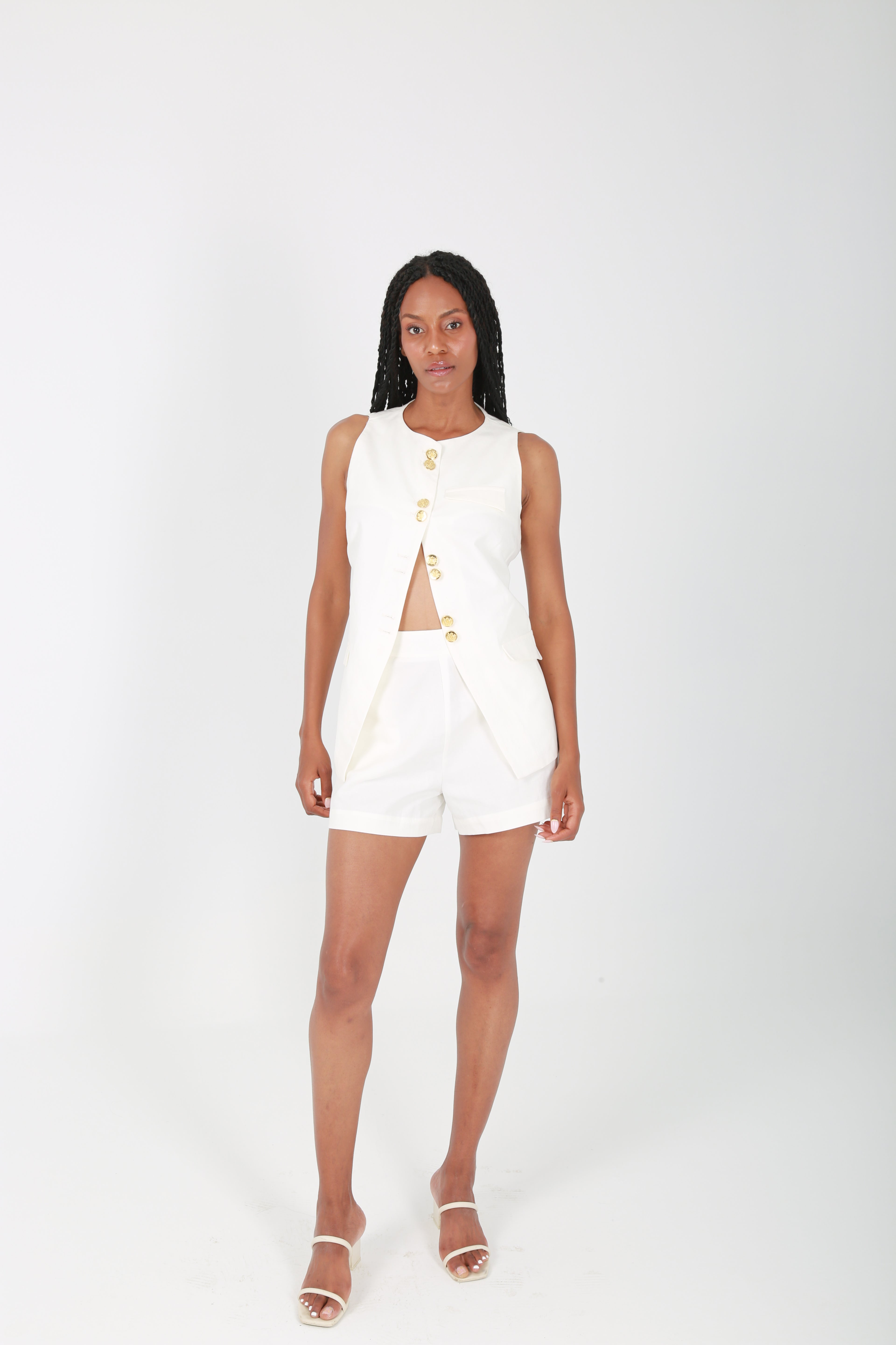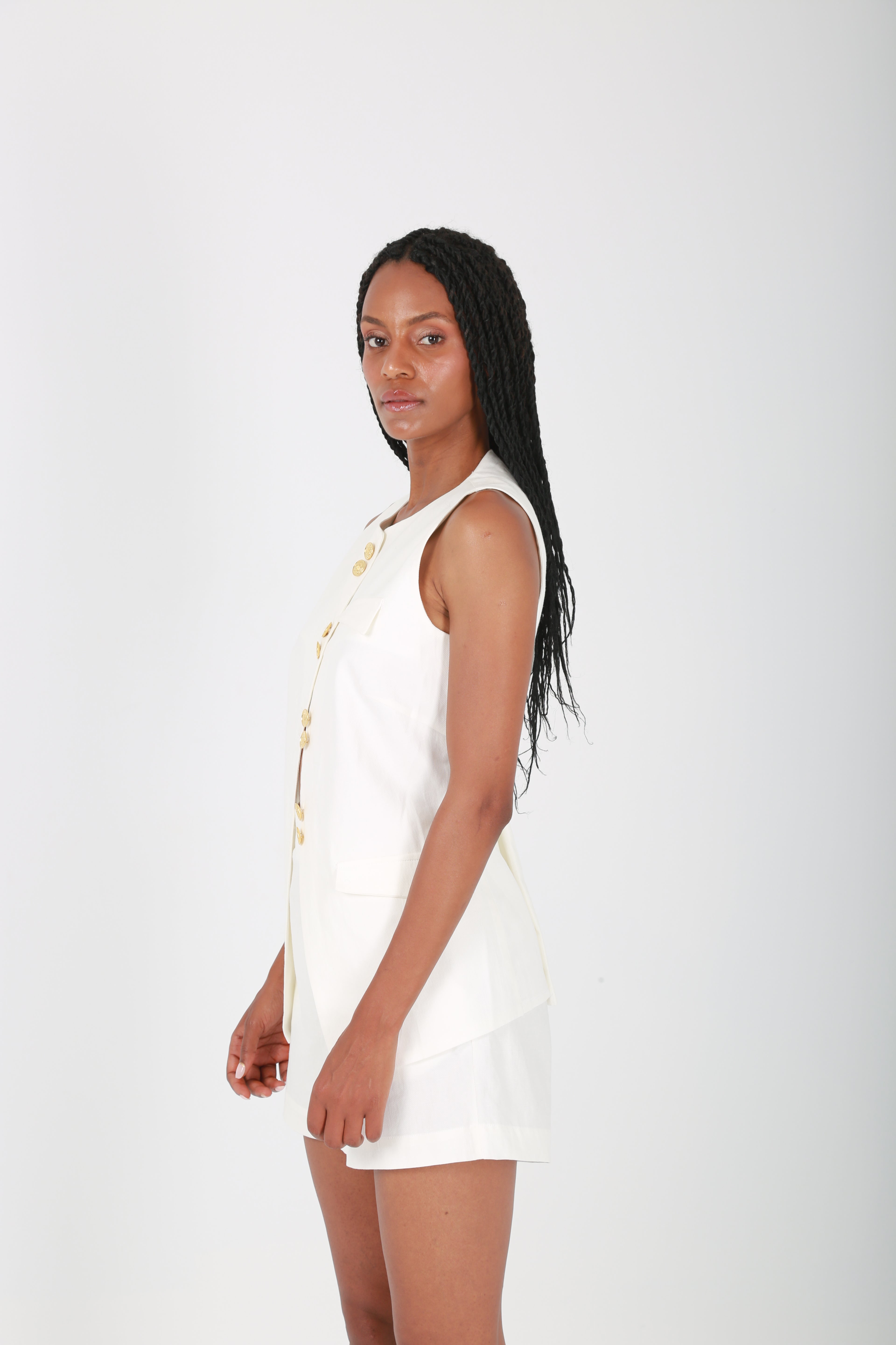 The perfect slim fit jacket, front with three illusion pockets, and 8 gold buttons. Matched with a mini short, lightweight fabric, concealed side seam–zip closure.