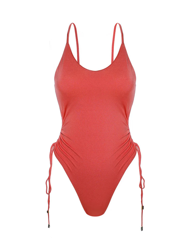 Whether you are lounging by the pool or going for a dip in the sea, the Oia swimsuit in coral evokes a glamorous and sensual look. A chic and timeless design featuring over the shoulders adjustable straps, removable pads and adjustable side ties with gold detailing that can be worn low or high rise to elongate your silhouette. The Oia swimsuit is sure to snug you and support you in all the right places whilst providing a glamorous shaping effect.