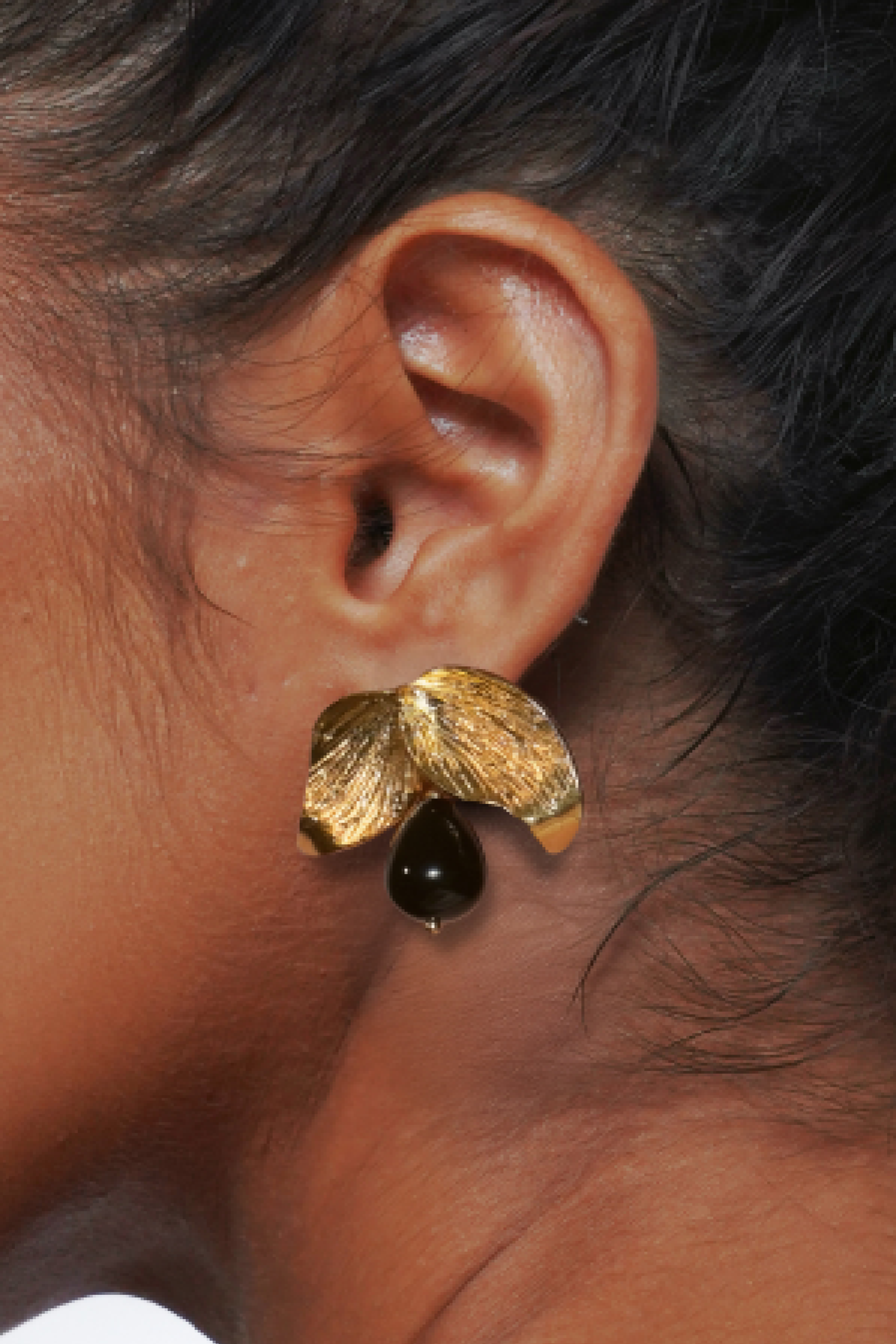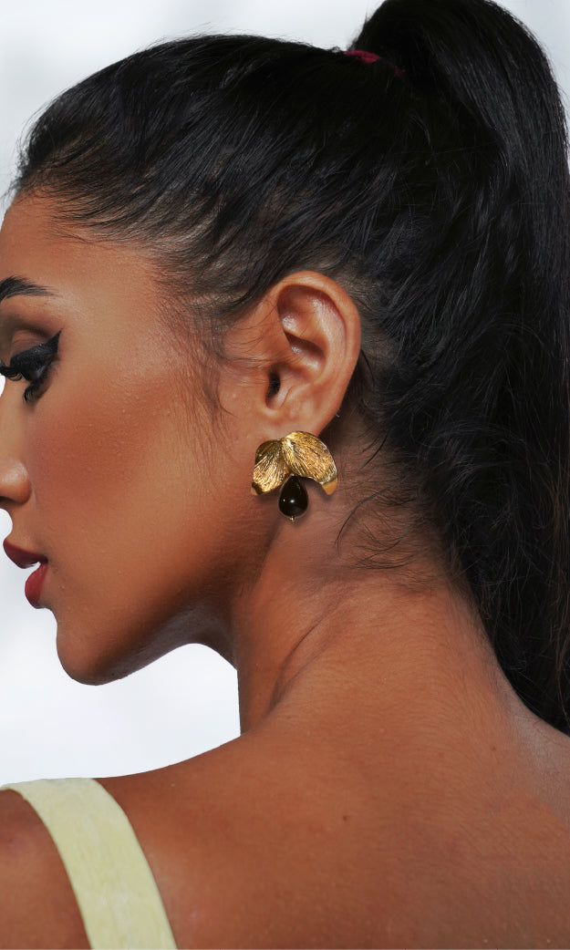 Elegant and eye–catching, these statement earrings feature a beautiful blend of gold–toned petals with a glossy black center, inspired by nature's charm. Each earring is crafted to resemble a delicate blooming flower, with intricately textured petals that catch the light, adding a touch of luxury to any outfit.