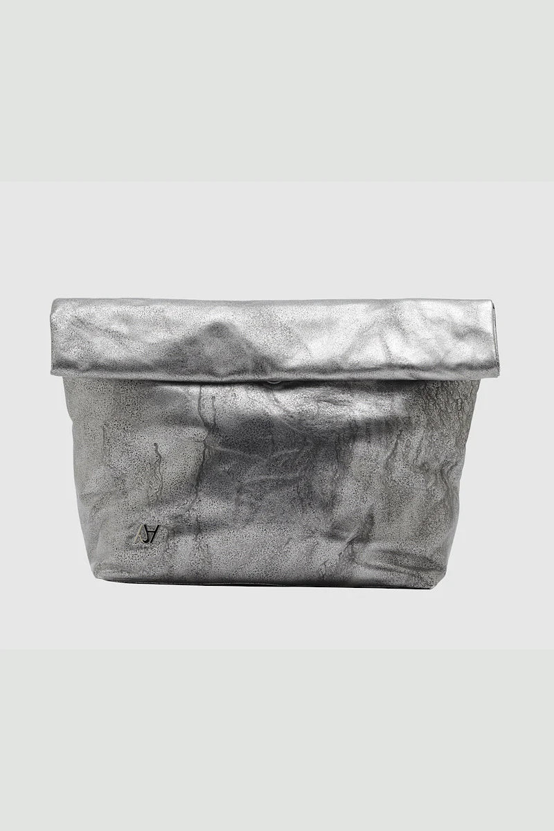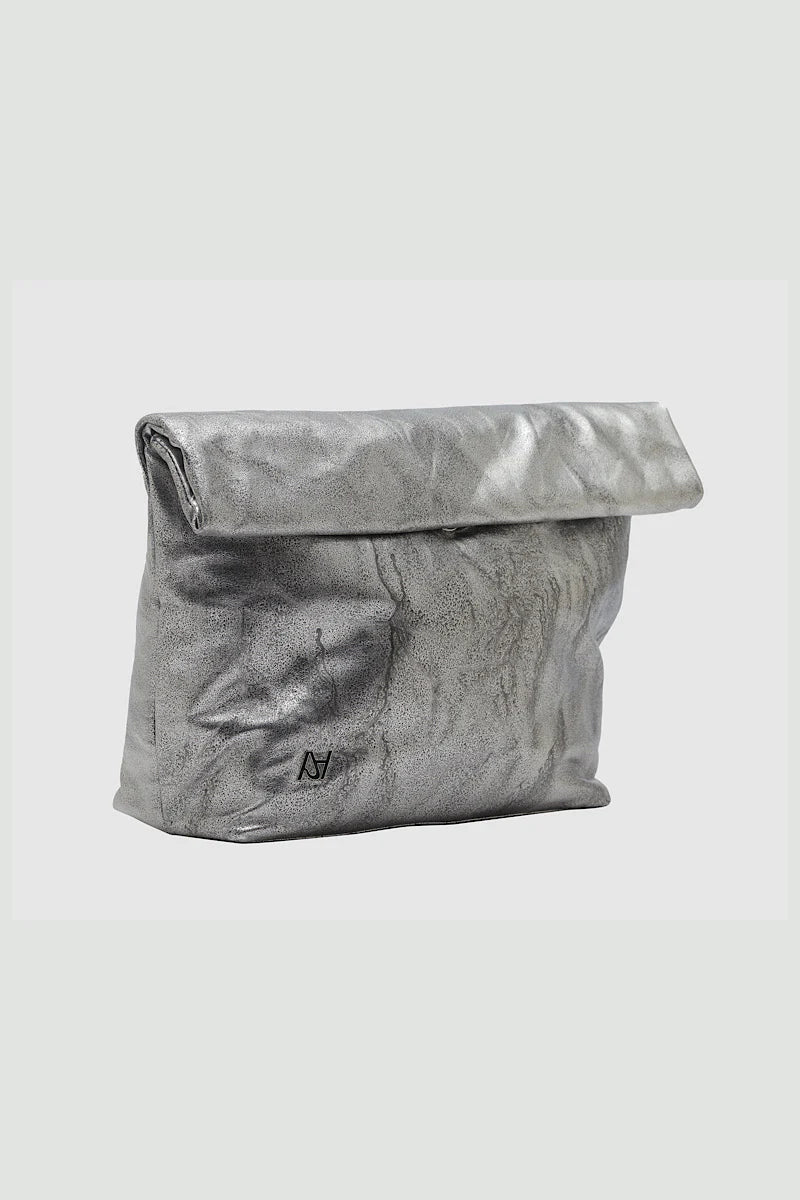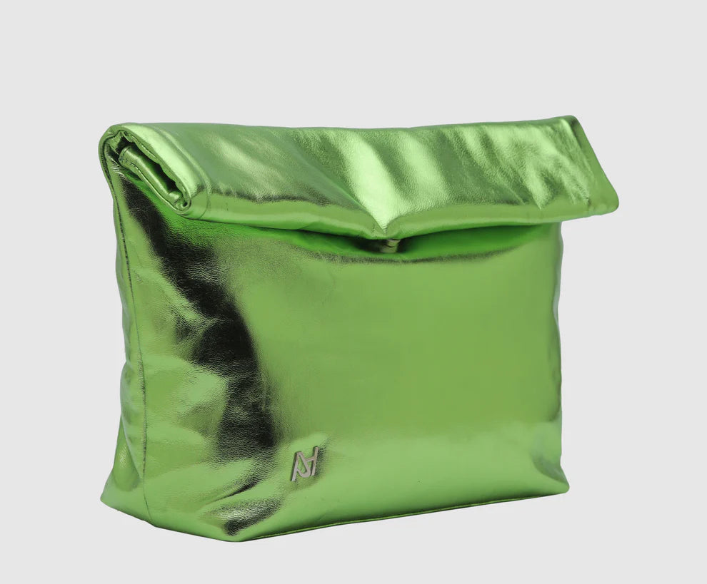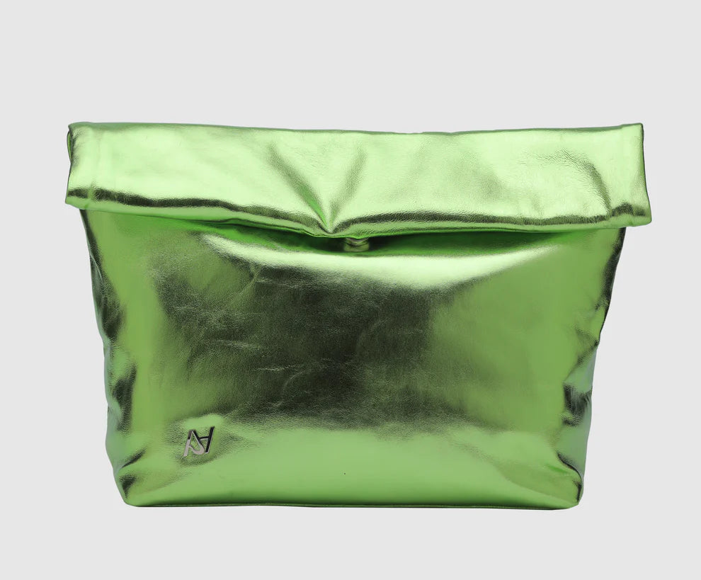 Metallic leather clutch with inside pockets and snap button closure. Available in washed silver, electric green, gold and copper.